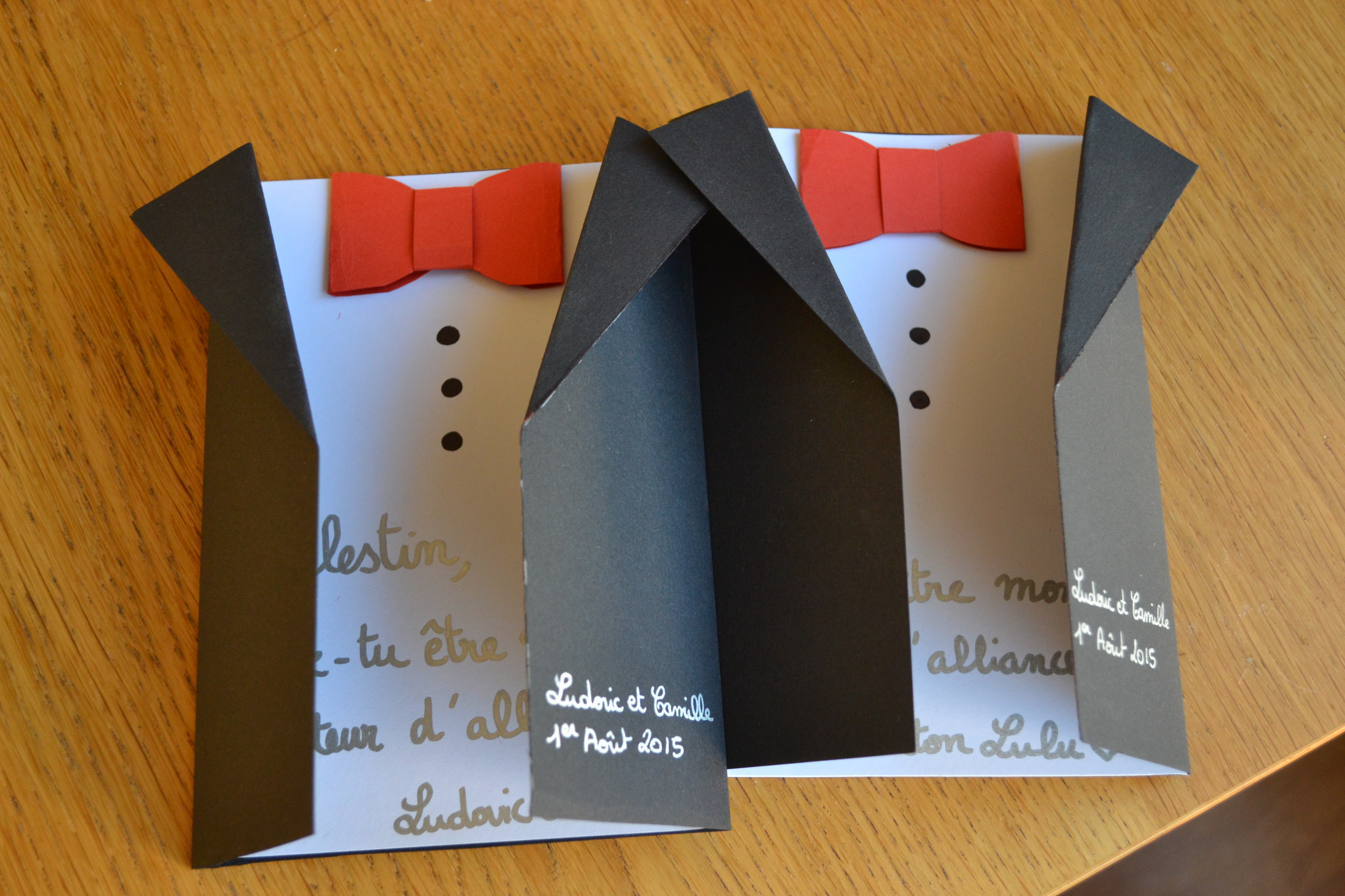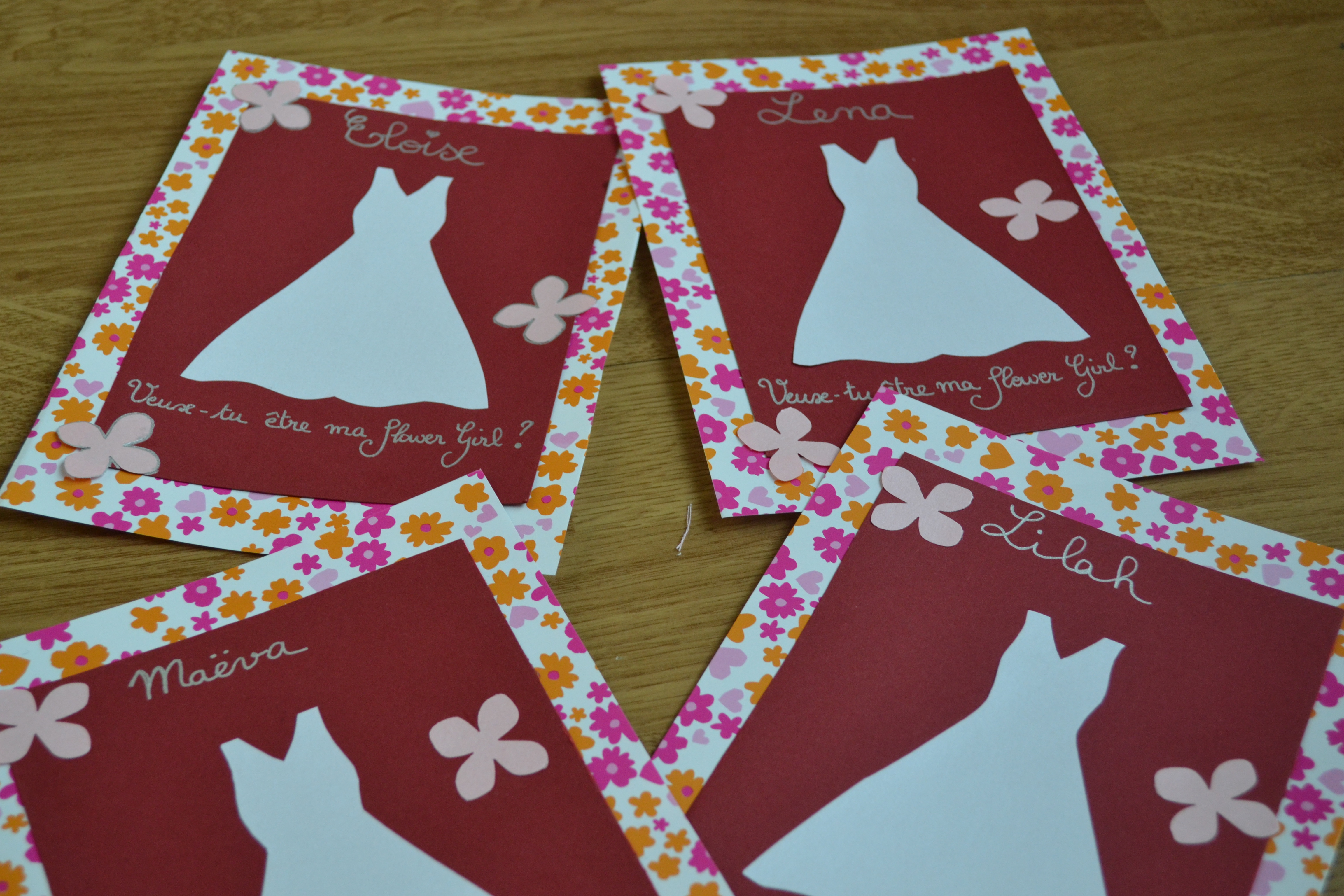 Je souhaite que tout le monde se sente impliqué dans l’organisation du mariage, et les enfants aussi. Voici les cartes que j’ai envoyé par la poste à mes flower girls et mes petits porteurs d’alliance pour leur demander s’ils voulaient bien le faire. Ce n’est pas grand chose, un peu de découpage et de collage, et les enfants étaient ravis de recevoir du courrier à leurs noms. Biensûr l’inspiration m’est venue de Pinterest, LE site pour les bonnes idées !