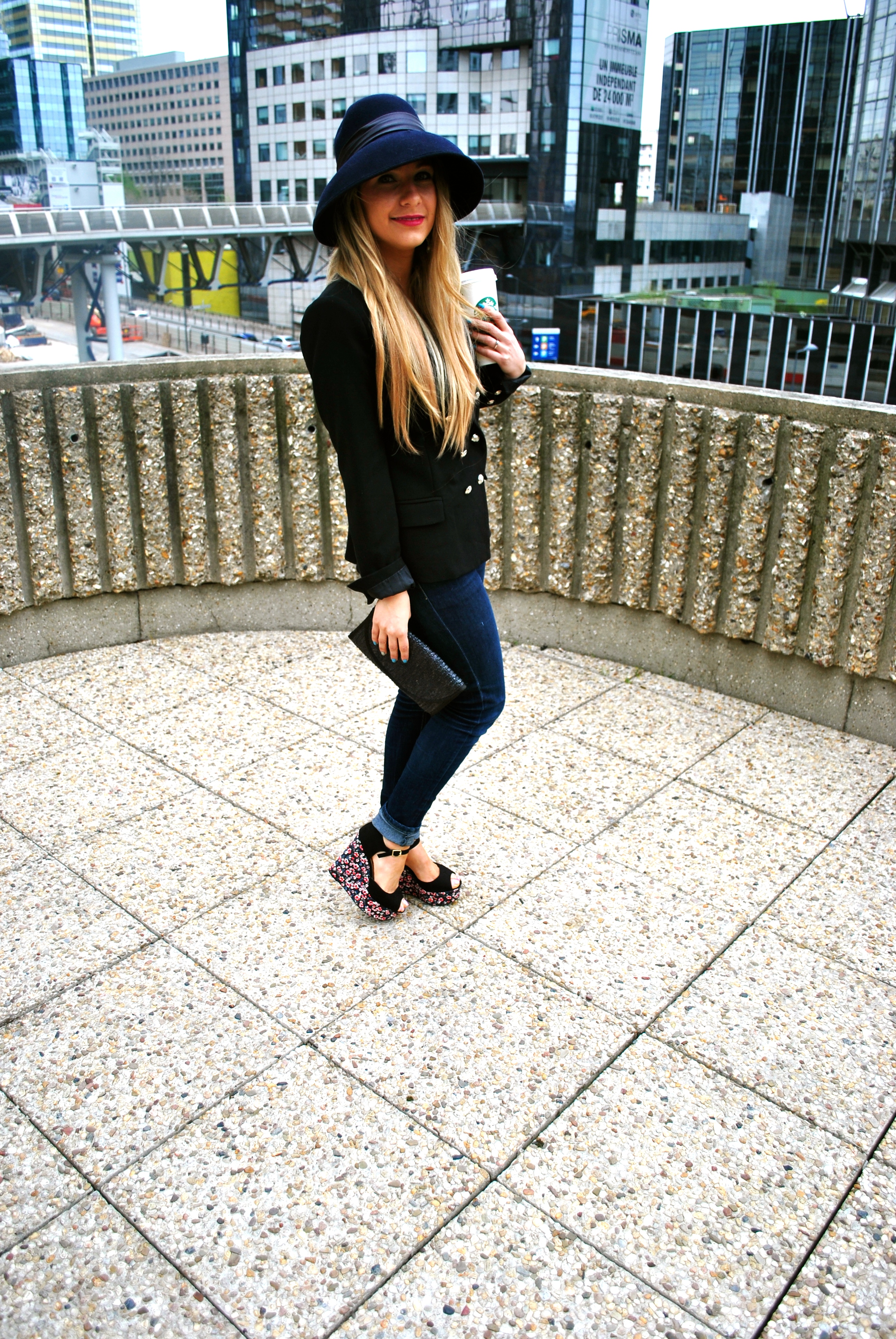 Big blue hat, for the possible rain and wind, jeans for confort, these jeans are from Taiwan, I bought them there when I was doing my semester in Taipei, there are the best ever, so soft and easy to wear ! A little black jacket and liberty platform shoes for the fun.