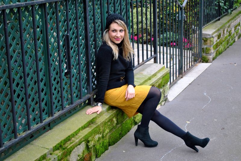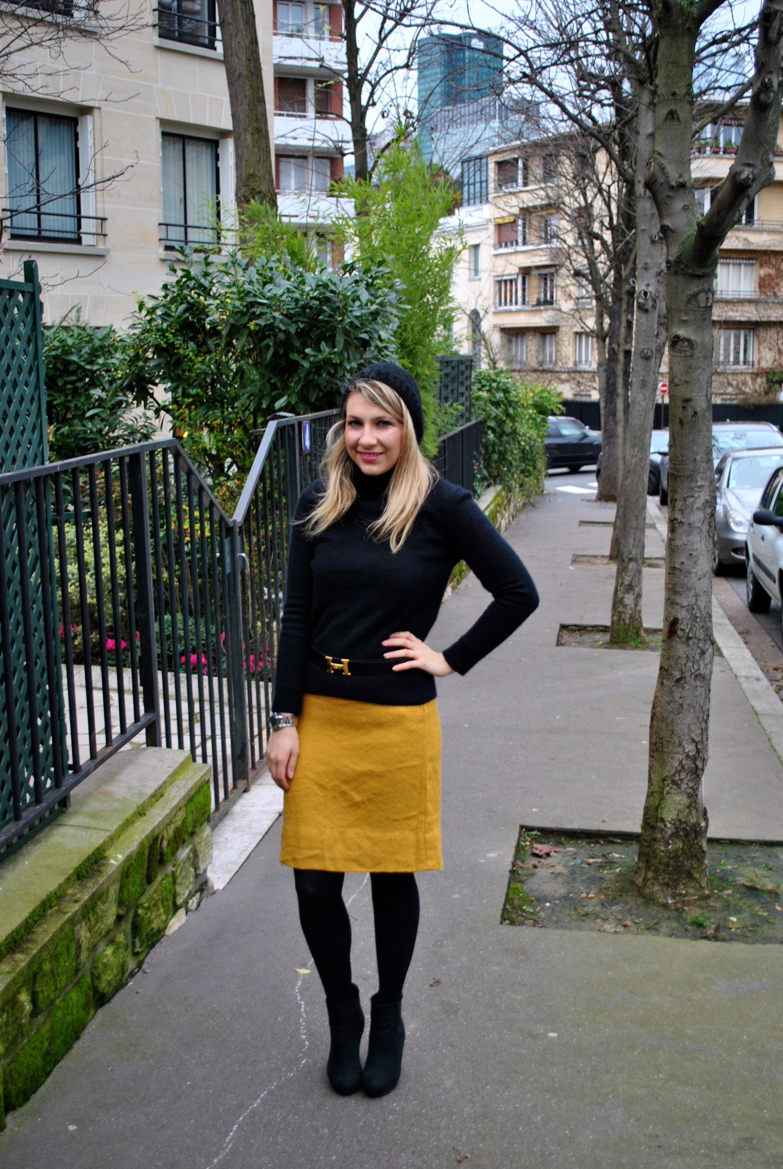 Today’s outfit is about this yellow mustard skirt I found at the thrift shop, I mixed it with a black cashmere sweater and my Hermès belt to add some chic to it.