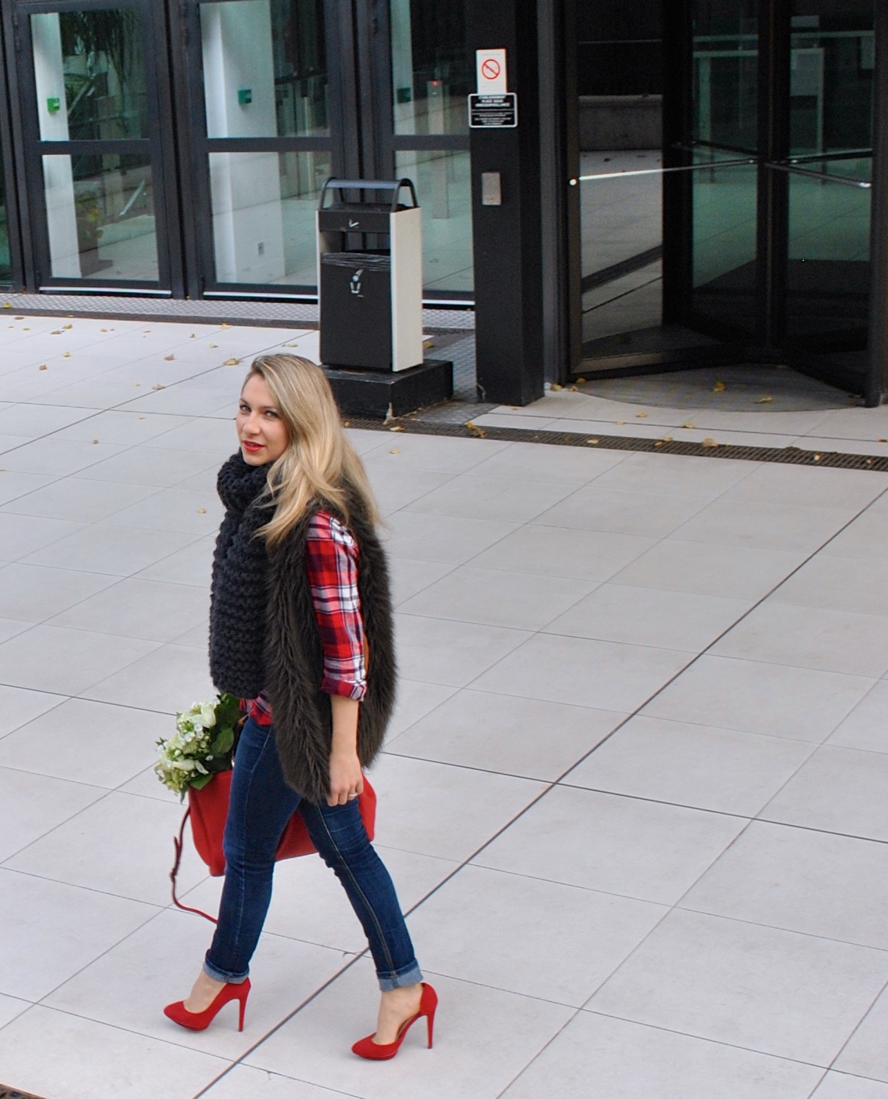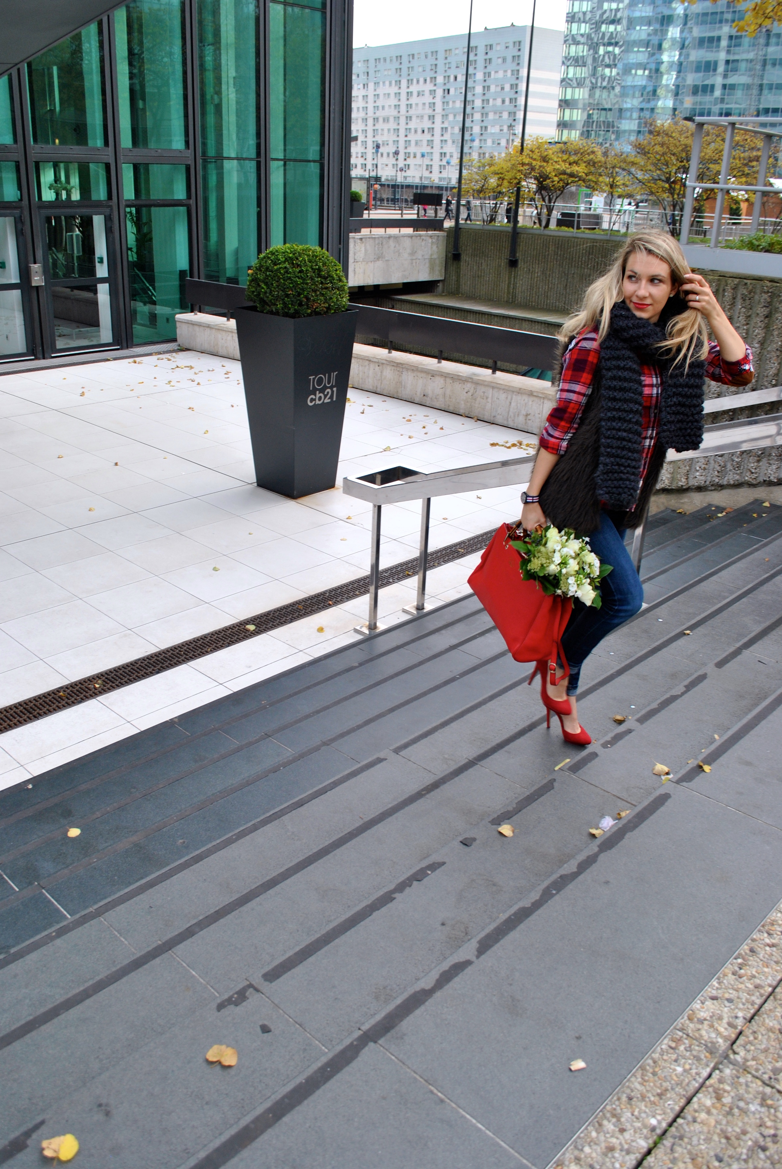 I treat myself often with flowers because I want to enjoy it when I’m still alive, this is something I say to my fiancé, I know if I die he will put flowers on my grave, but I always tell him to buy them now so I can enjoy them. This is why you can see me with flowers on the pictures, I enjoy them and they always look cute on the photos.The vest is a DIY I made a few years ago when it was really trendy to have it, and the scarf is also handmade, I knitted them in front of TV and the needles where so big, after one movie I had a big chunky scarf for the next morning 🙂 this is how I enjoy knitting !