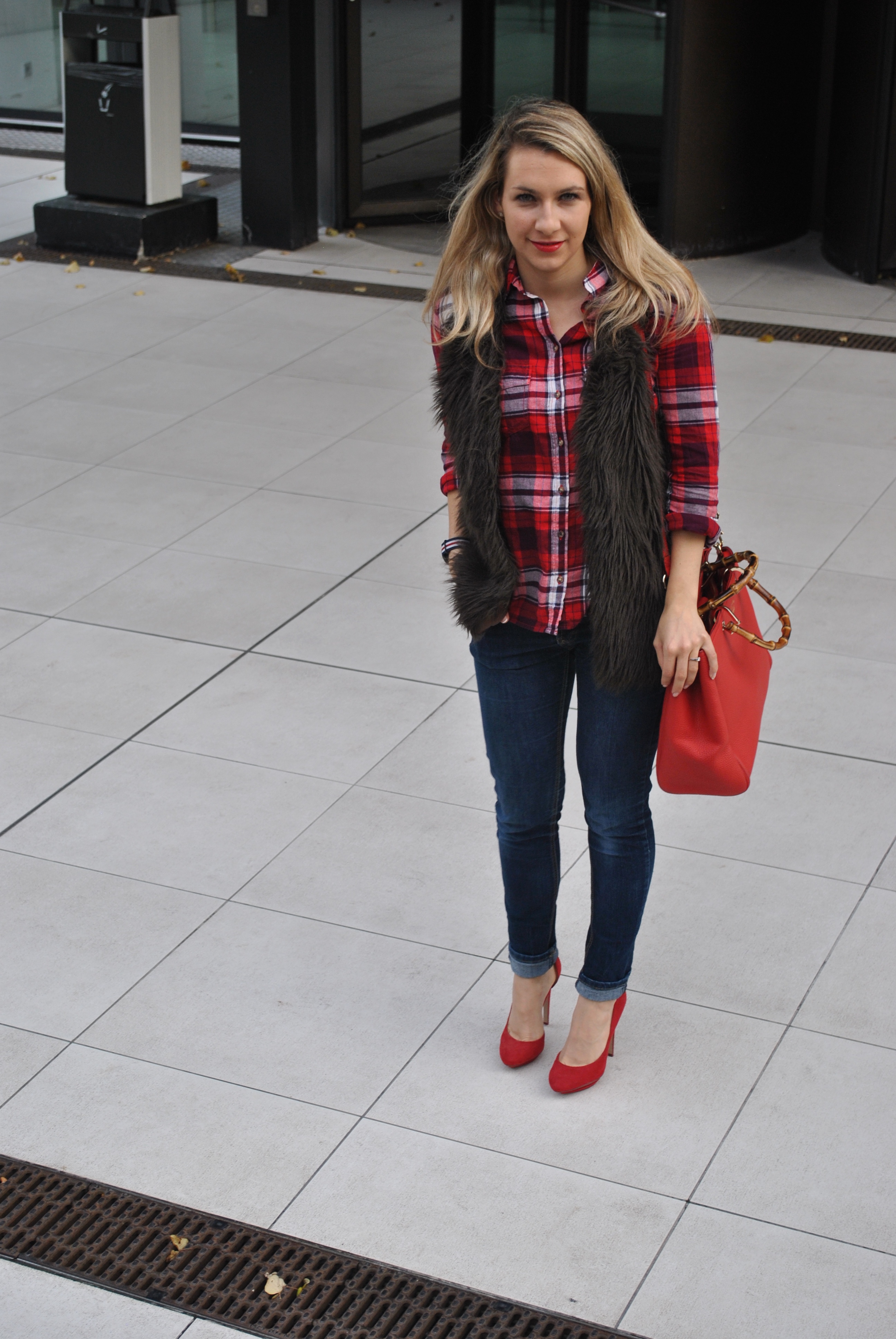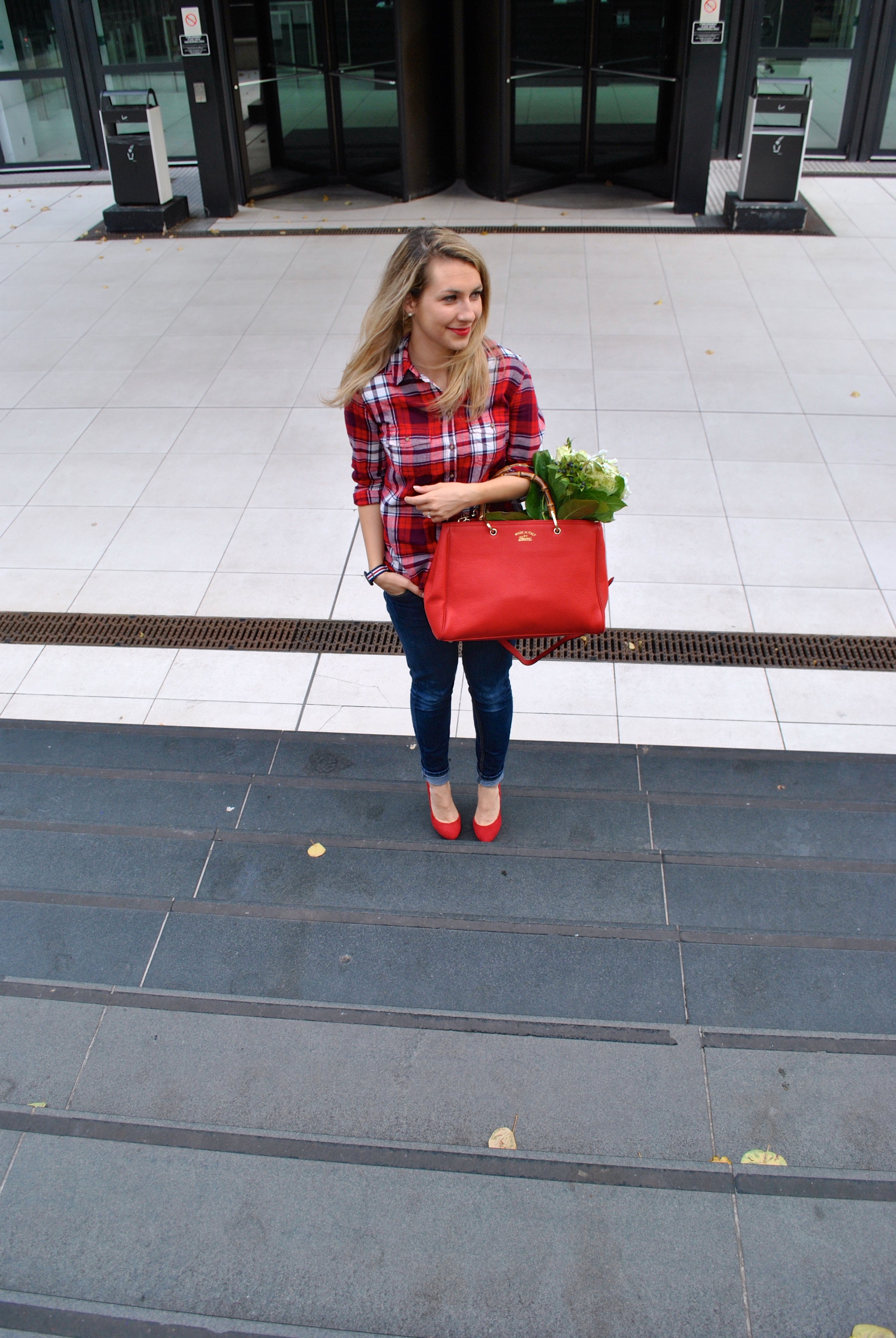 Pour aller avec j’ai trouvé ce chemisier de bucheron chez H&M qui va parfaitement avec le sac. Mon vieux jeans trouvé à Taiwan, et les escarpins rouges de notre séance photo, qui sont pas abimées du tout ( parce qu’ils sont tellement hauts et inconfortables ! ah ah, ils ne sortent que pour les occasions spéciales où je sais que je ne vais pas marché beaucoup !) J’aime les fleurs, mon fiancé trouve cela inutile et cher ( ces hommes …) mais je lui dis que je préfère qu’il m’achète des fleurs maintenant plutôt que de les acheter quand je serai morte … ( pensée très gaie !)