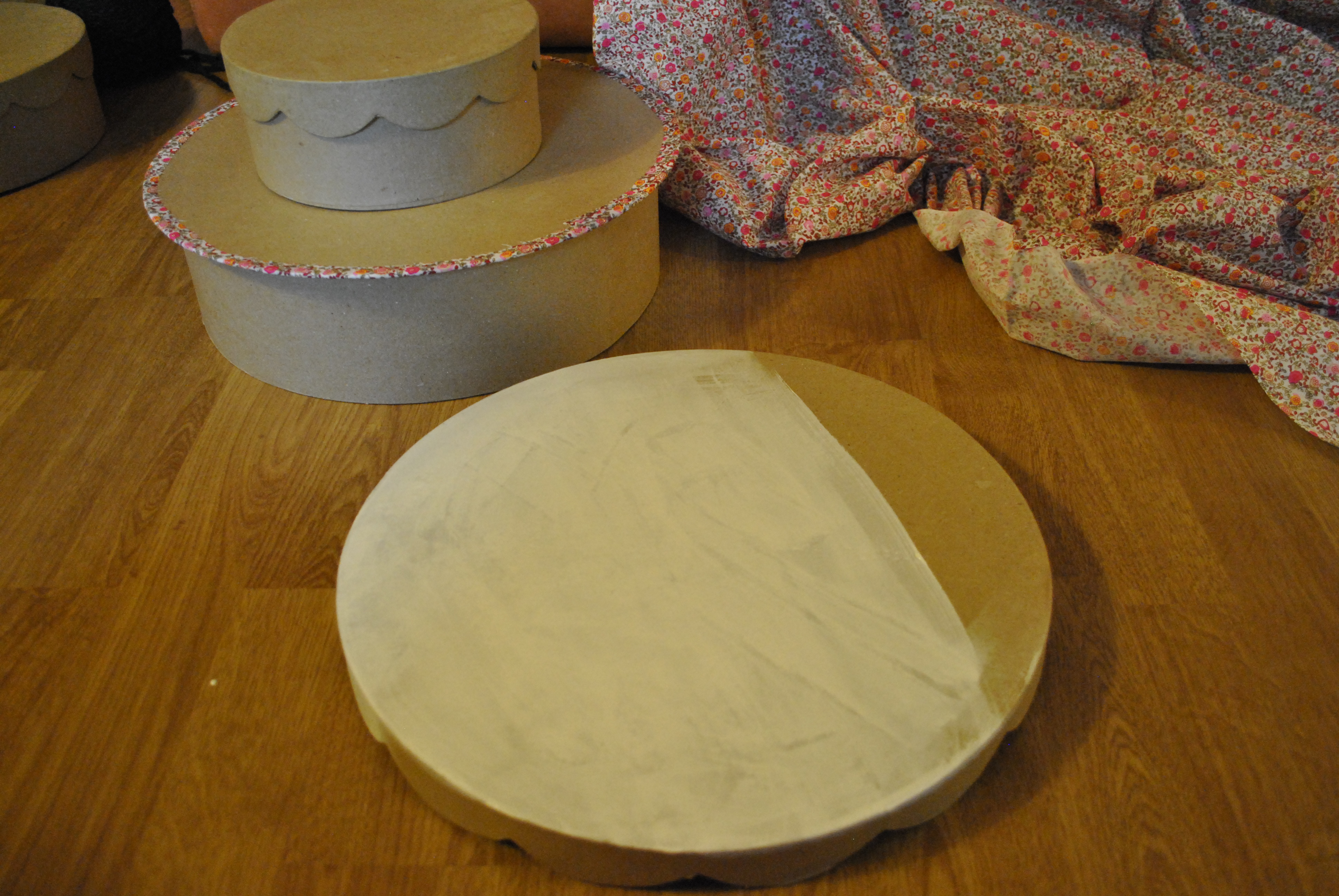 J’ai mis une première bande de tissus assez fine pour le rebord du bas de la boite, et puis une grosse bande de tissus un peu plus large pour quelle se replie sur l’intérieur pour le tour. J’ai peint les couvercles ondulés en blanc pour faire comme un gâteau à la crème liberty. Je pense rajouté un noeud comme les noeuds papillons que j’ai déjà fait. J’ai aussi préparé des coussins super faciles pour la cérémonie, pour les mamies/ les papis qui trouveraient leurs chaises trop dures, et pour le soir, je prévois un endroit un peu lounge sur un canapé où les gens peuvent faire une pause après avoir brûlé des calories sur le dance floor !
