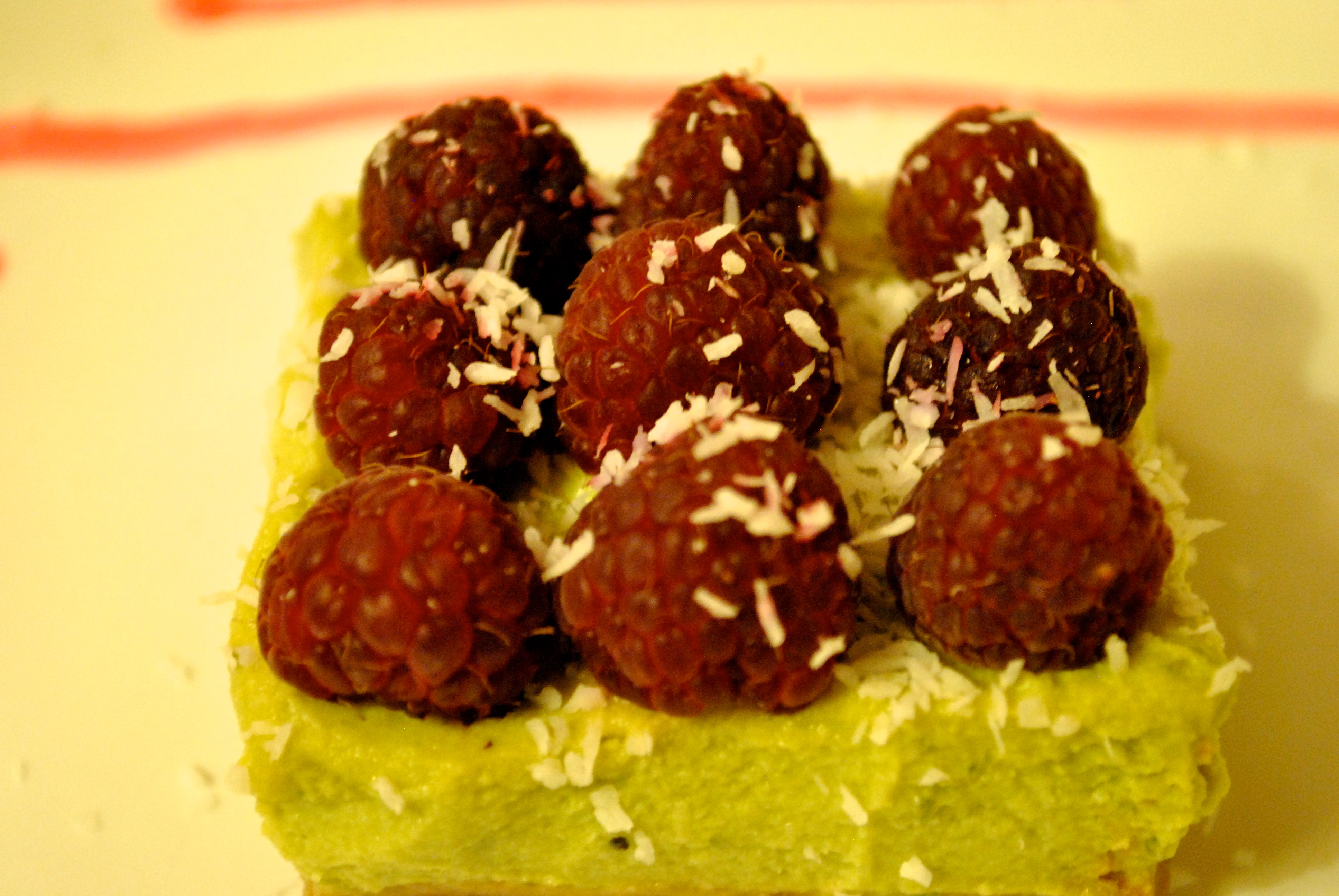 - You can put the whole raspberries or mash is with some agave syrup if you want to be sweeter. Put it over the avocado and sprinkle with some coconut, you’re done !