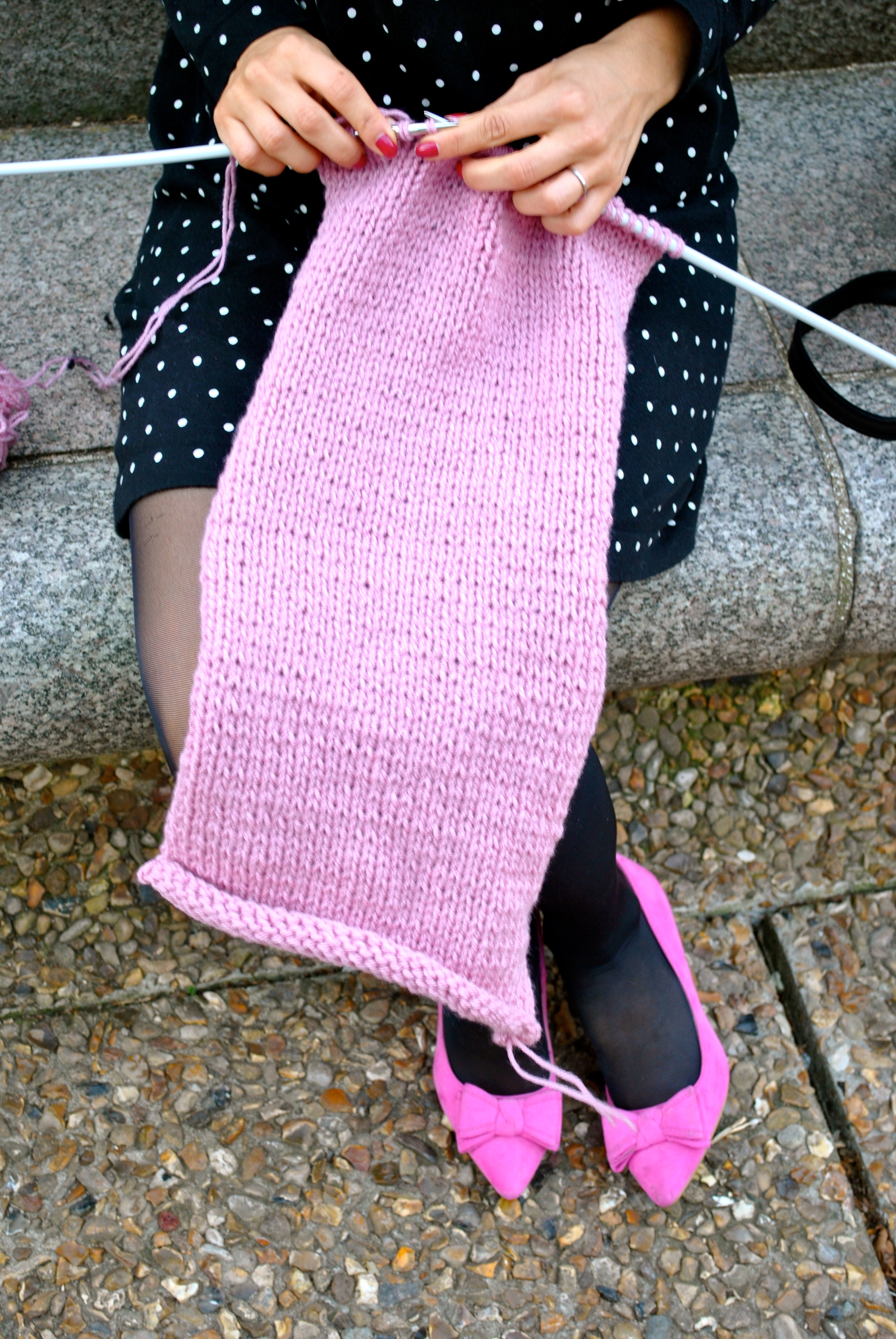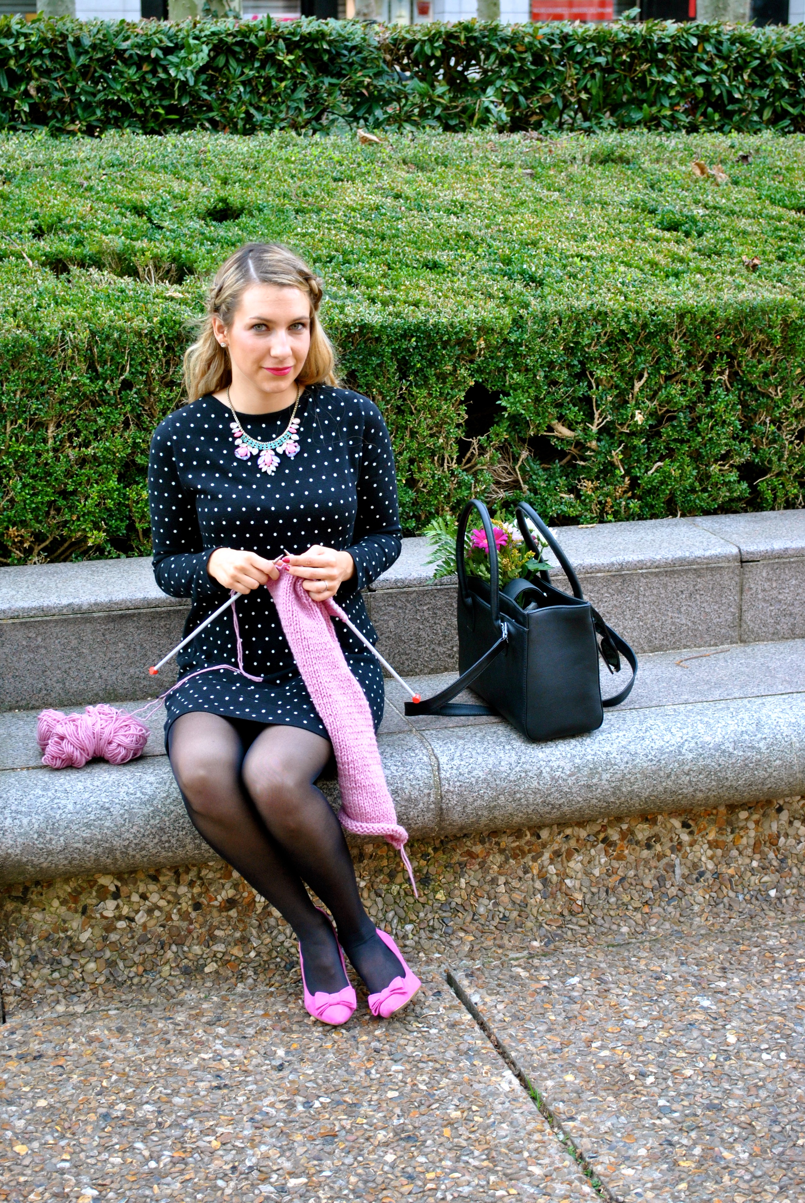 It’s one of my favorite spot to take pictures I always want to go there but I guess it would make the pictures boring and not flattering the outfits with all these colors. This outfit is my typical outfit for work, a casual but chic dress with a pop of color, and as always, there are knittings needles popping out of my bag, because I can’t stop myself from knitting is the metro, on my way to the office. This pink knit is a baby pillow to match the baby blanket I already finished. I bought the yarn from a lady who didn’t have time to knit anymore, she had 30 yarn balls of this color, so I’m have enough to knit pink for a long time !