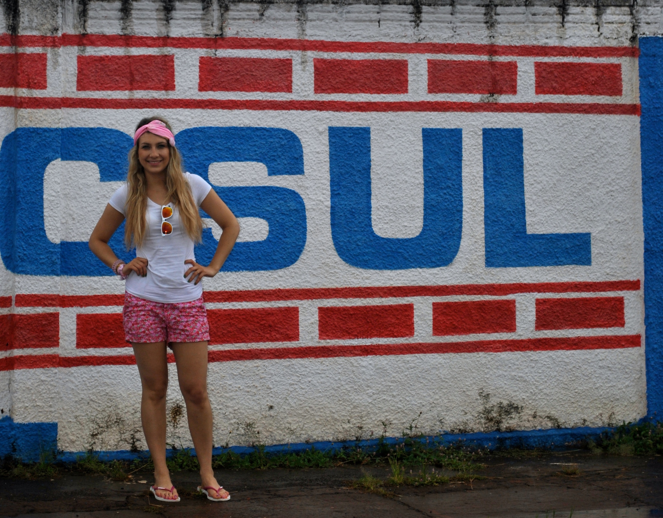 There were also those awesome hand painted walls around town with advertising on it and it looks so different so rustic from what we have in France so I wanted to take a picture in front of it. Unfortunately it rained a lot ( as you can see from the water ruining near my feet) so I had to leave my nice spot ! The shorts and shirt are from H&M, the scarf is an old scarf my grandma made for my mom.
