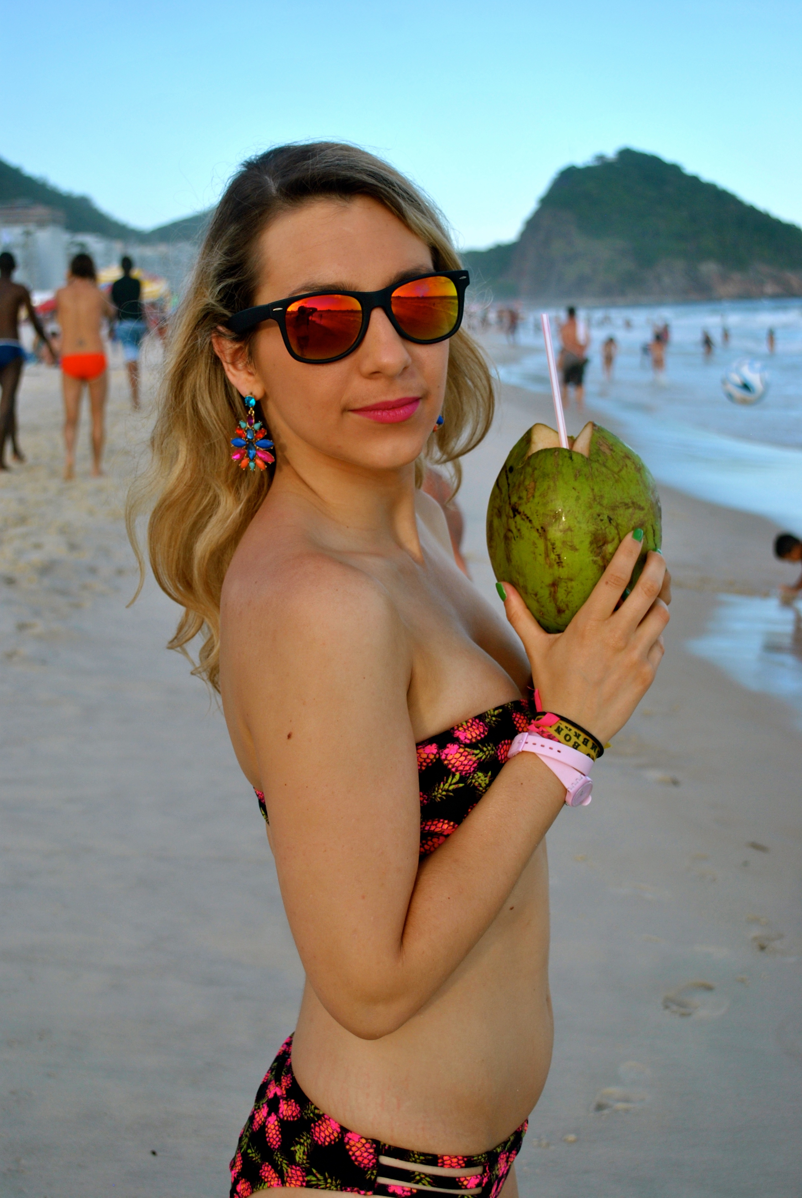 Je n’ai pas pu m’empêcher de prendre une noix de coco fraiche. Mon maillot de bain vient d’Asos, et les lunettes de Mango. Il a été très difficile de trouver un maillot de bain en plein mois de Février, et j’ai eu de la chance qu’il m’aille parfaitement. Il était soldé et ce motif ananas rose m’a tout de suite plu. Les Havaianas sont une institution au Brésil, j’en ai acheté deux paires, elles attendent sagement le retour de l’été dans mon placard…