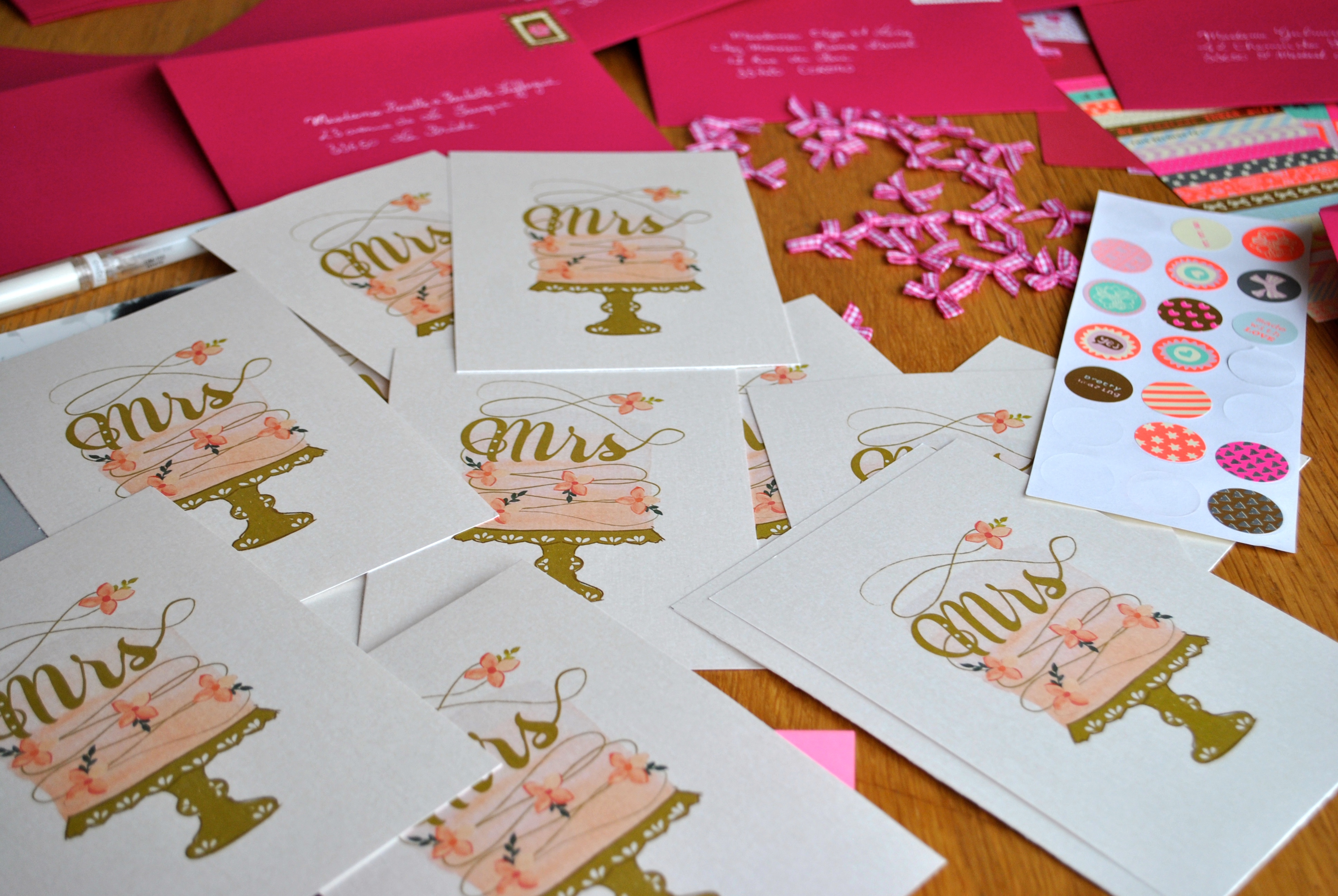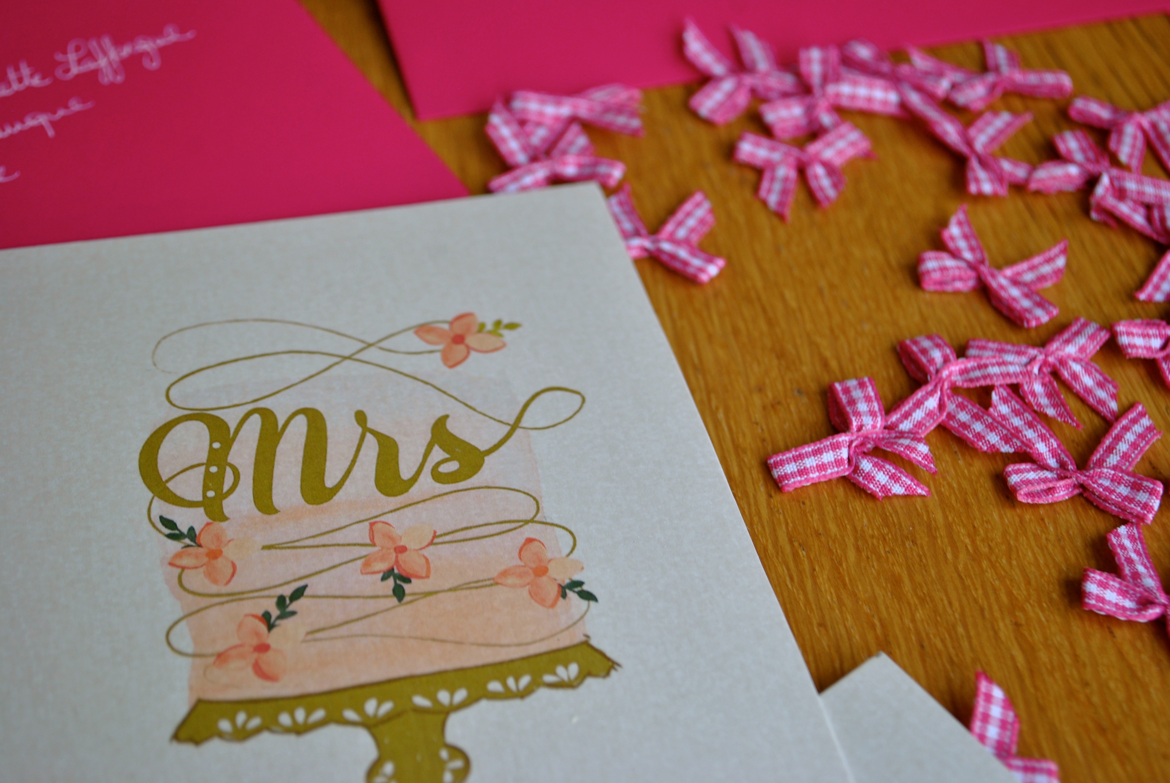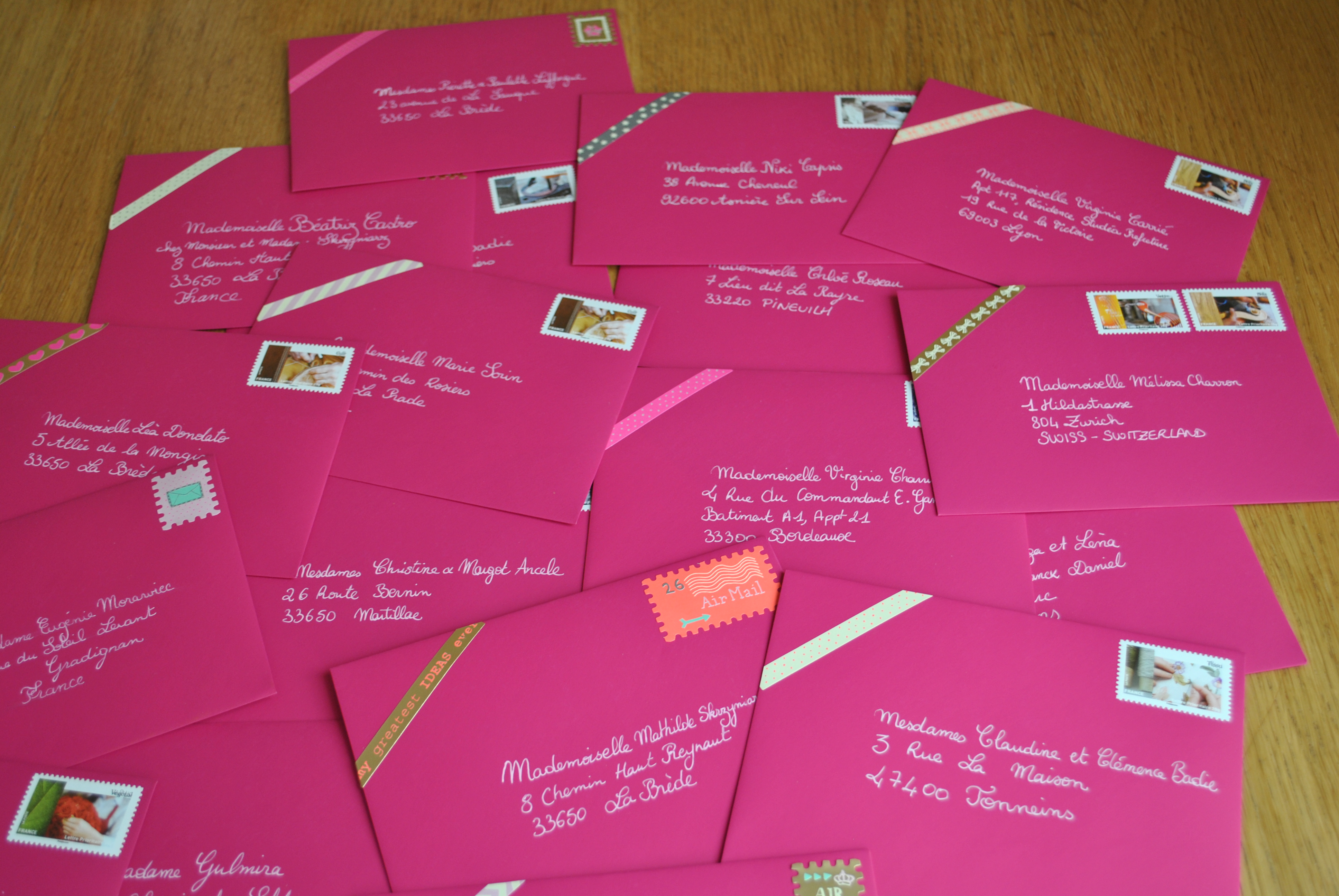 Du beau monde qui va bien profiter des bons gâteaux et du thé ! J’ai prévu quelques animations (mais ça je vous le montrerai pour plus tard !)Pour faire ces invitations j’ai utilisé des enveloppes roses ( biensûr) de l’Art du Papier. Et une illutration trouvée sur internet pour le « Mrs », des stickers de chez Hema pour décorer le tout.