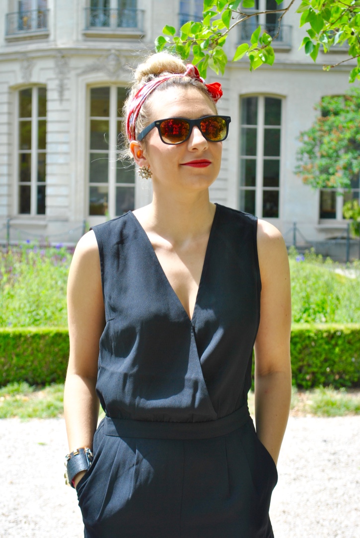 It’s super versatile and very comfortable to wear, I feel like a baby in his onesie in it. To accentuate the vintage look I put this red scarf-headband that I have since I’m a little girl ( it might be my first scarf !), red lips and mirrors shades for a chic touch. We went to eat Falafel in the Rue des Rosiers that day with my sister, I never have falafel before coming to Paris and it’s one of my favorite food now, perfect for a quick diner with my friends.