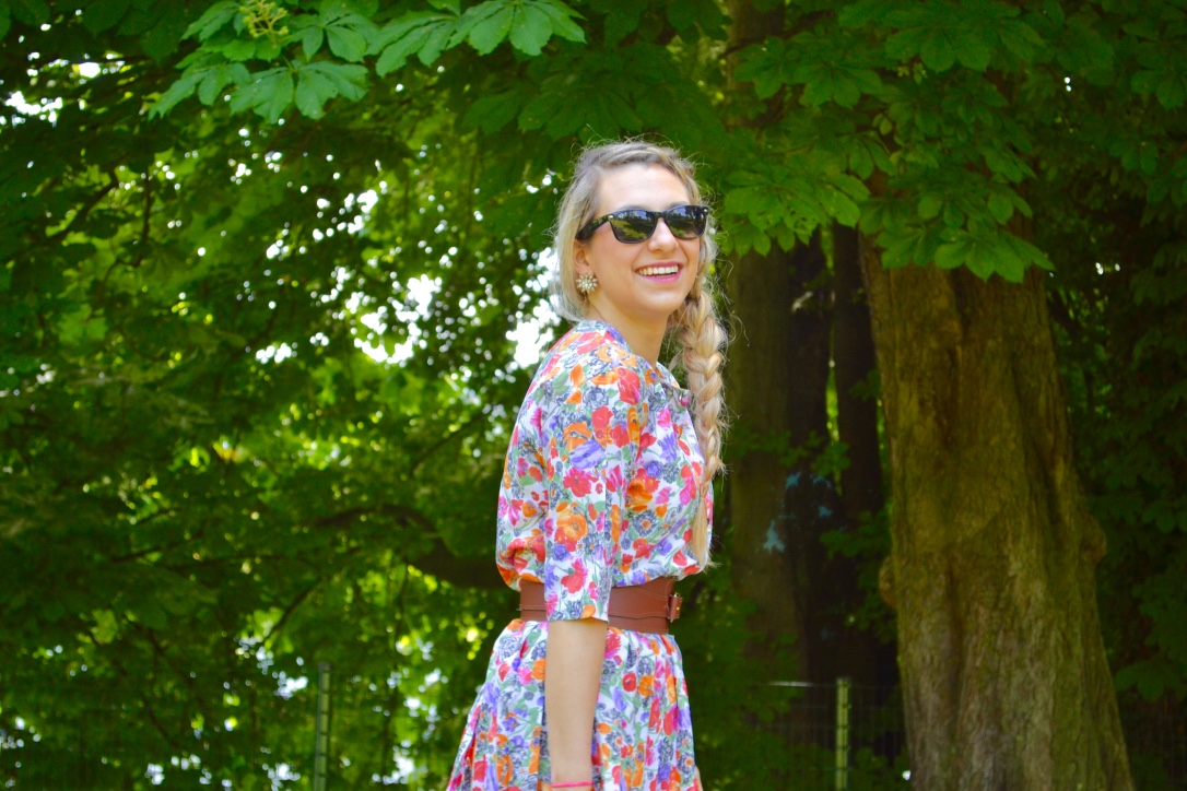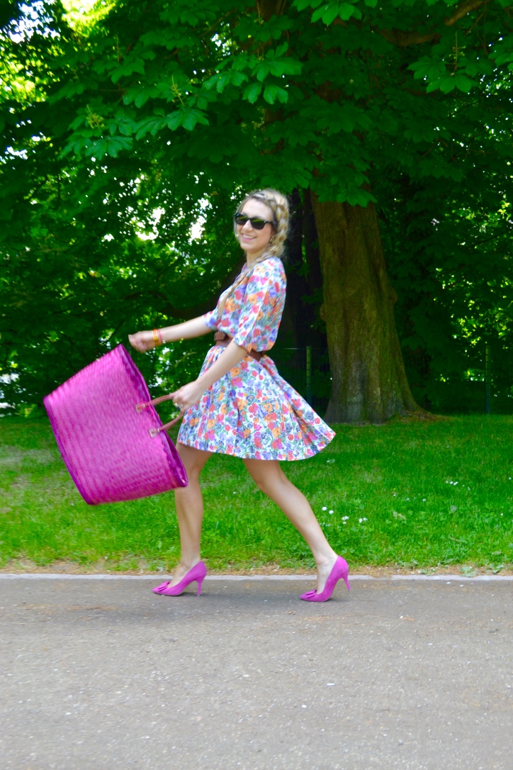 I love flower print for summer and this outfit is one of my favorite ! This suit was Lulu’s grandma’s outfit. When she passed away we had to clean the house and I couldn’t let Lulu give the clothes to charity or toss it to the trash. I found some good pieces like a fur coat, a real French lace dress that is so pretty and this suit that I love. I had to adjust the top because it was a plus size and the skirt was very long. Few scissors cuts later I had a new outfit, upcycled and with a story, and it was fun when Lulu said « I like your new dress, where did you find it ? It’s your grandma ! » I’ve never met her but it’s nice to have pieces of her in my closet.