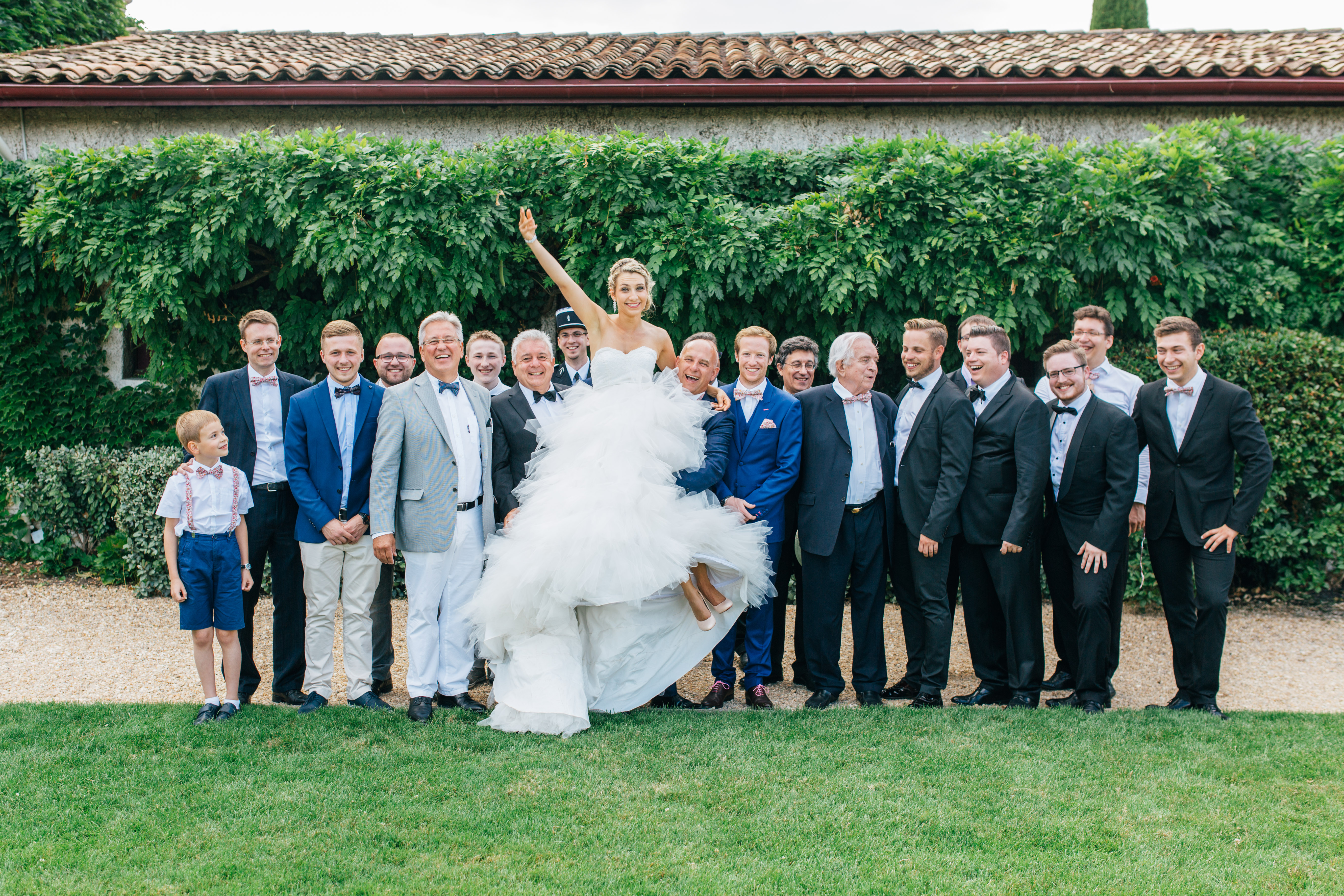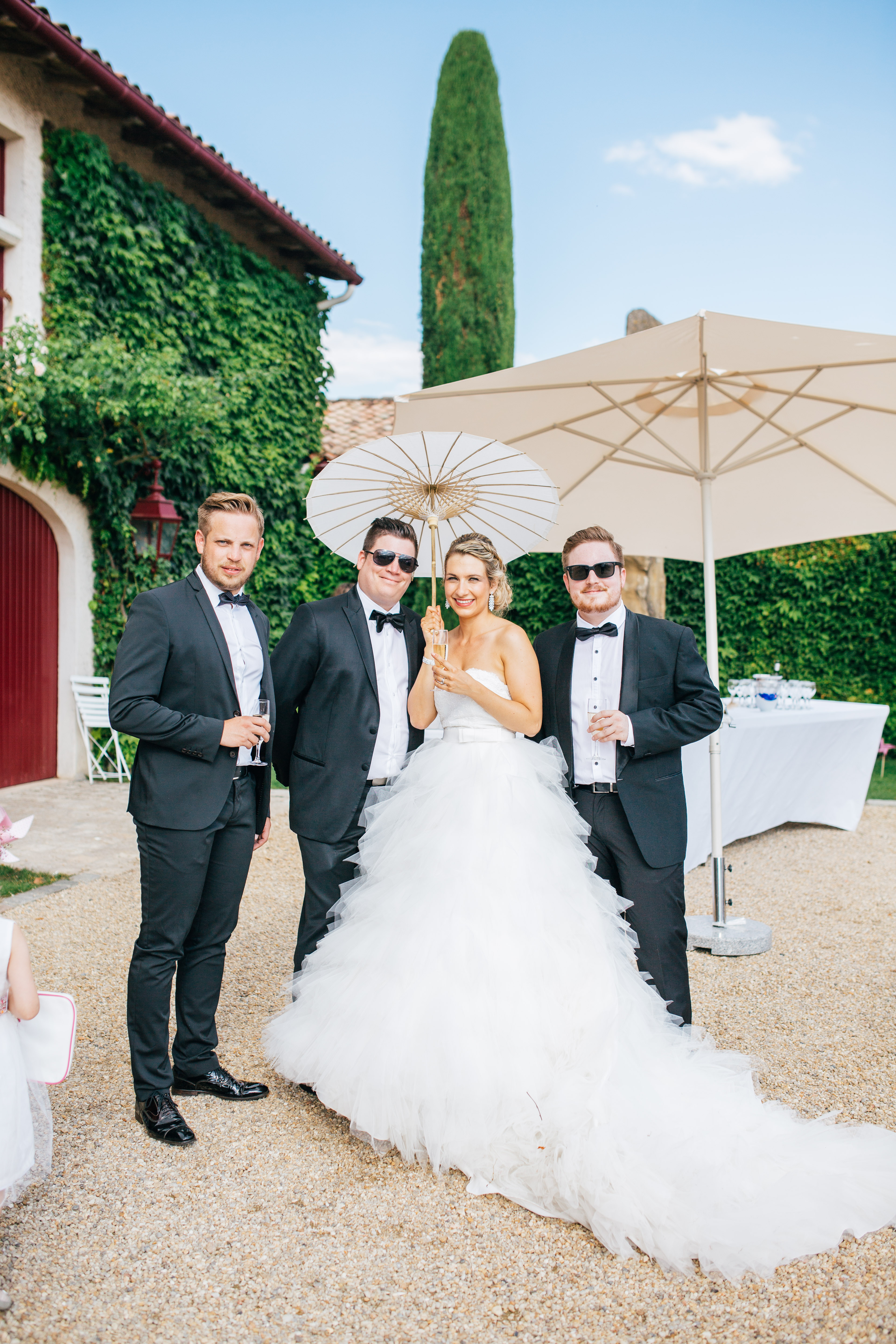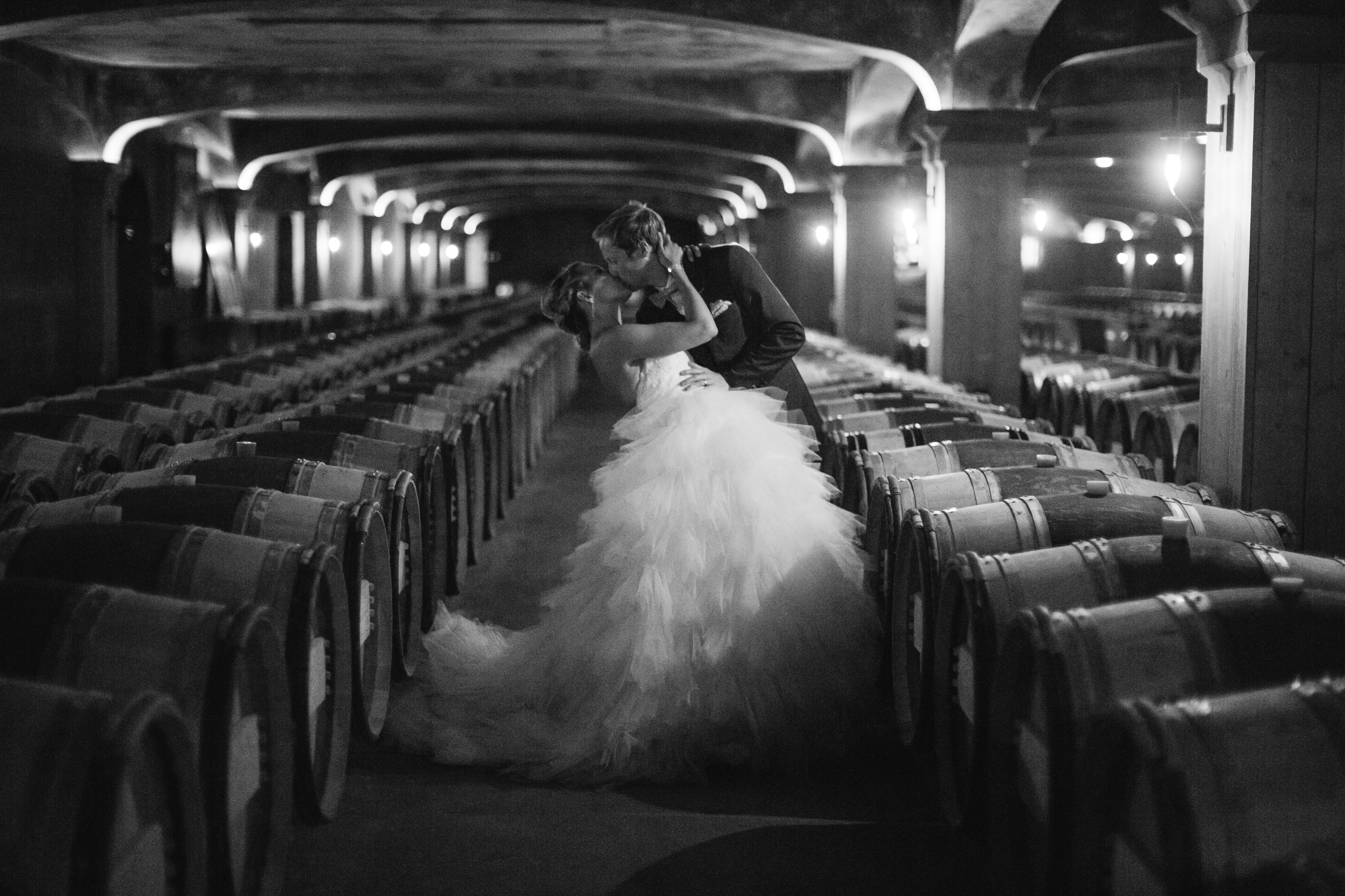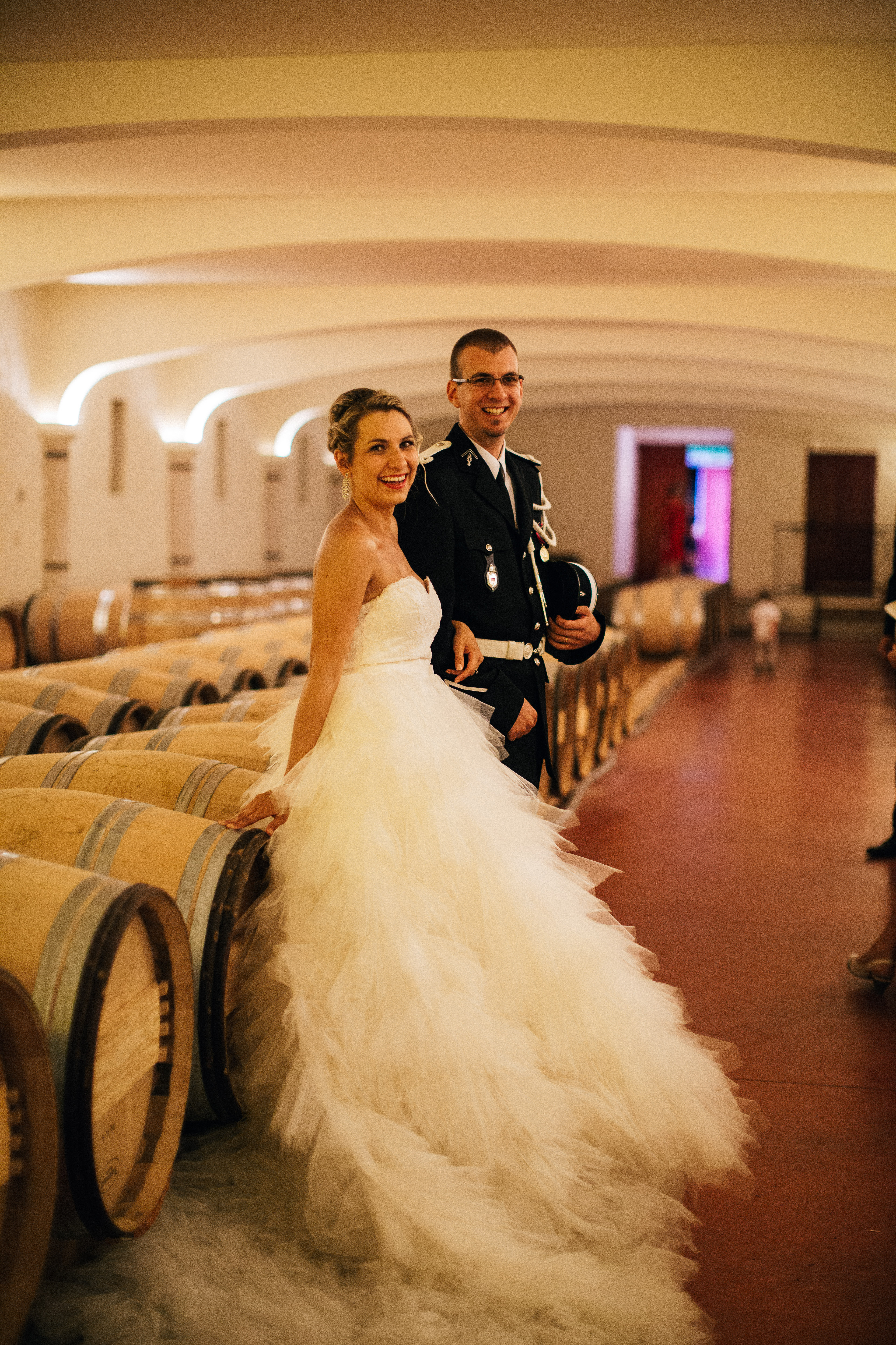After the rehydration and the greetings, we all went to visit the underground wine cellars, this was perfect to cool down, especially with my huge dress ! As I lost my husband in the cellar, I took a photo with my cousin, who is a policeman and was wearing his uniform, it looks so fancy and it was perfect for the family photo coordination I used him as a maestro so he could put some order on the different groups. We took my favorite photo during the little tour, the black and white « princess kiss photo » is my favorite, it pictures perfect the moment. I think I might get it printed on a big canvas for our house !