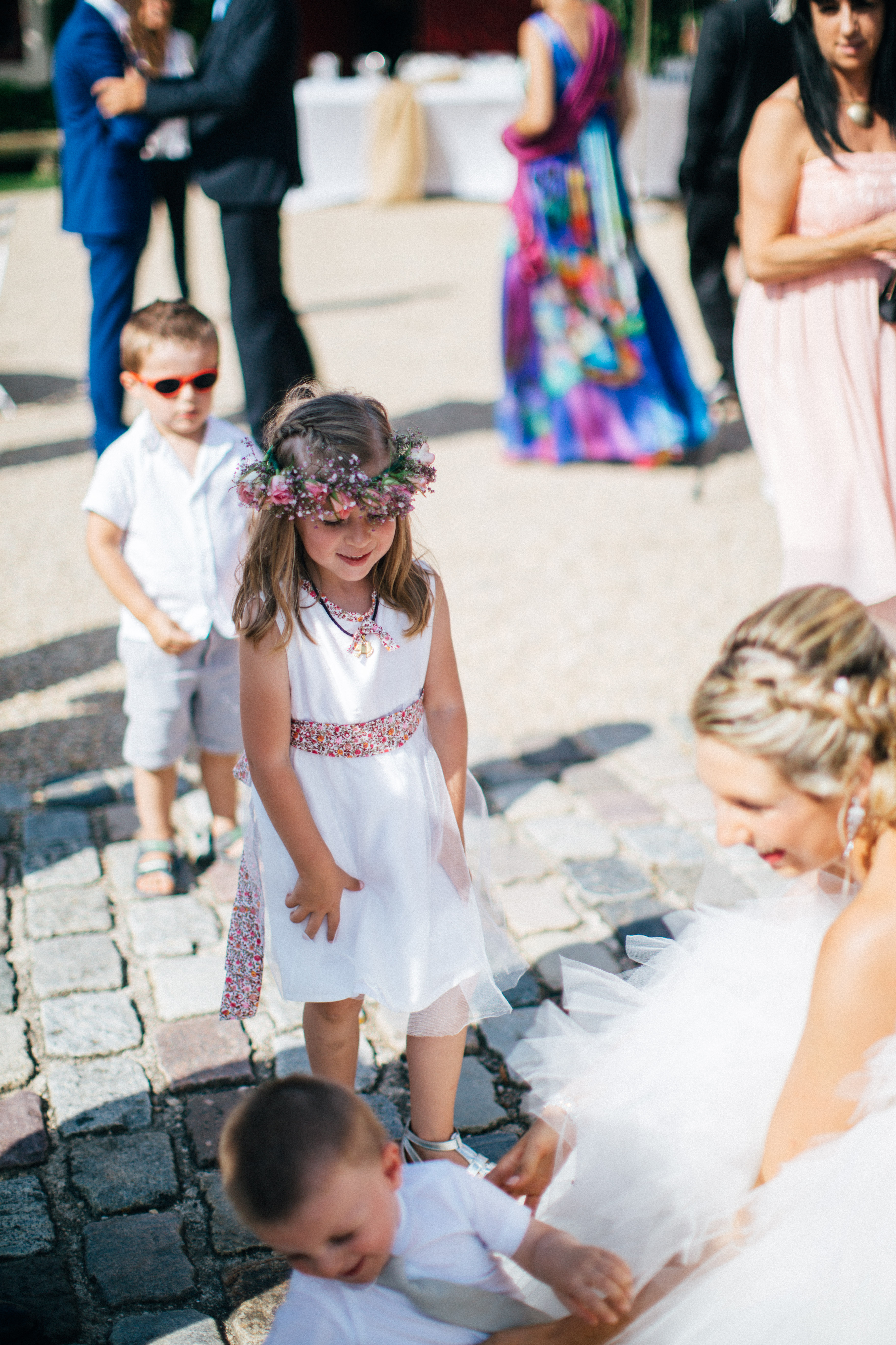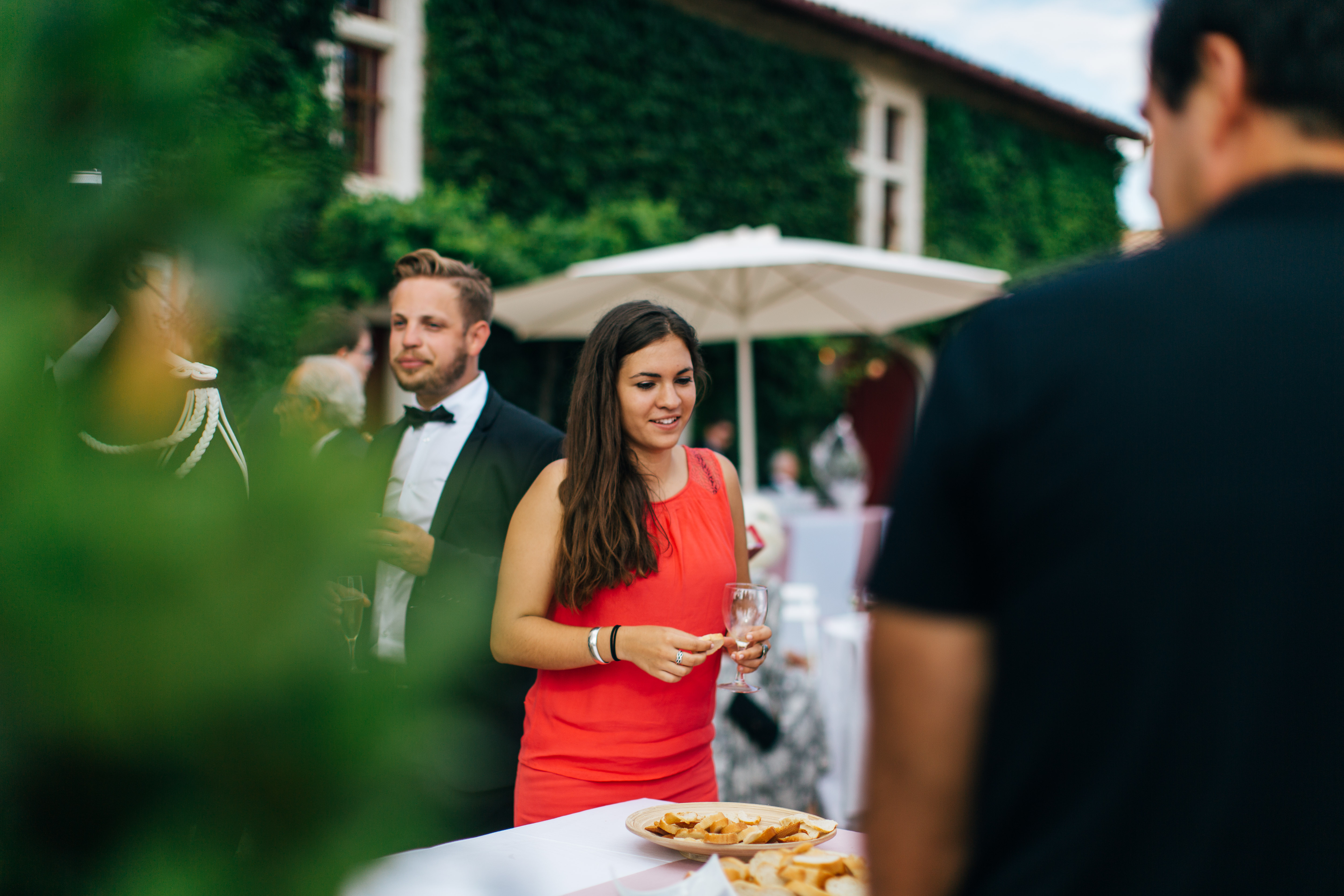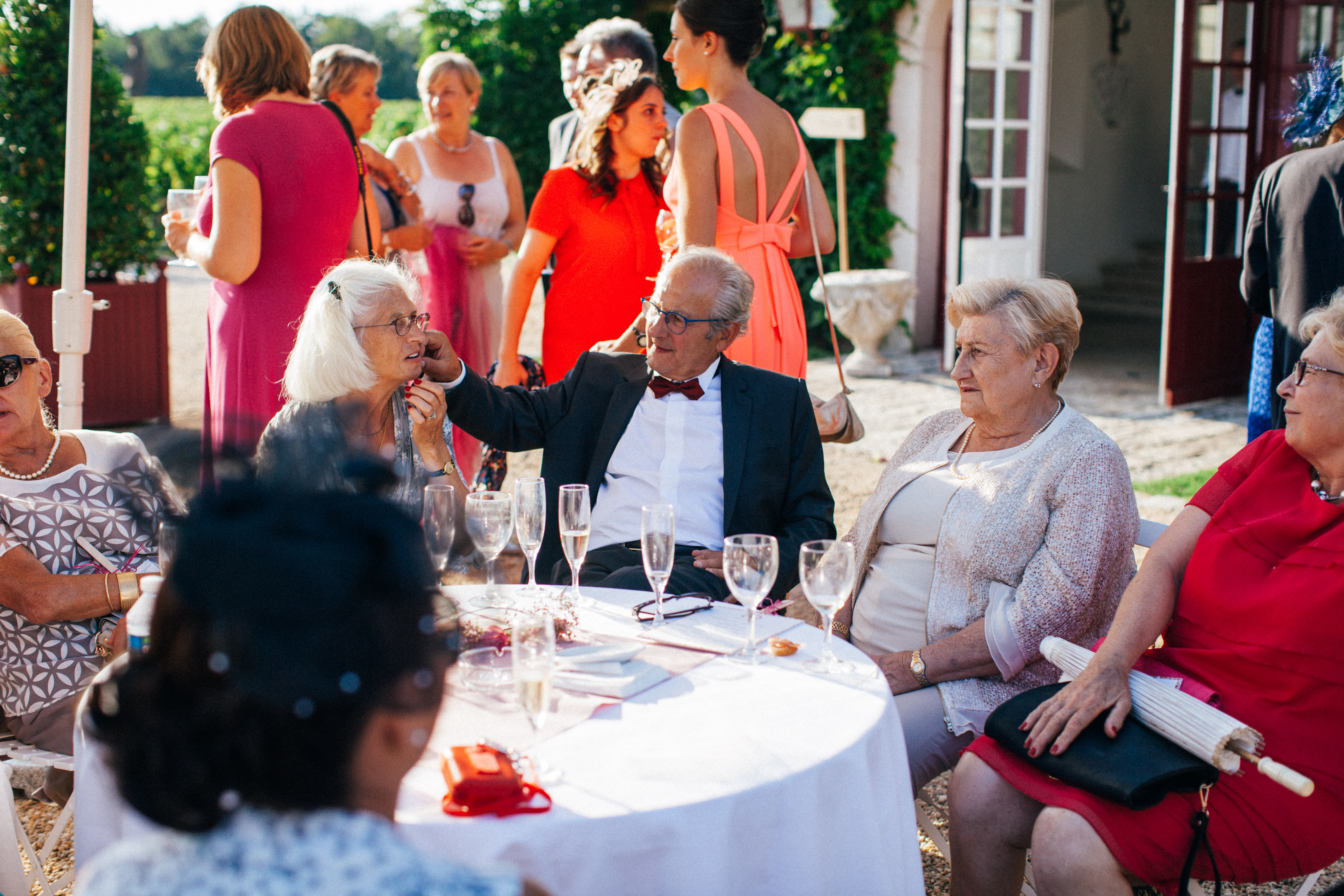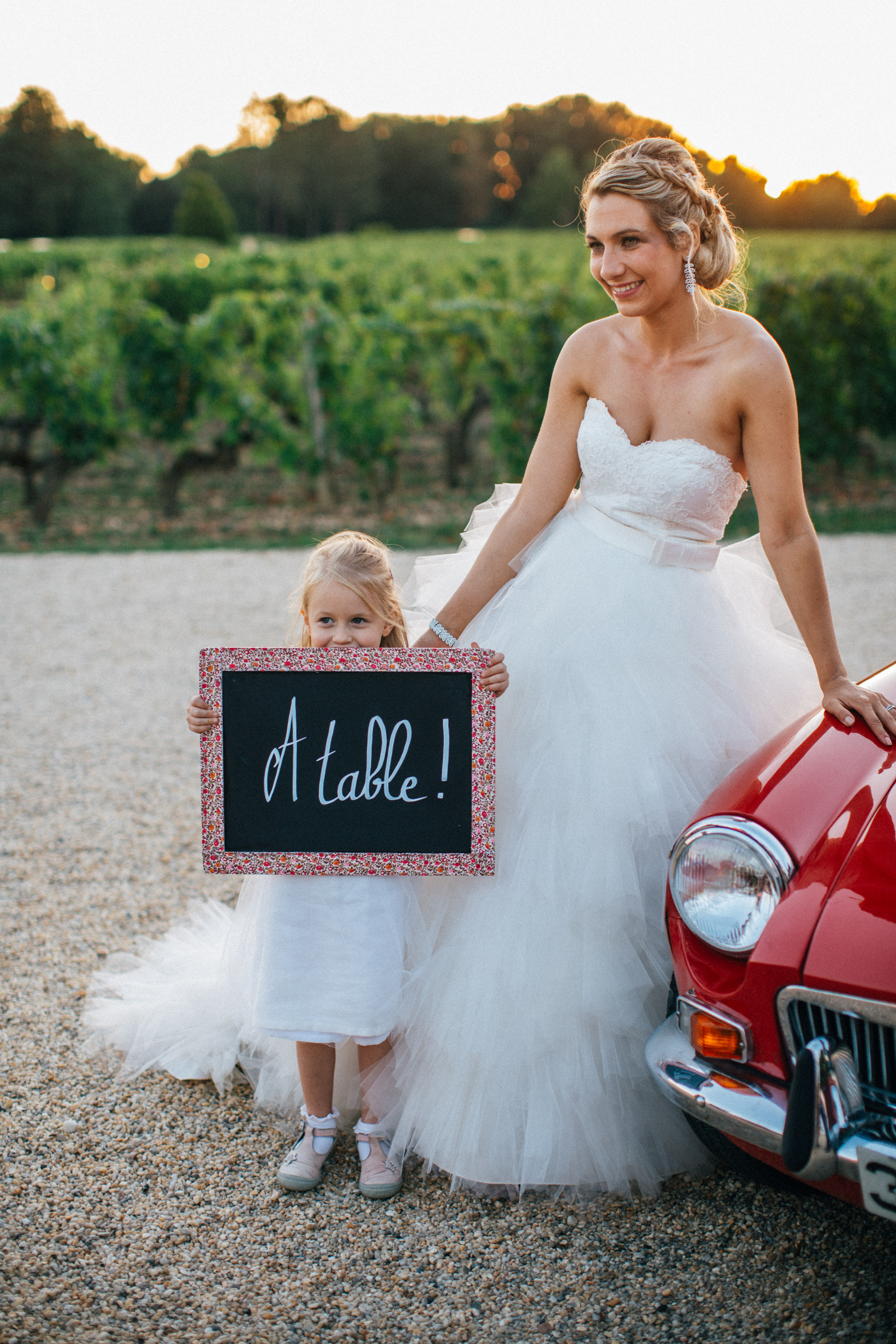 After the rehydration and the greetings, we all went to visit the underground wine cellars, this was perfect to cool down, especially with my huge dress ! As I lost my husband in the cellar, I took a photo with my cousin, who is a policeman and was wearing his uniform, it looks so fancy and it was perfect for the family photo coordination I used him as a maestro so he could put some order on the different groups. We took my favorite photo during the little tour, the black and white « princess kiss photo » is my favorite, it pictures perfect the moment. I think I might get it printed on a big canvas for our house !