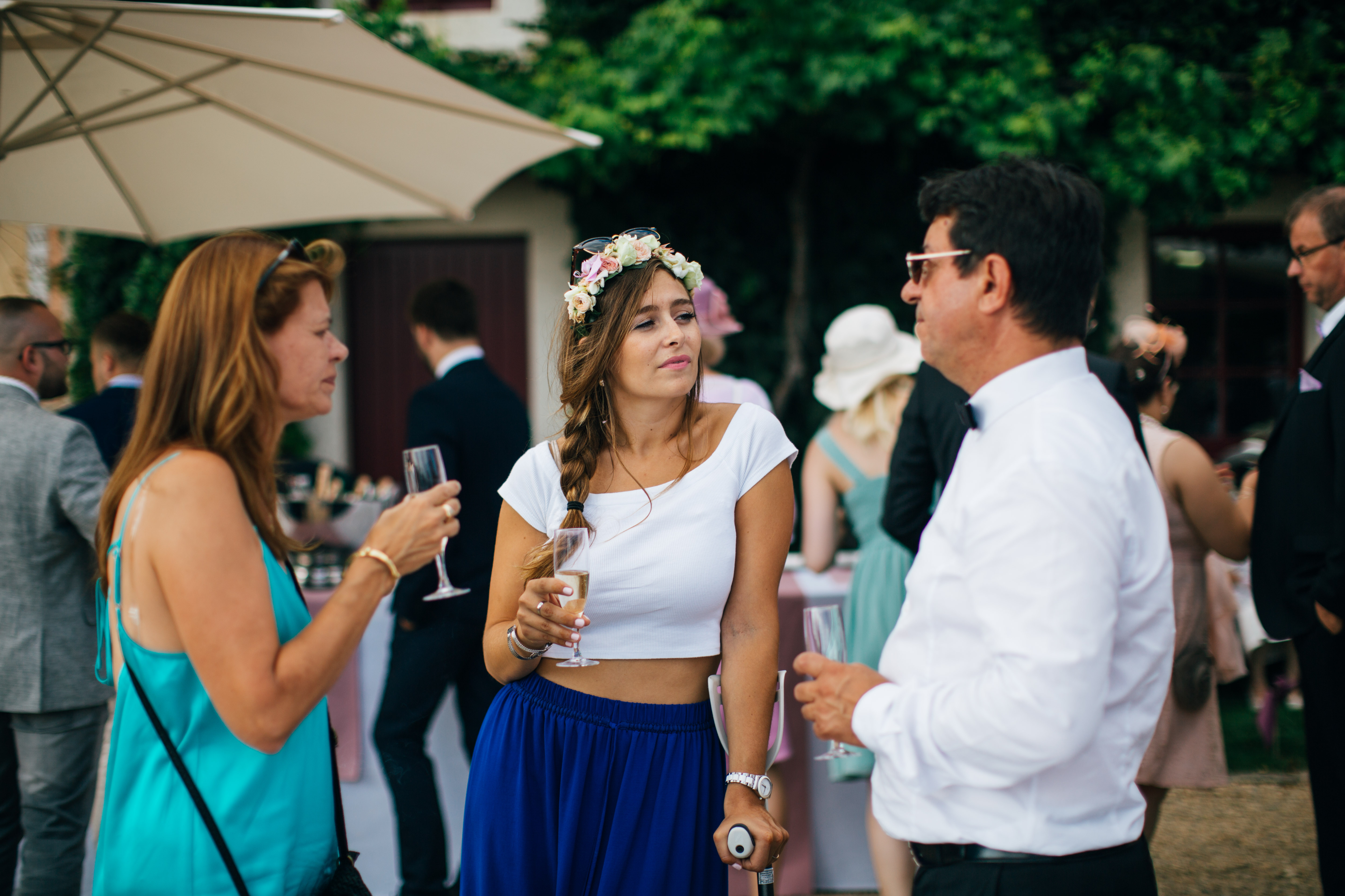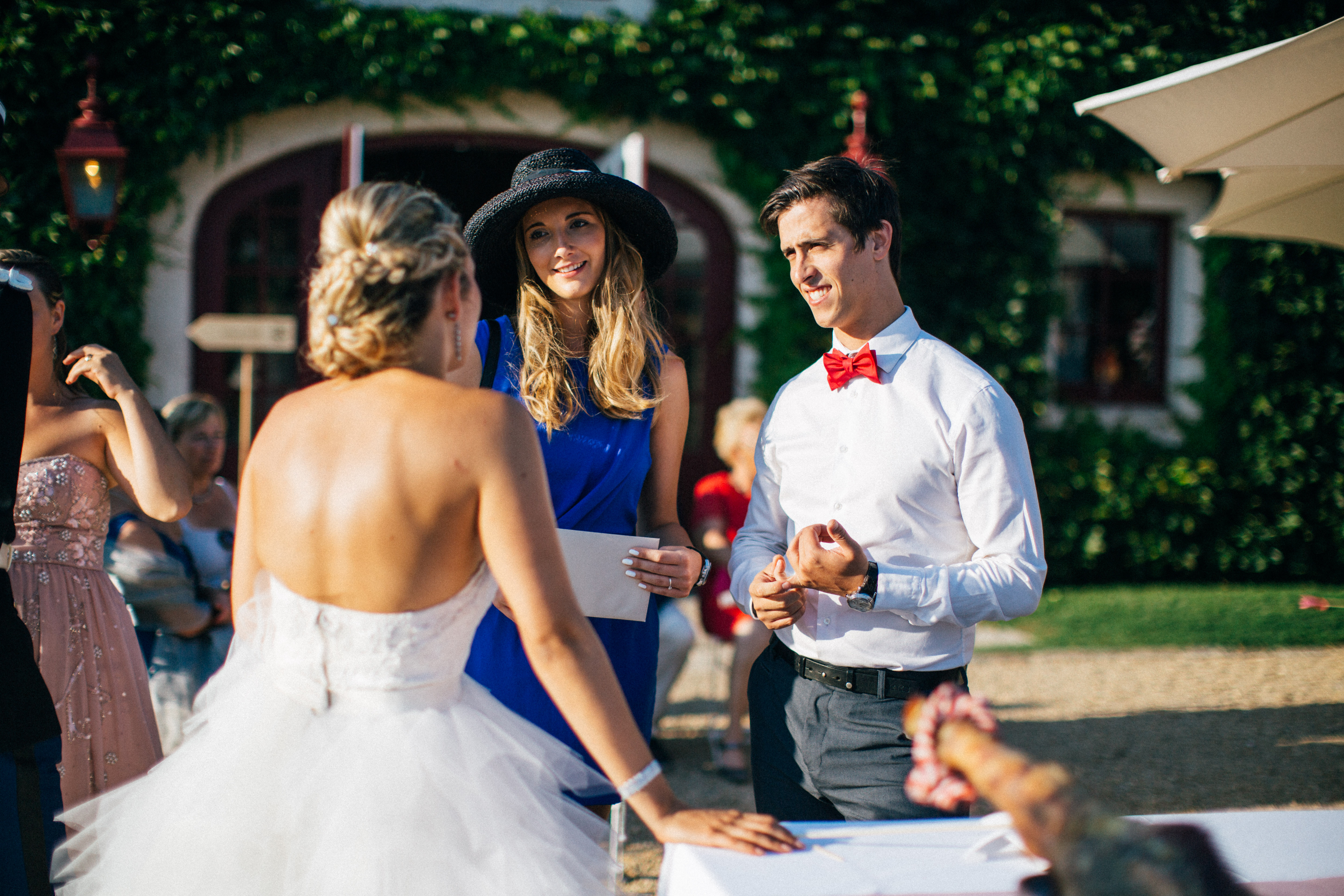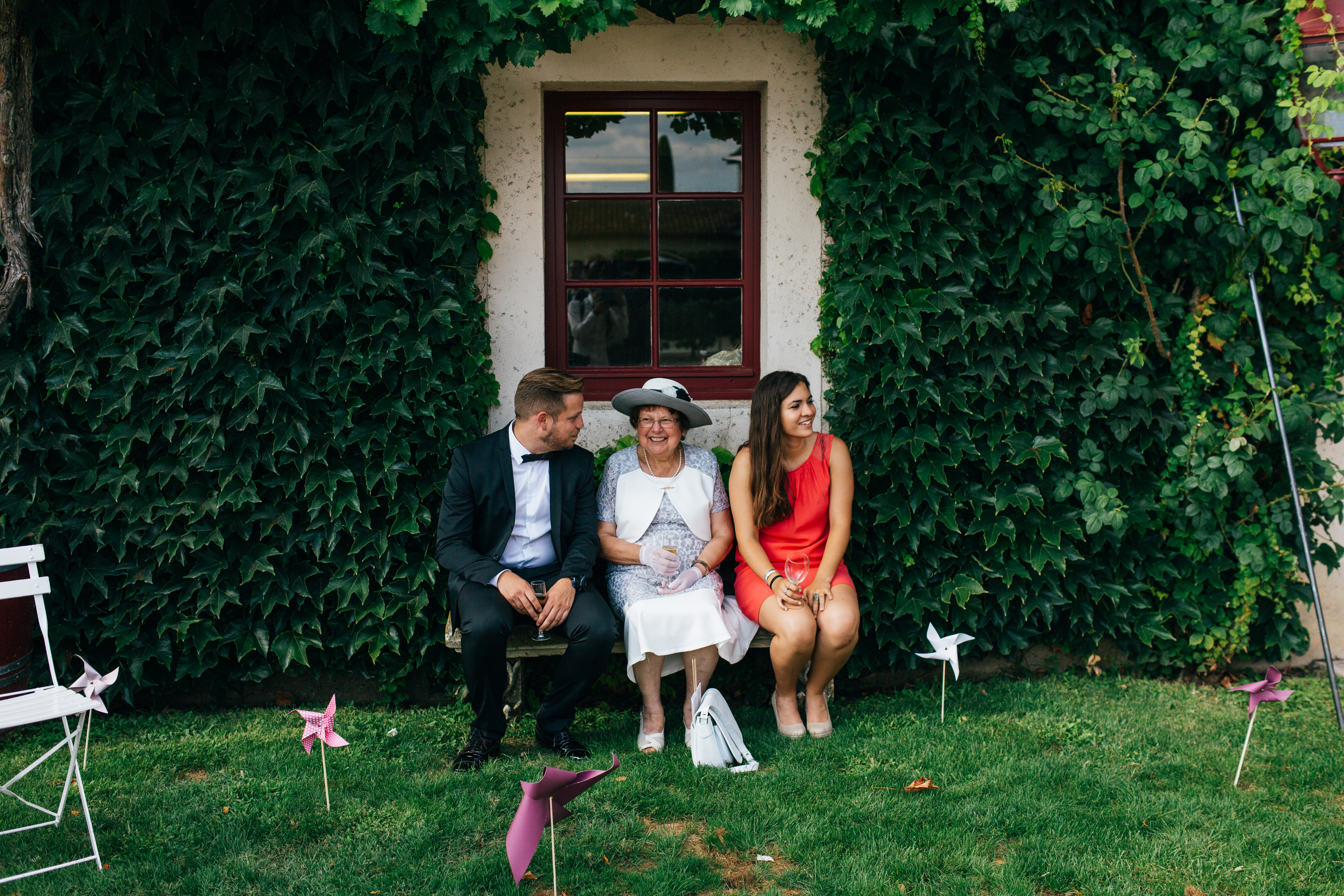 So let’s pick up where we were, after the ceremony we left by car, to have our theatrical exit, but also to have few minute for ourselves right after the ceremony, so Yoris could catch the emotion and the feelings on our faces. So we basically drove and turn around the building so he could meet us on the other side. We had our first couple photos, it was so great to huge each other and kiss. After 10 min we went back to the ceremony place so we could welcome everyone. It was so hot and I had a great idea, in case of hot weather I planned to use a wheelbarrow, as a bottle handler. It turns out great, so if you have a wedding/birthday/party and you need fresh drink, a brouette can be very handy and perfect to transport bottles of any drinks. We actually put the wheelbarrow in the cold room of the catering kitchen and we just brought it to the ceremony so people could drink iced cold water. And let me tell you it was more than needed ! Lulu’s dad let me borrowed his wheelbarrow and he even painted it in silver and white so it fits in theme.