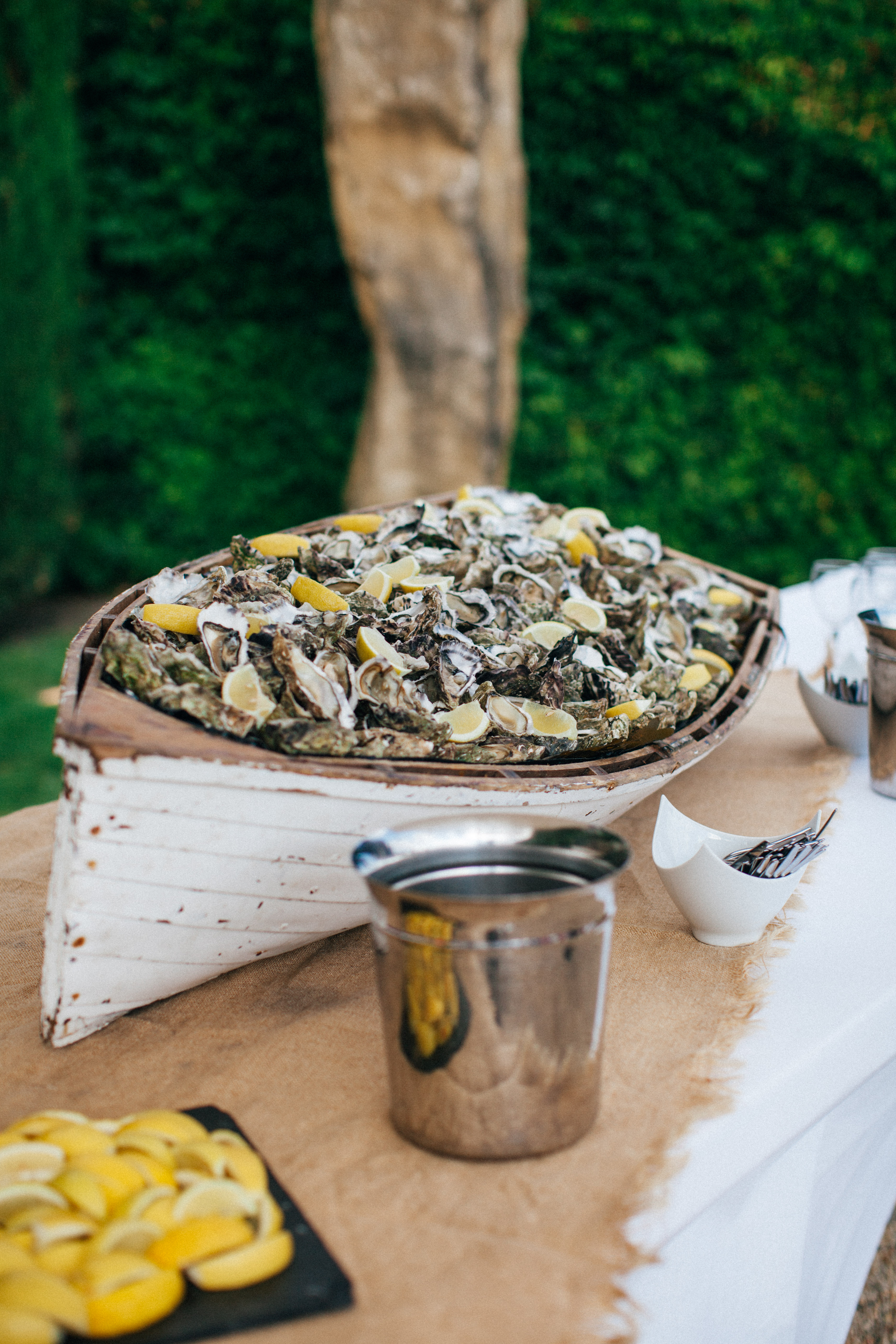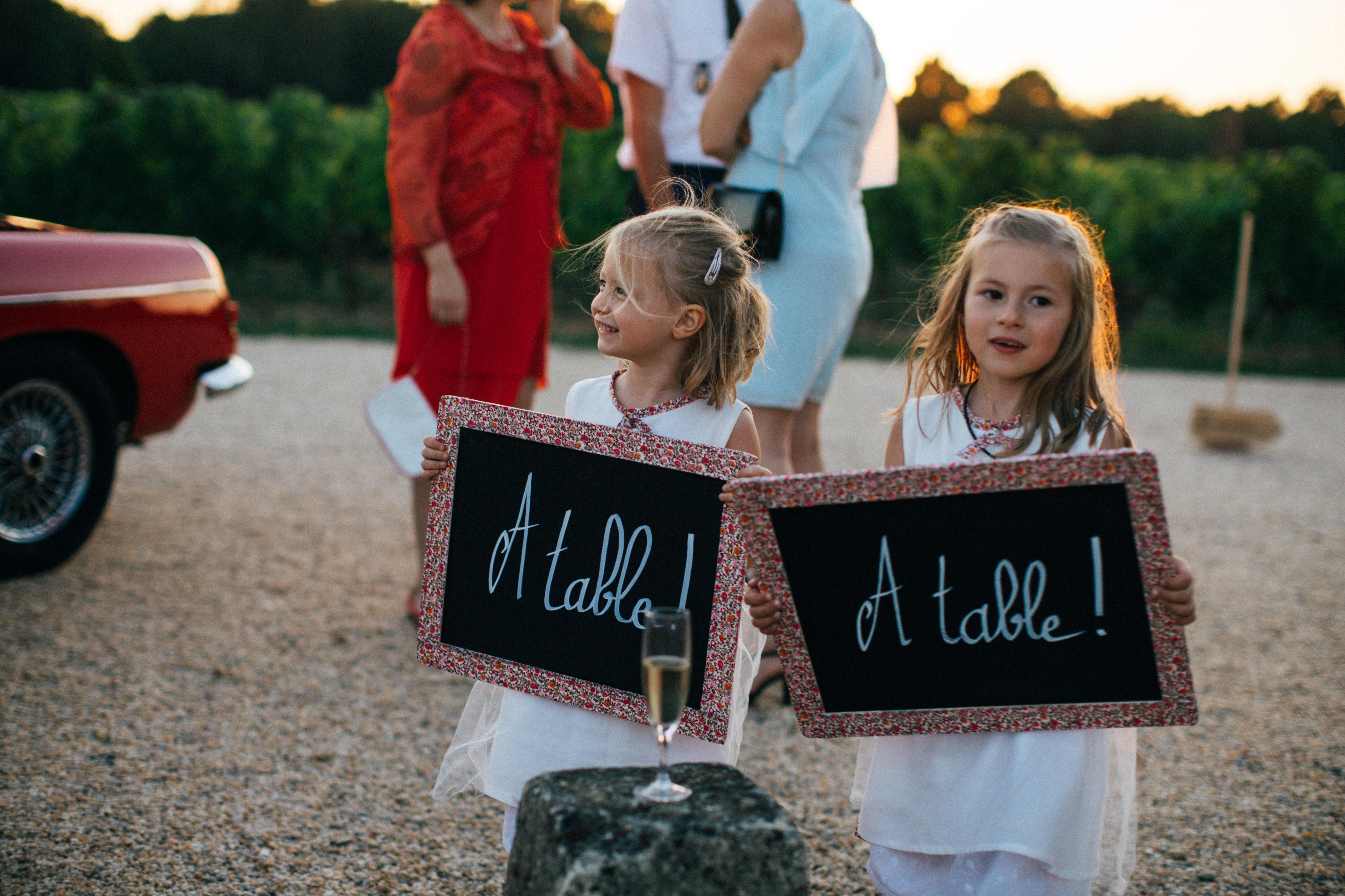 Pour le cocktail nous avions du champagne bien sûr, une découpe de foie gras, mi cuit et foie gras au vin rouge, une découpe de jambon de Bayonne, et une barque d’huitres du bassin d’Arcachon. Nous avions 150 personnes à la cérémonie et au cocktail et nous étions 110 à table. Une fois que le cocktail touchait à sa fin, j’ai demandé aux enfants de jouer leurs rôles : les petits garçons devaient aller sonner la cloche le plus fort possible, et les petites filles passer entre les invités pour les faire se mettre « à table ! ». Evidemment j’ai du leur promettre plein de bonbons pour qu’ils le fassent, et laisser moi vous dire qu’ils ont fait honneur à mon candybar !! Mais ça c’est pour le prochain épisode ….