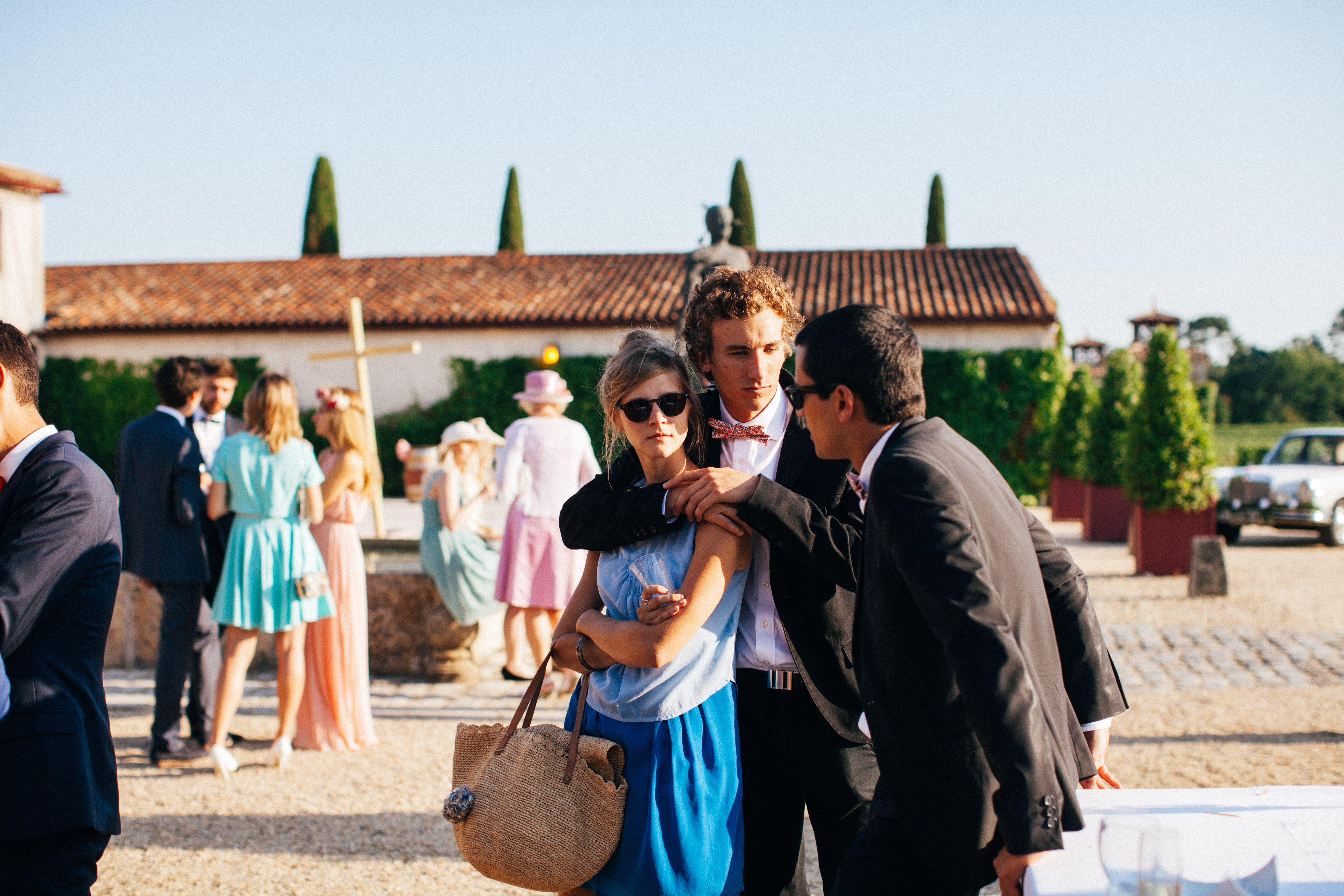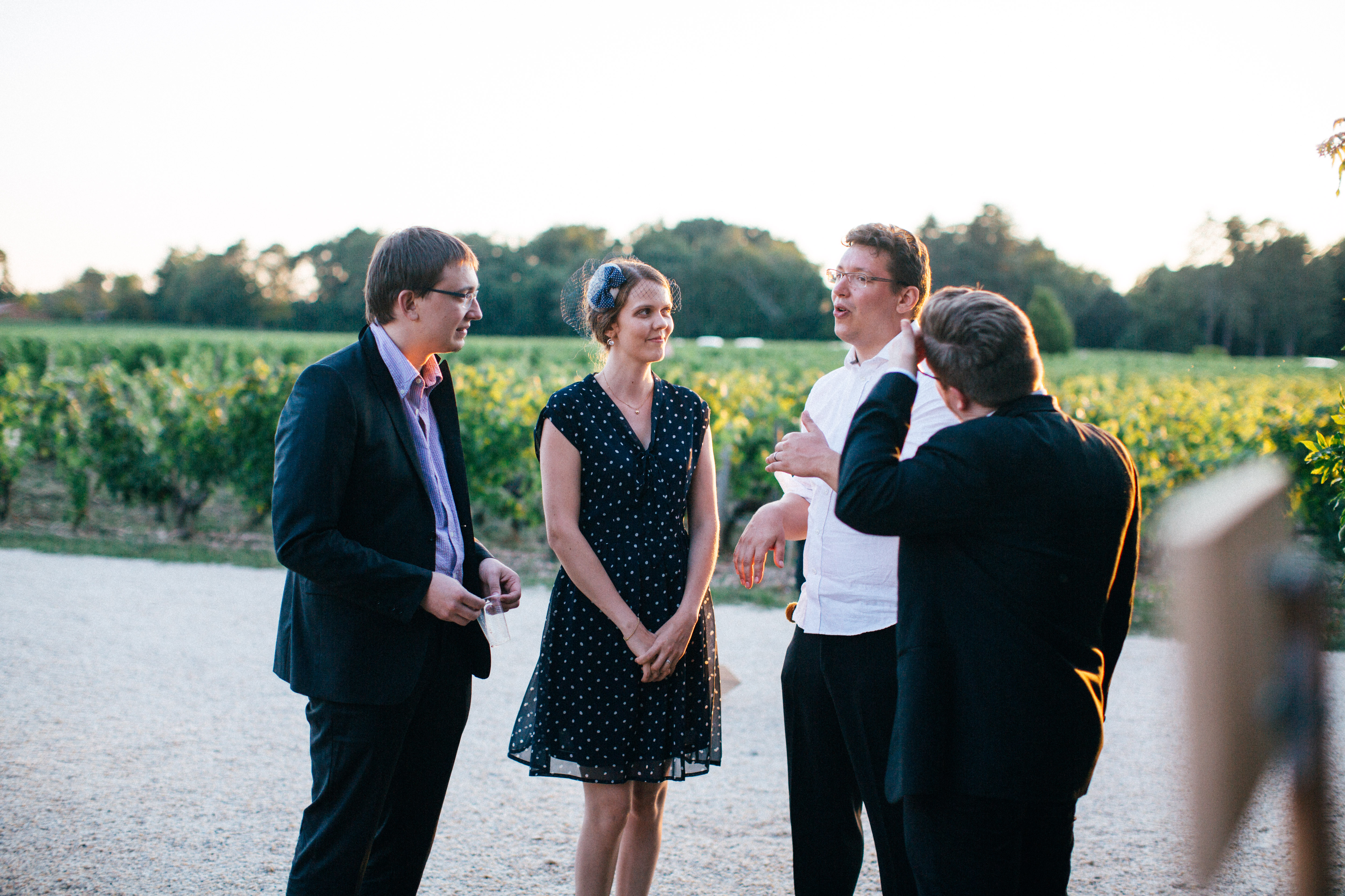 Après une dizaine de minute, nous avons retrouvé nos invités, et pour rafraichir tout ce beau monde nous avions prévu une brouette remplie de bouteilles d’eau fraiche. Et il faisait tellement chaud que tout le monde était bien content de pouvoir boire un peu d’eau. Après la petite pause, nous avons fait une traversée des chais de Smith Haut Lafitte avec une guide qui nous a expliqué l’histoire du château et du vin (j’avoue que j’ai fait la rebelle, j’étais au fond des chais avec le beau marié à faire des photos, j’ai pas écouté grand chose hi hi ). Nous avons fait ma photo préférée à ce moment là, celle en noir & blanc avec la pose de princesse est ma préférée, j’ai envie de la faire imprimer sur une toile pour la voir tous les jours et me souvenir de ce moment si unique !
