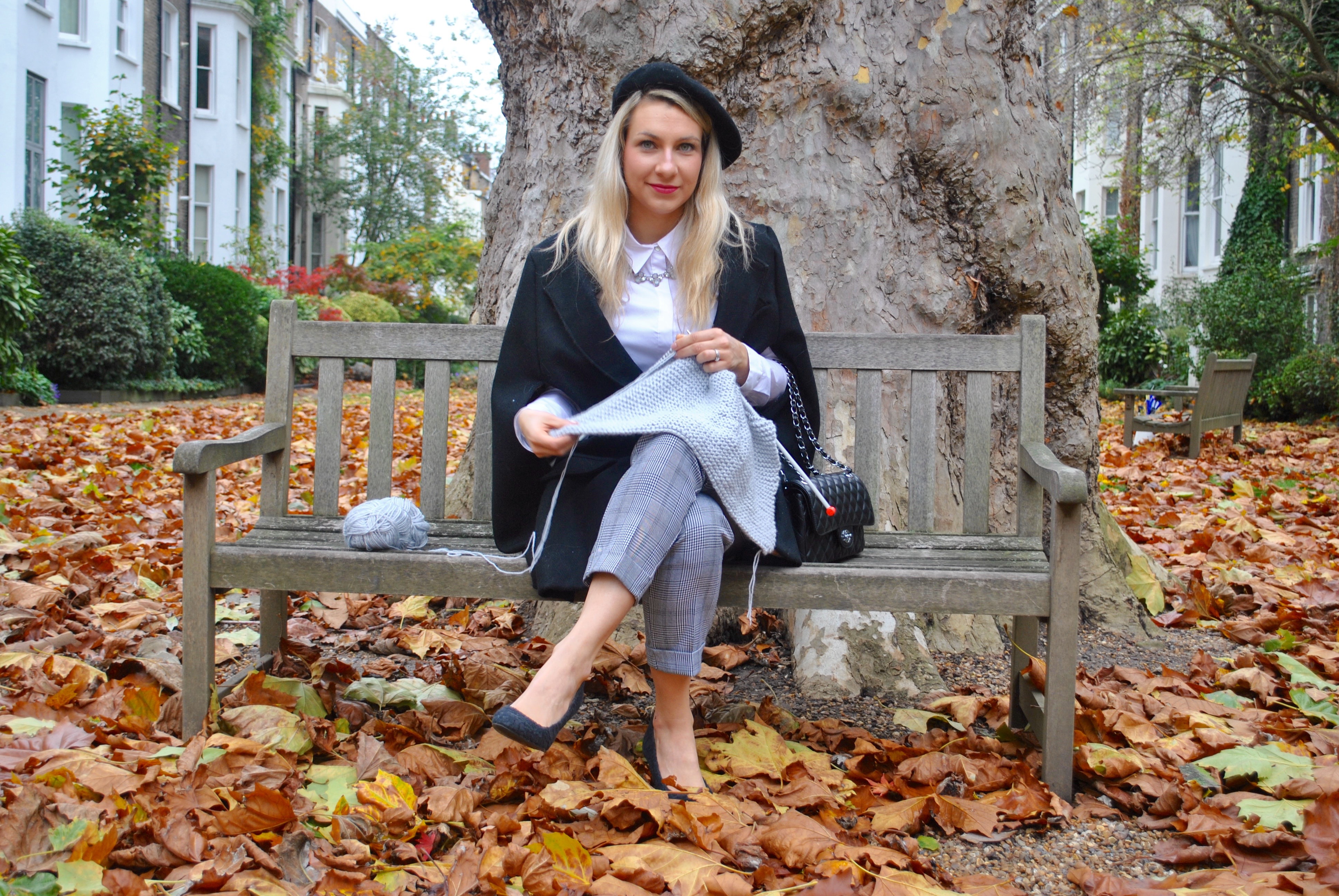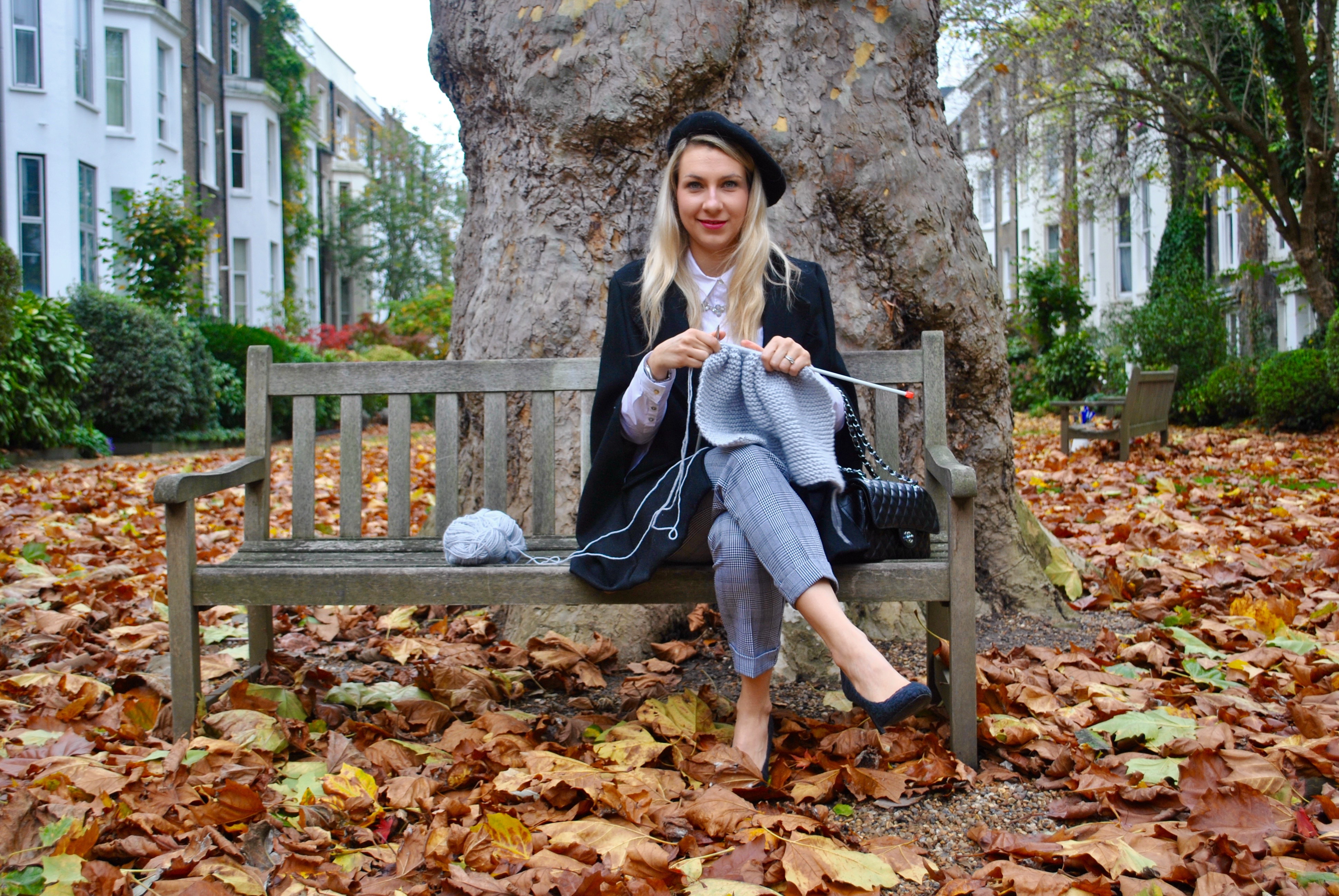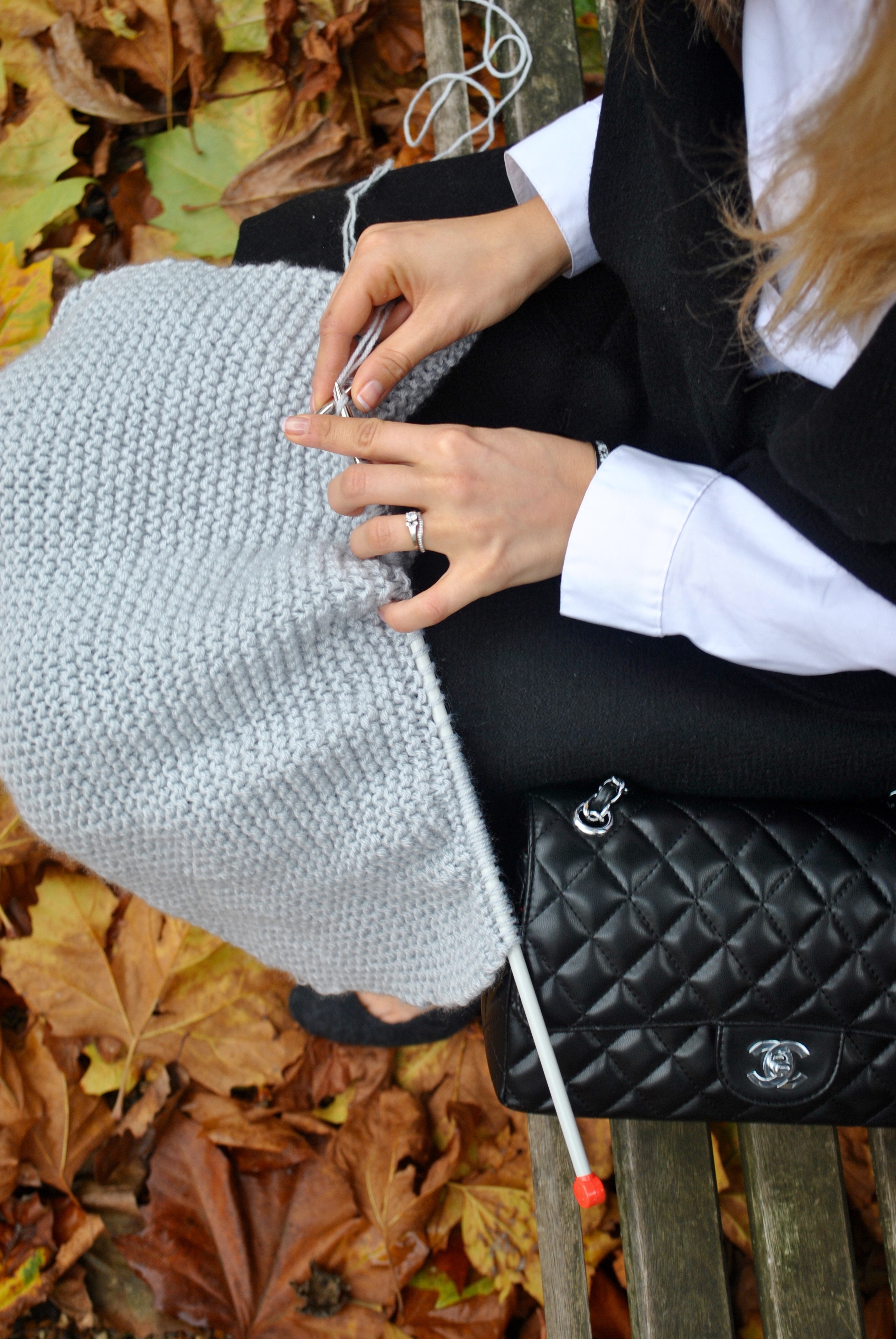 Voici une tenue que j’aime porté pour ce premier hiver à Londres en tant que Madame Daniel. Une cape bien chaude, un pantalon originale et un chemisier intemporel pour aller avec. Quand il fait beau, j’aime aller me promener dans le parc ou profiter de notre jardin. Et comme j’aime toujours occuper mes mains, me voici sur un banc en train de tricoter une couverture grise toute douce. Avant de partir j’ai fait le plein de pelotes et j’ai eu une forte envie de gris souris. C’est pratique, unisexe et celle-ci est tellement agréable à tricoter je ne m’en lasse pas.