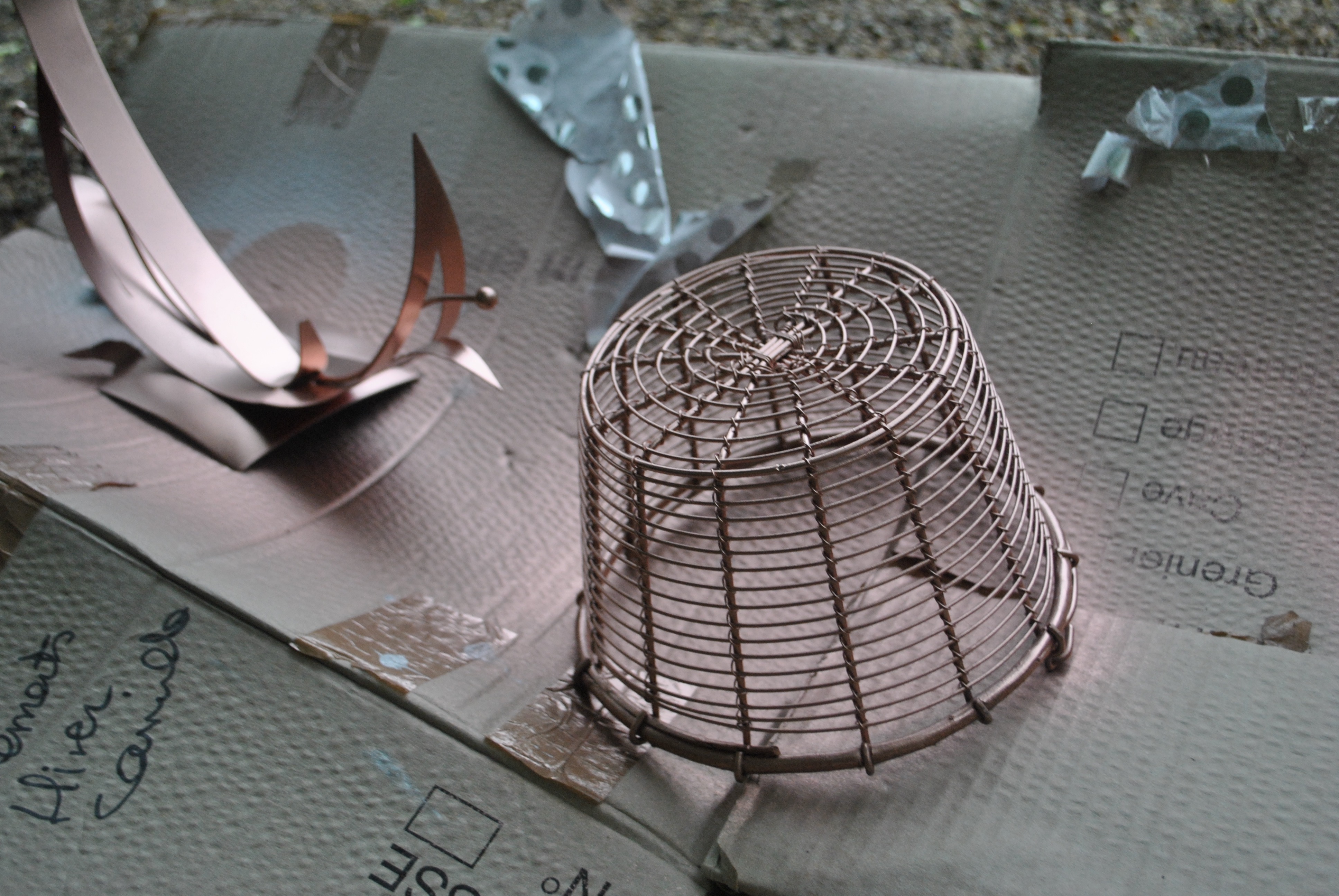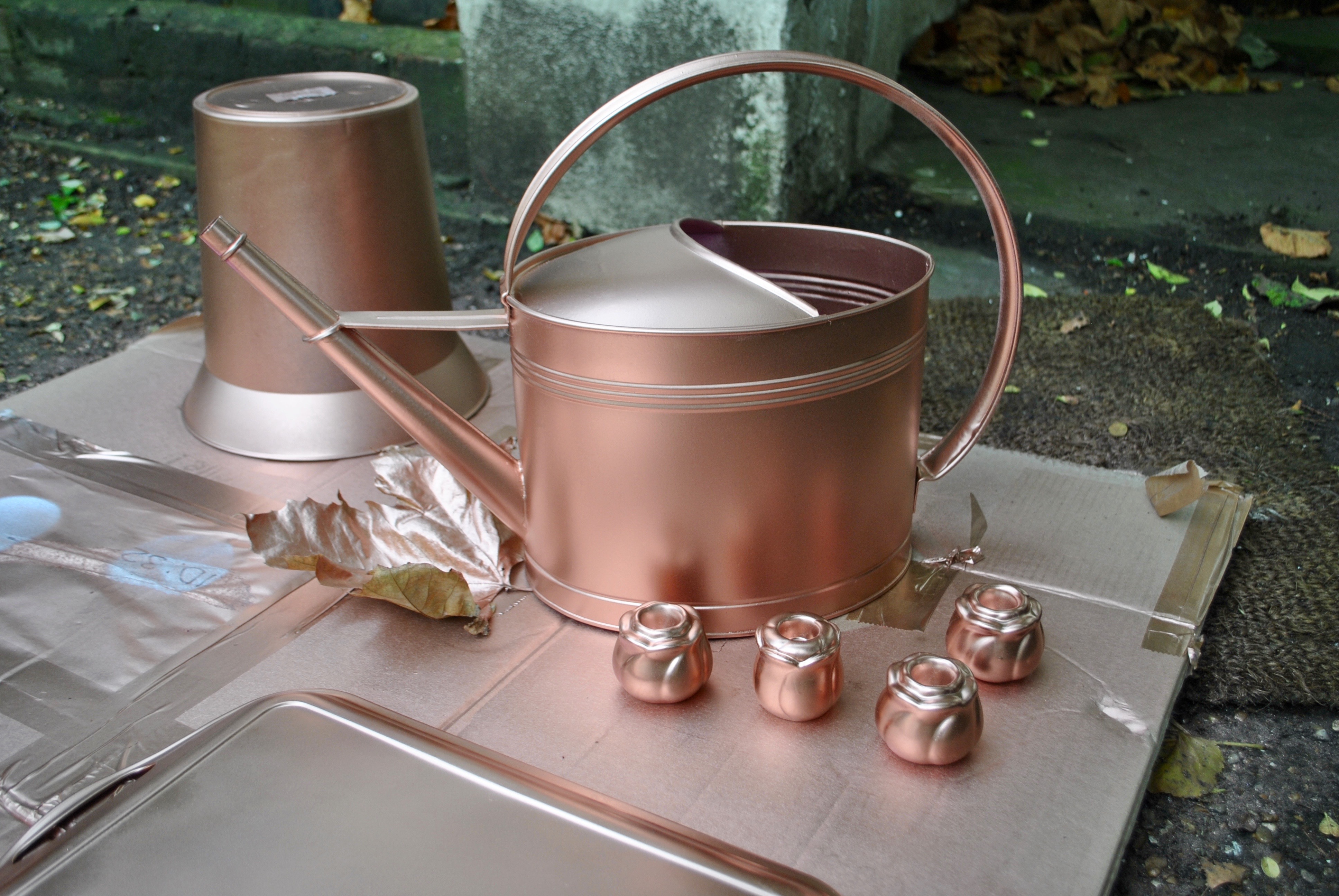 The paint was found in this shop in London. The brand is Montana acrylic spray paint (color Copper chrome) In my opinion it’s a good quality one, it doesn’t chip or crakle, dries quickly and as this nice mirror shine that I was looking for. It’s acrylic so it’s waterproof and can be used on any surfaces. Once I had it in my hands I could stop painting everything !