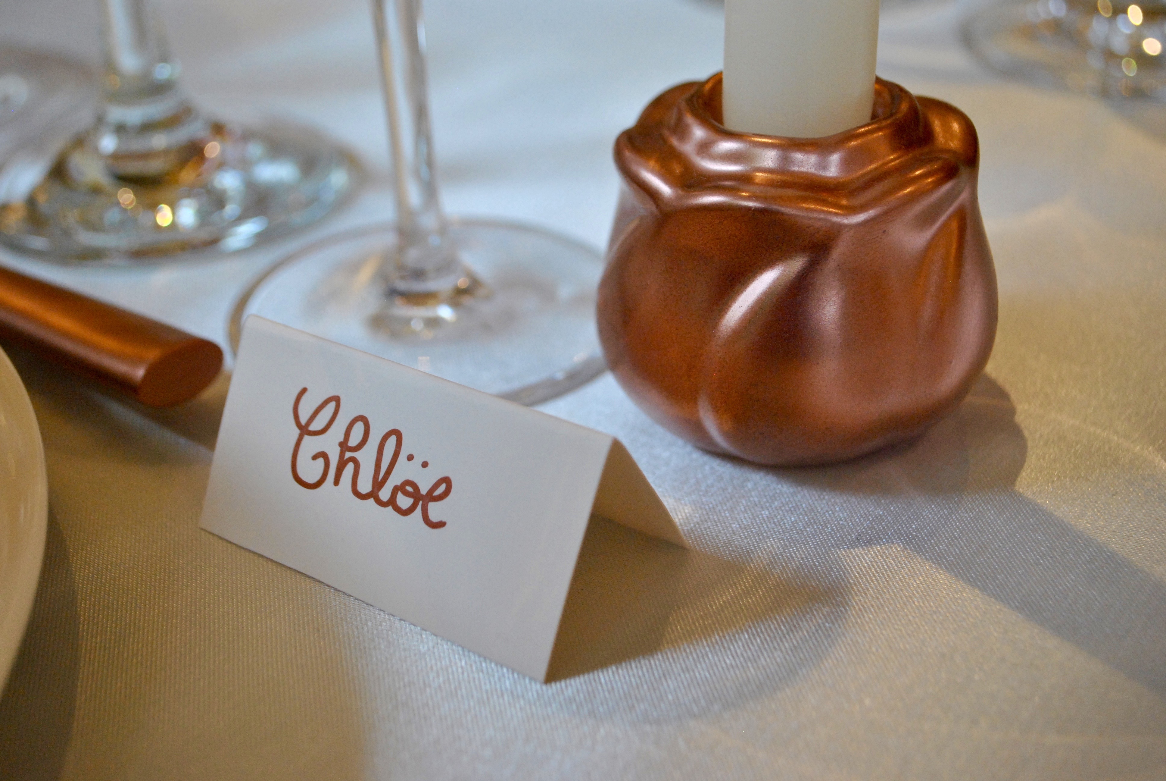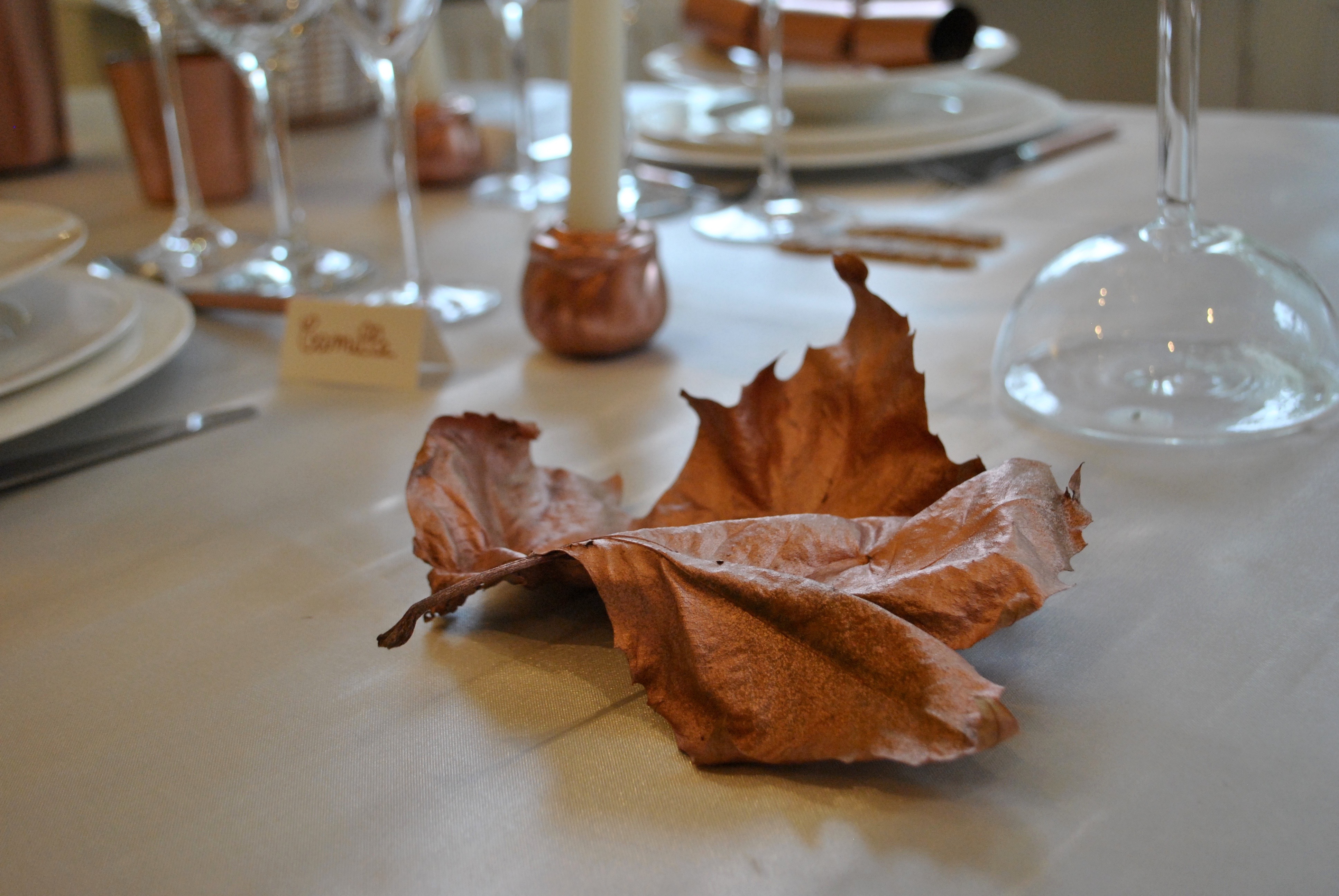 I did a wire basket for our bread for the table and the Christmas crackers that I put on the plates. We had an old watering can in our garden from the owners and the color has fade away with the rain and the sun, so I hope they don’t mind I turn it into a piece of art :). We bought cheap forks and knifes last summer when we had people over for diner but did have enough sets for everyone, and now that we have our beautiful wedding plates and knifes we don’t use it anymore. So it went in the box with the other ugly things to paint, and here we go ! Fancy forks and knifes to match my table. I tried a dead leaf and it was also very pretty.