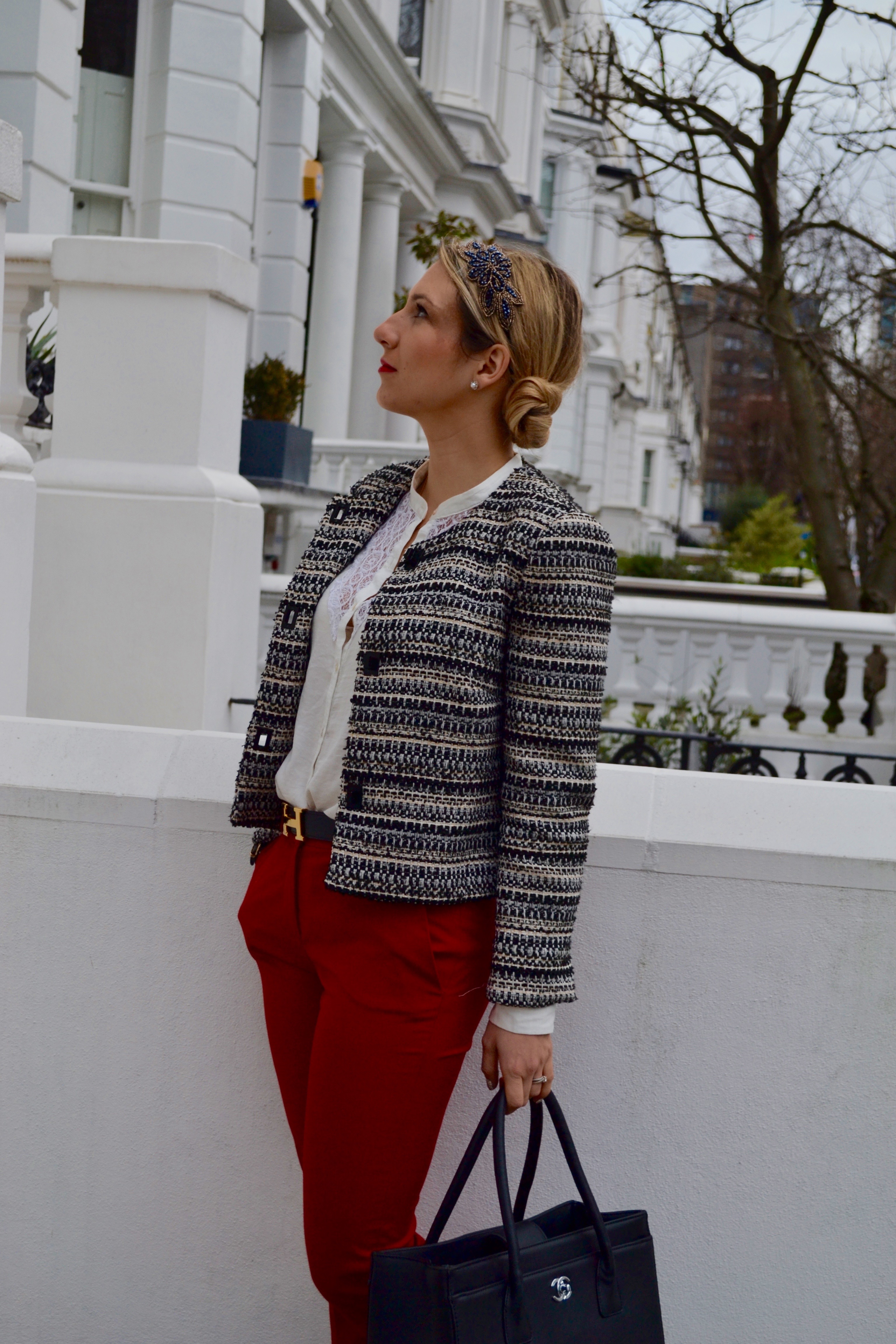 I chose to wear a a lacey white blouse to keep things classical. My HermÚs belt for the bling and a tweed jacket for the Jackie Kennedy in me, add a pair of high heels et voilà !