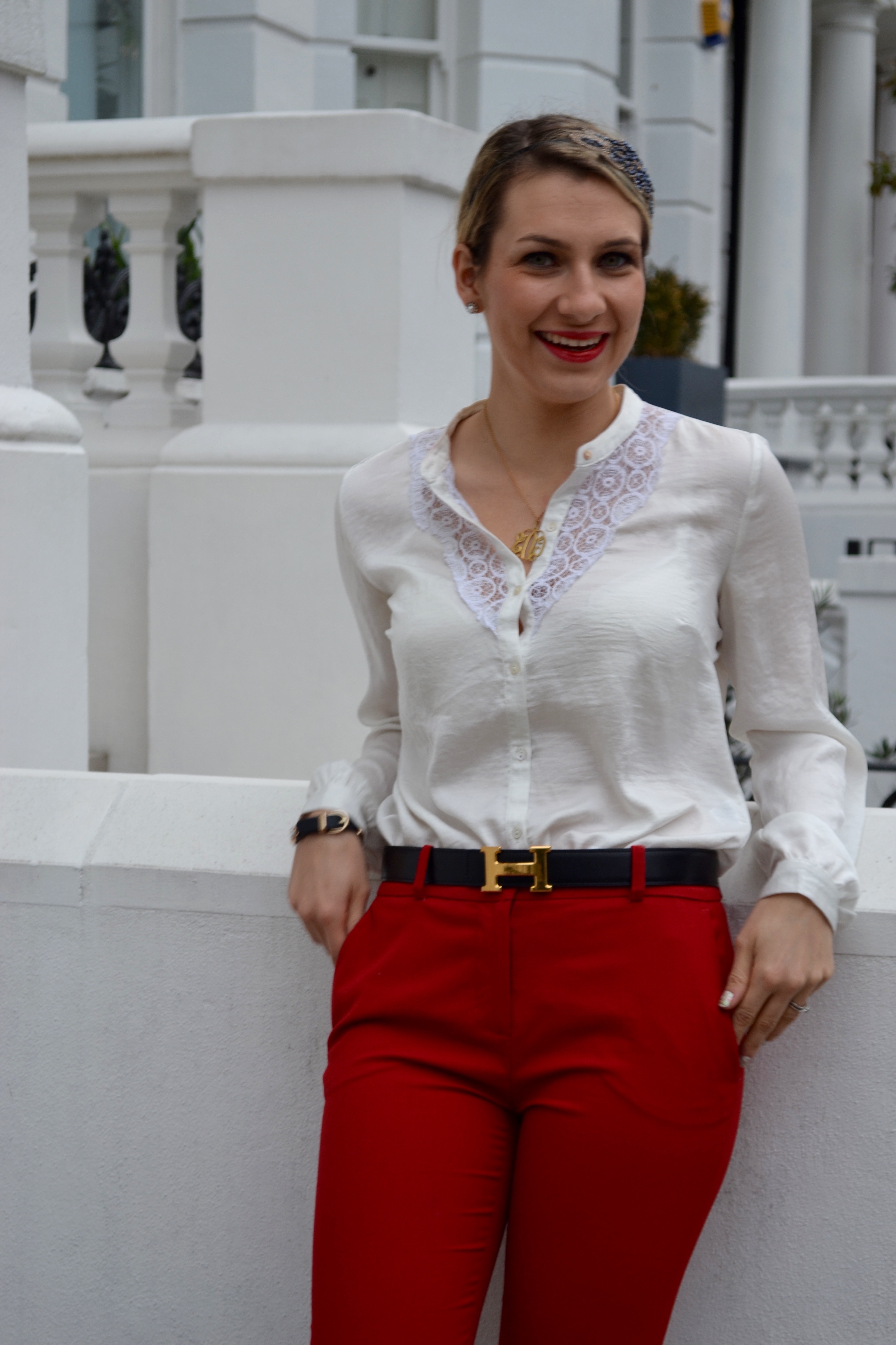Pour essayer d’avoir ces 3 points j’ai choisi un pantalon de tailleur rouge. Je voulais garder une tenue pantalon de tailleur/chemisier/veste trĂšs classique en y rajoutant ma petite touche colorĂ©e.Â