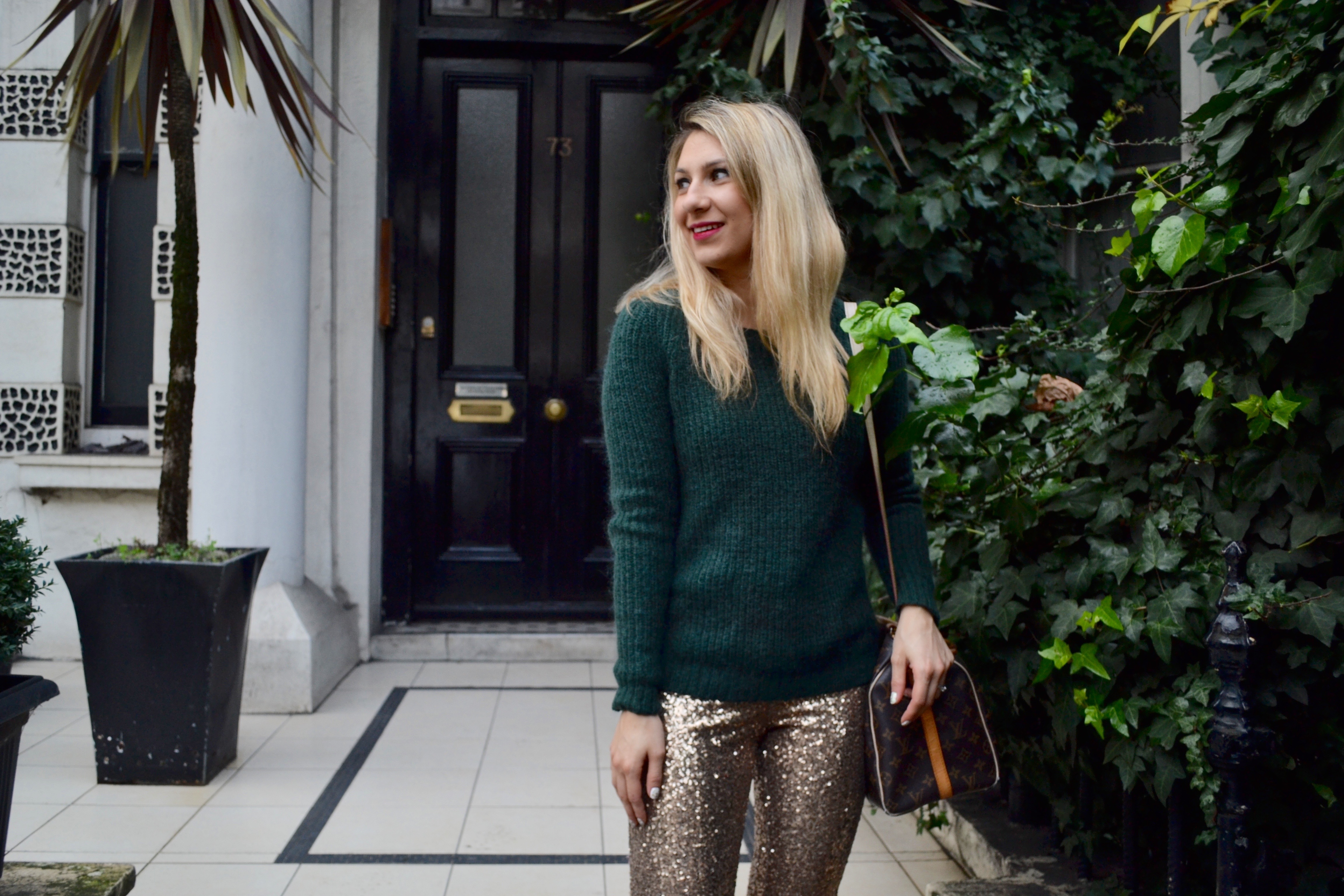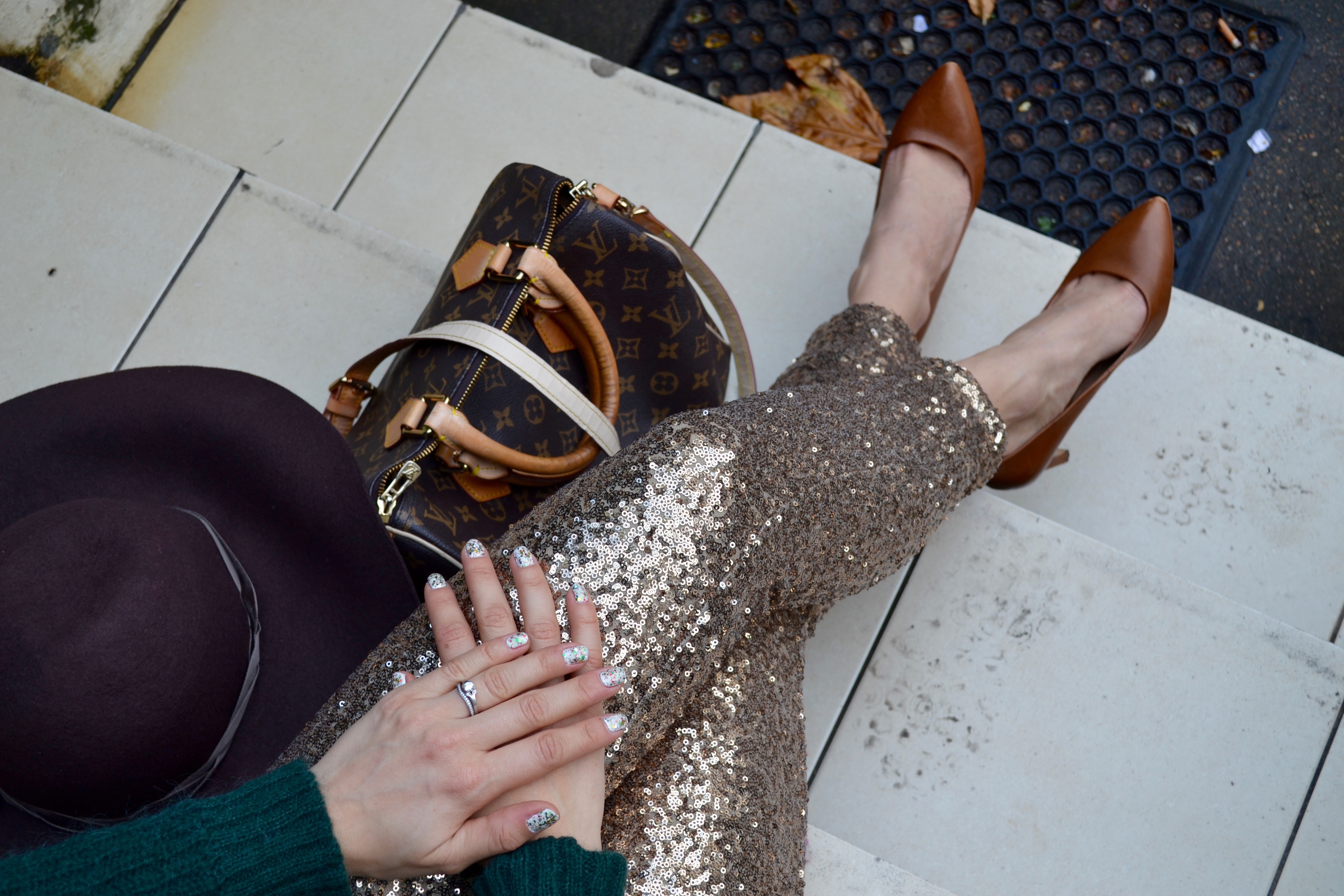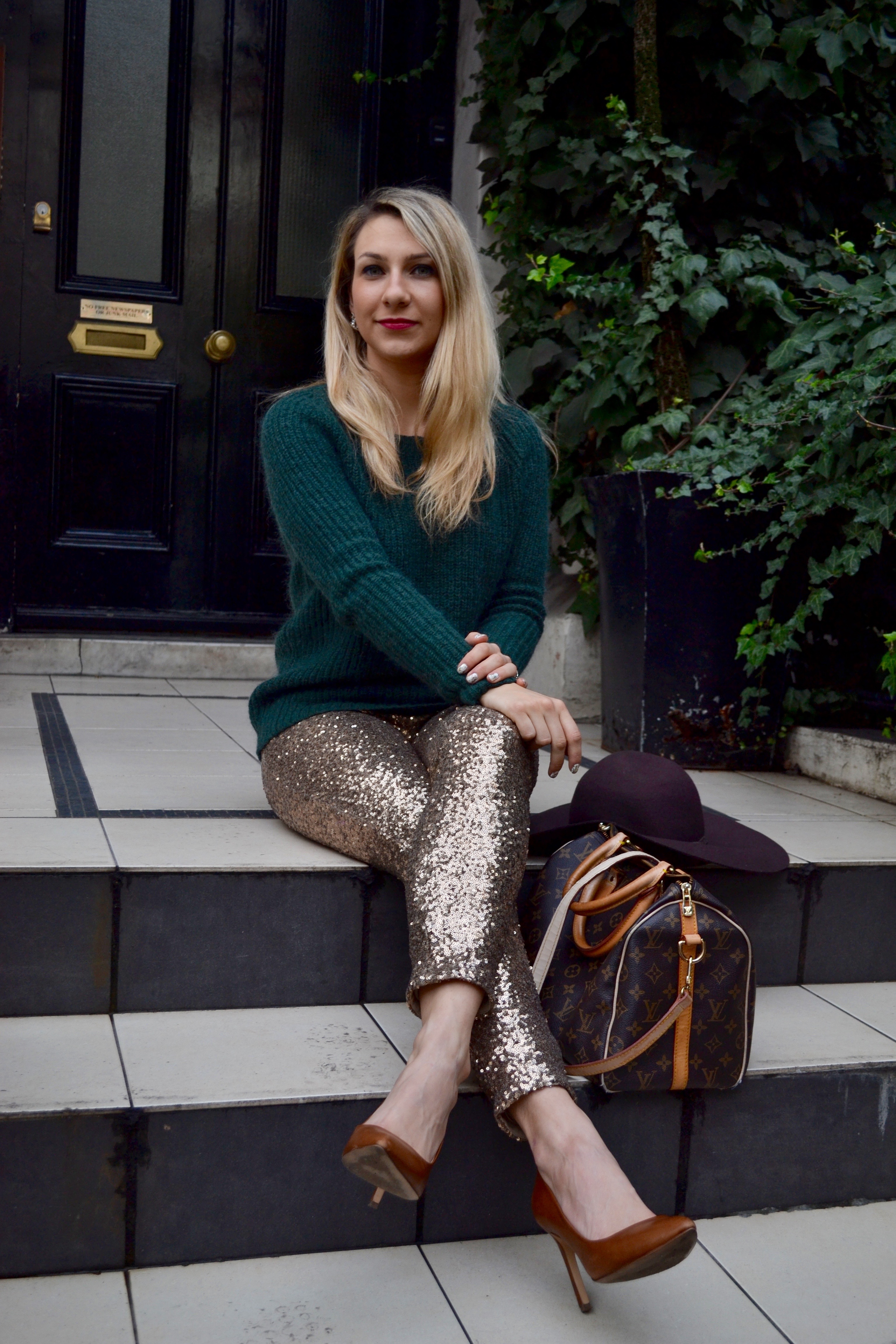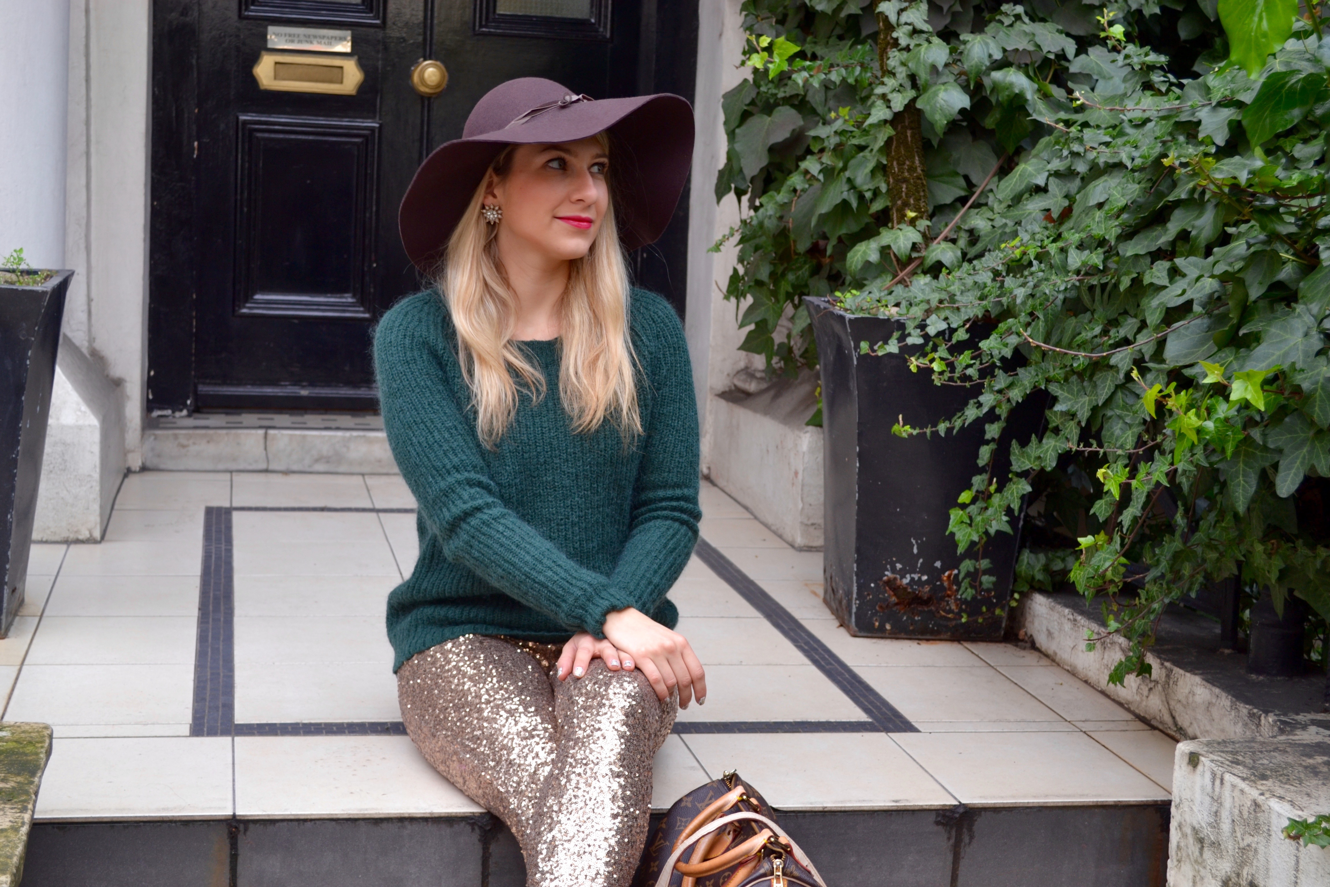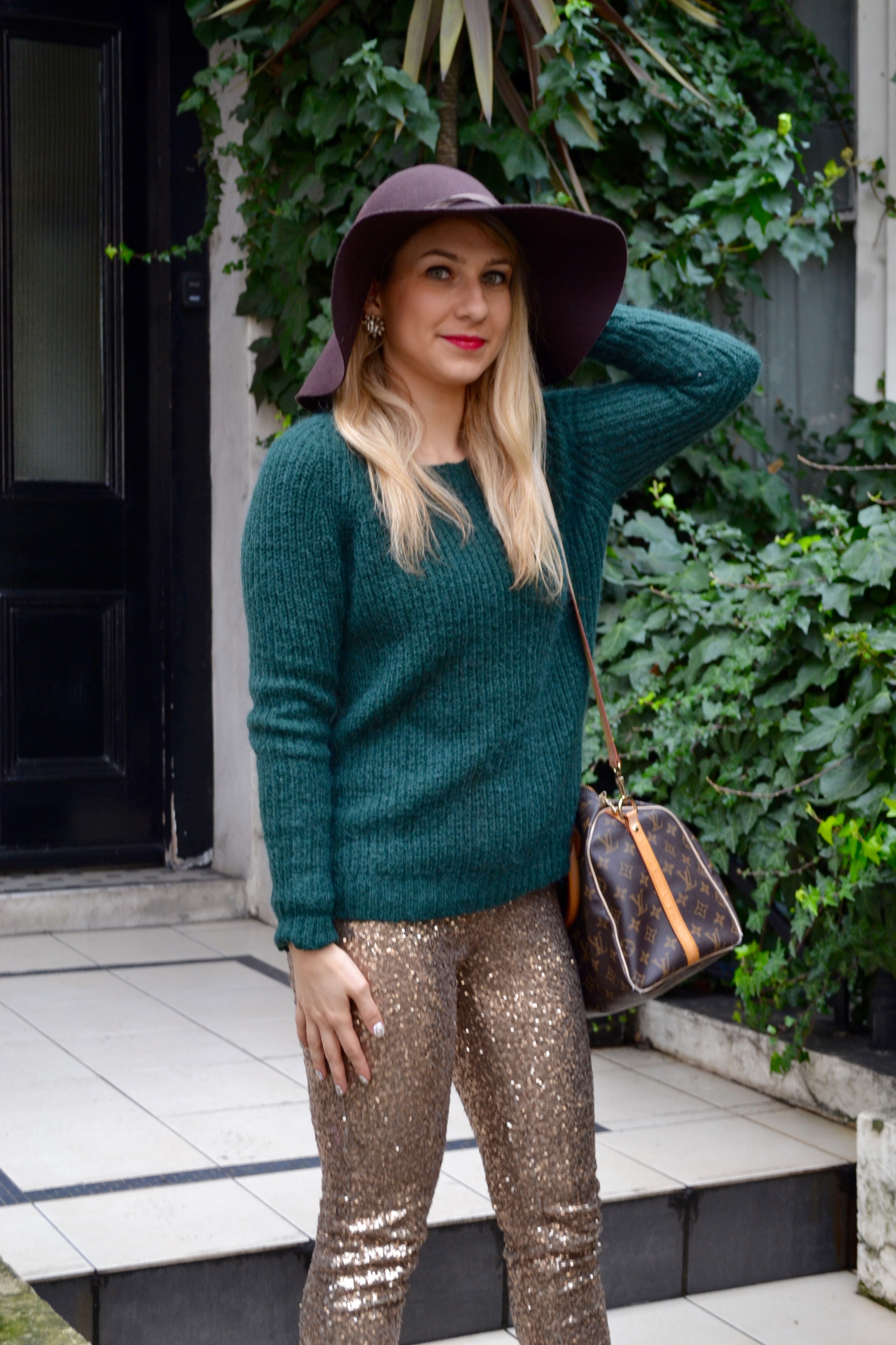 you can find similar sweater here and here. I didn’t want to wear the pants with black or red so I went with a brown/dark green look, with a brown hat, I use my hats a lot lately and it’s not because of the sun !! I find them very convenient for the London showers during my commute. So, pro/con wearing sequin pants after Christmas/NYE ?