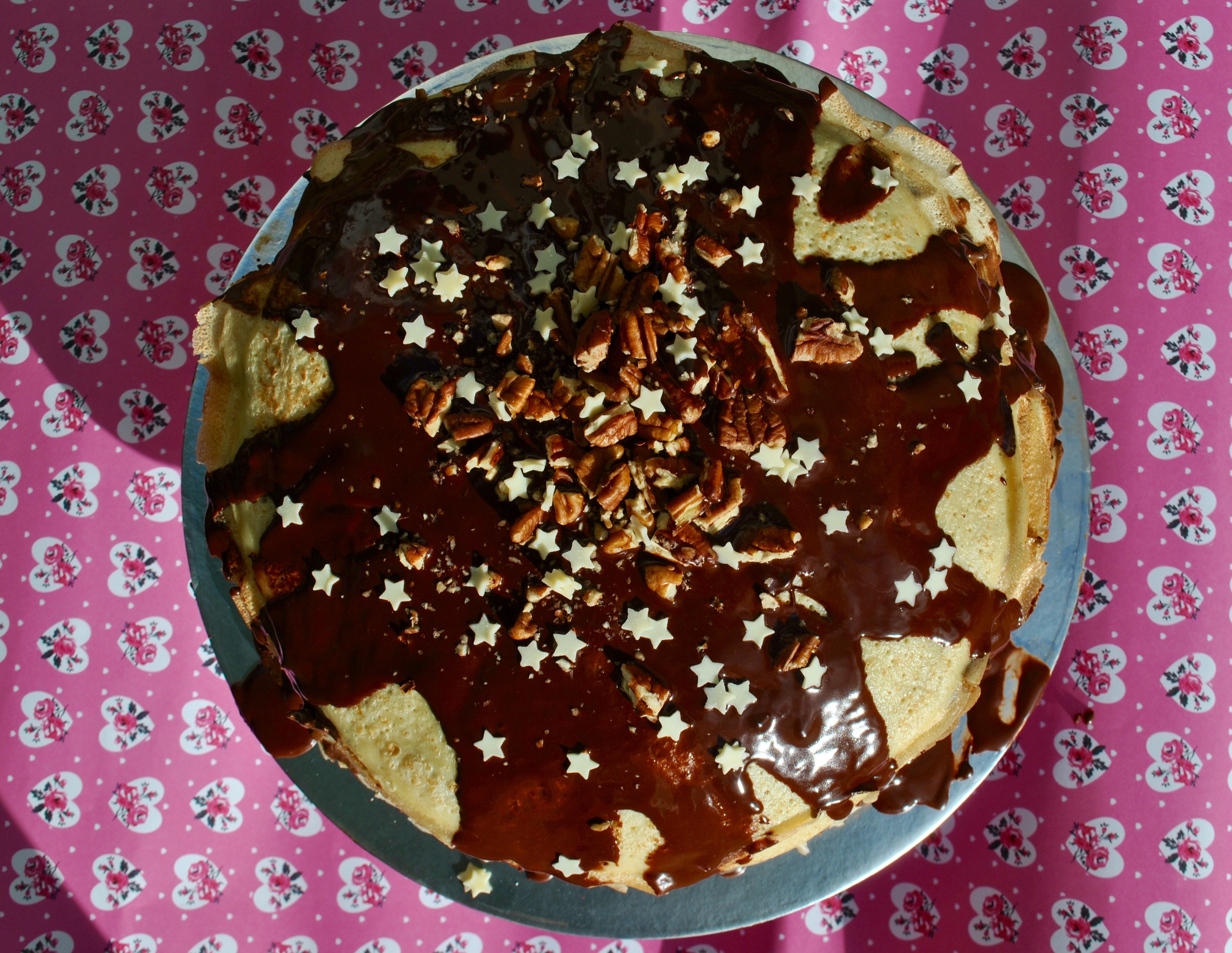 Étaler la mousse au chocolat, parsemer les pépites de caramel entre les crêpes et voilà ! Et pour les plus gourmands, un peu de chocolat fondue sur le dessus et quelques noix de pécan.