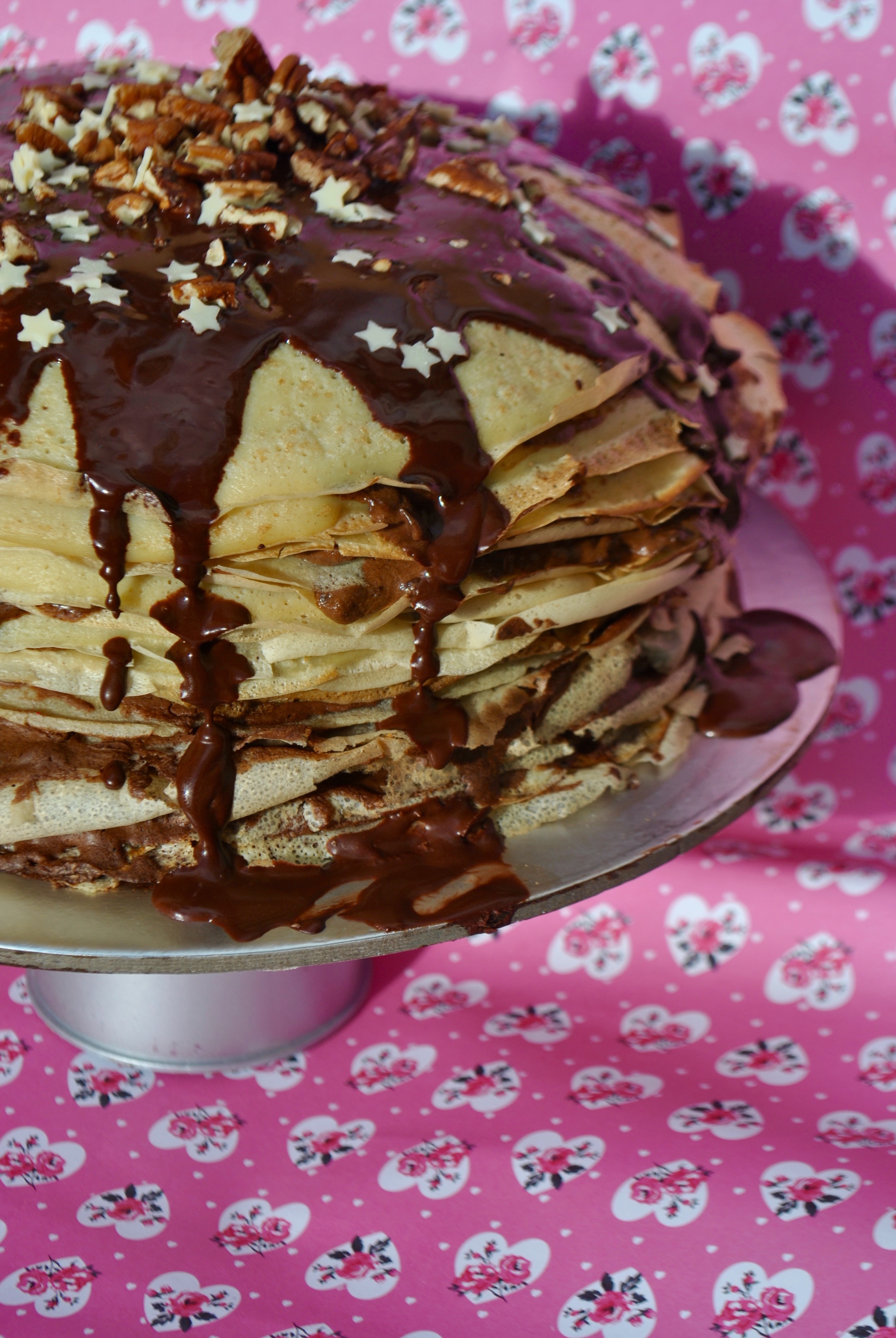 And them layer the crepe and the chocolate sauce, spread sprinkle some caramel bits, in between the layers and you are done !