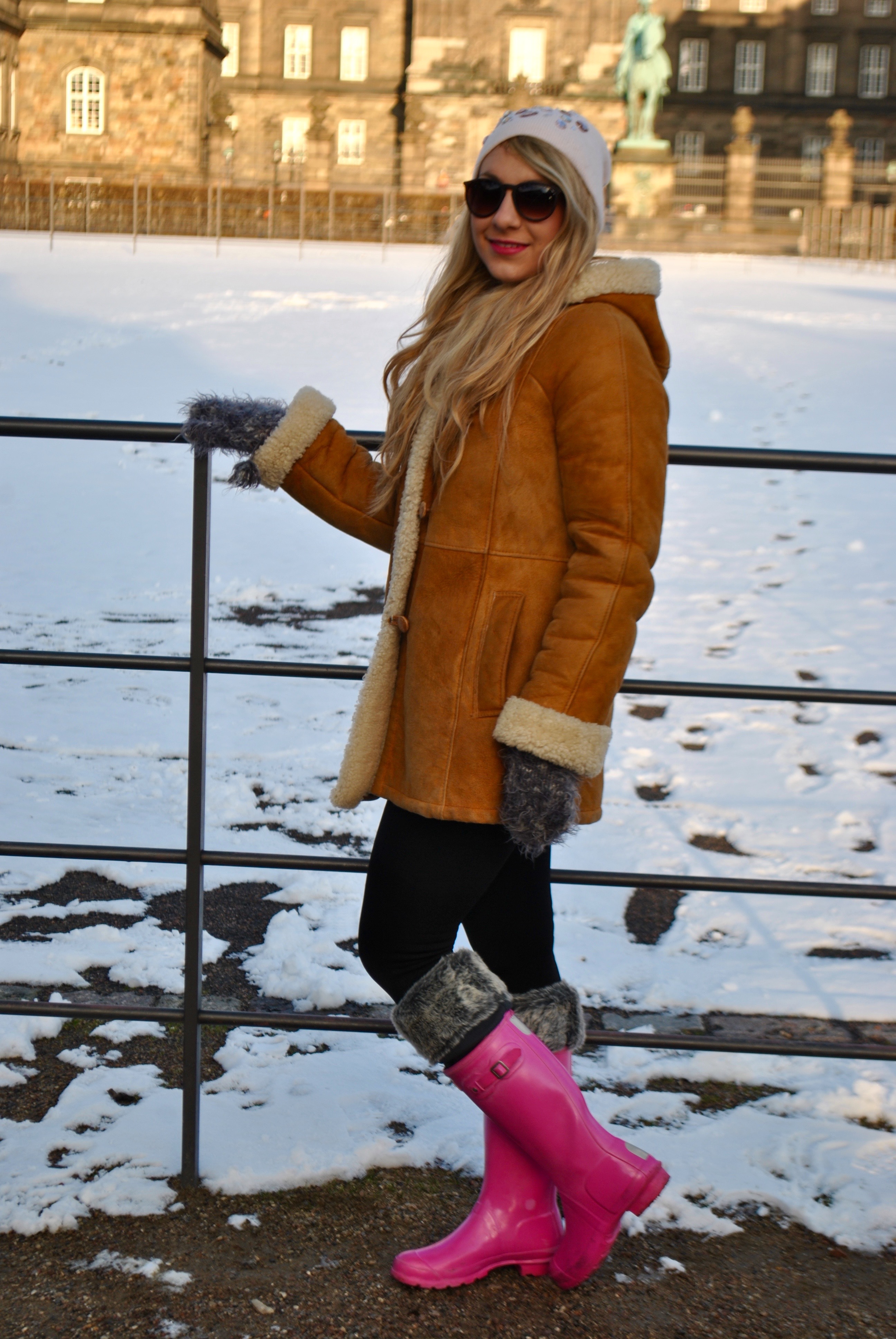 Pour ce qui est de mes tenues, EasyJet l’oblige, j’ai été plutôt restreinte. J’ai quand même amené mes bottes Hunter roses qui m’ont permis de sauter dans les petits tas de neige, et de ne pas me préoccuper du froid. Le manteau en peau retourné vient de Finlande, c’est un de mes manteaux les plus chaud. Pour ce qui est de la coiffure, je voyais les danoises avec de longues tresses blondes (vive les clichés) alors j’avais prévu de faire des tresses collées, bien pratiquent pour porter un bonnet.