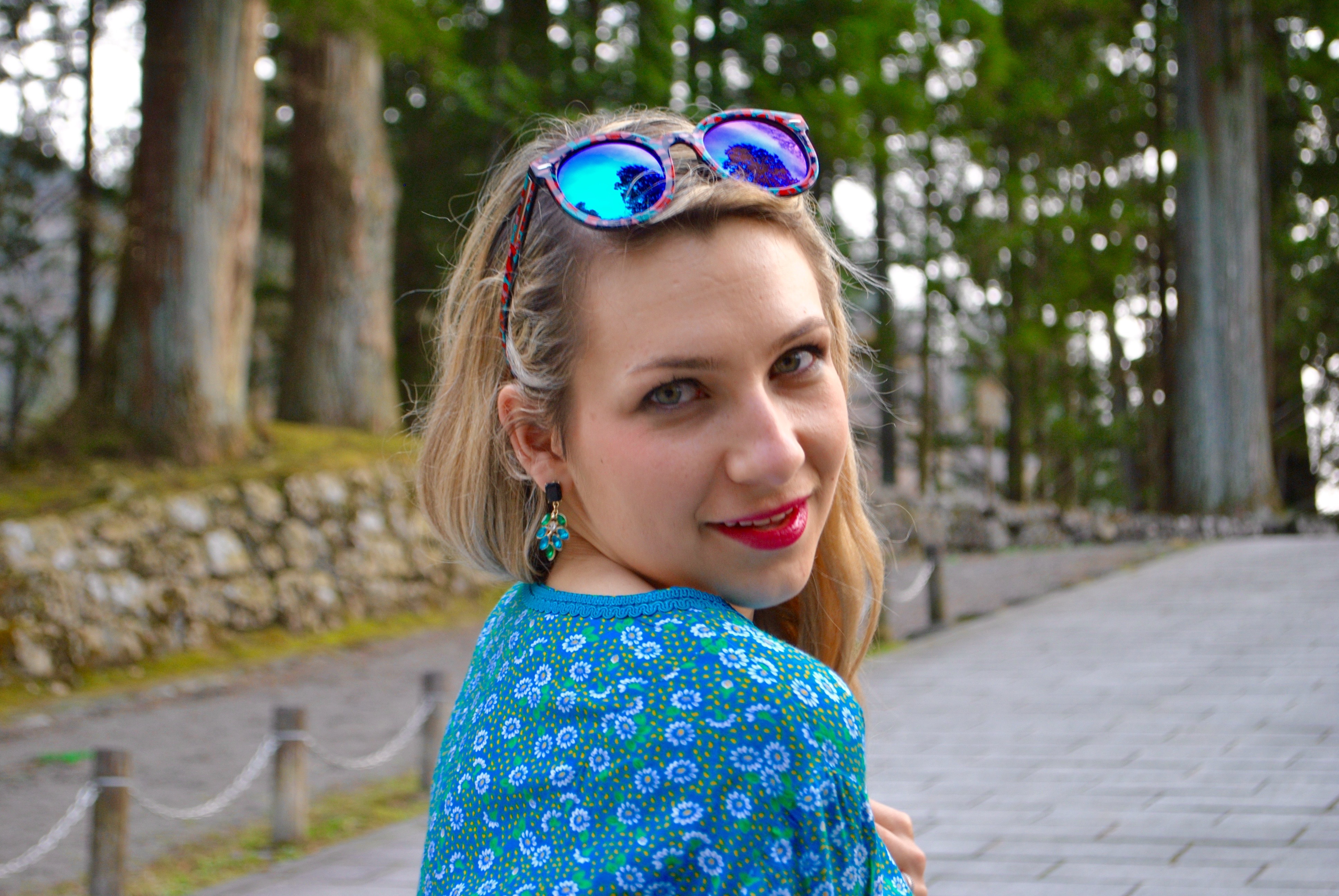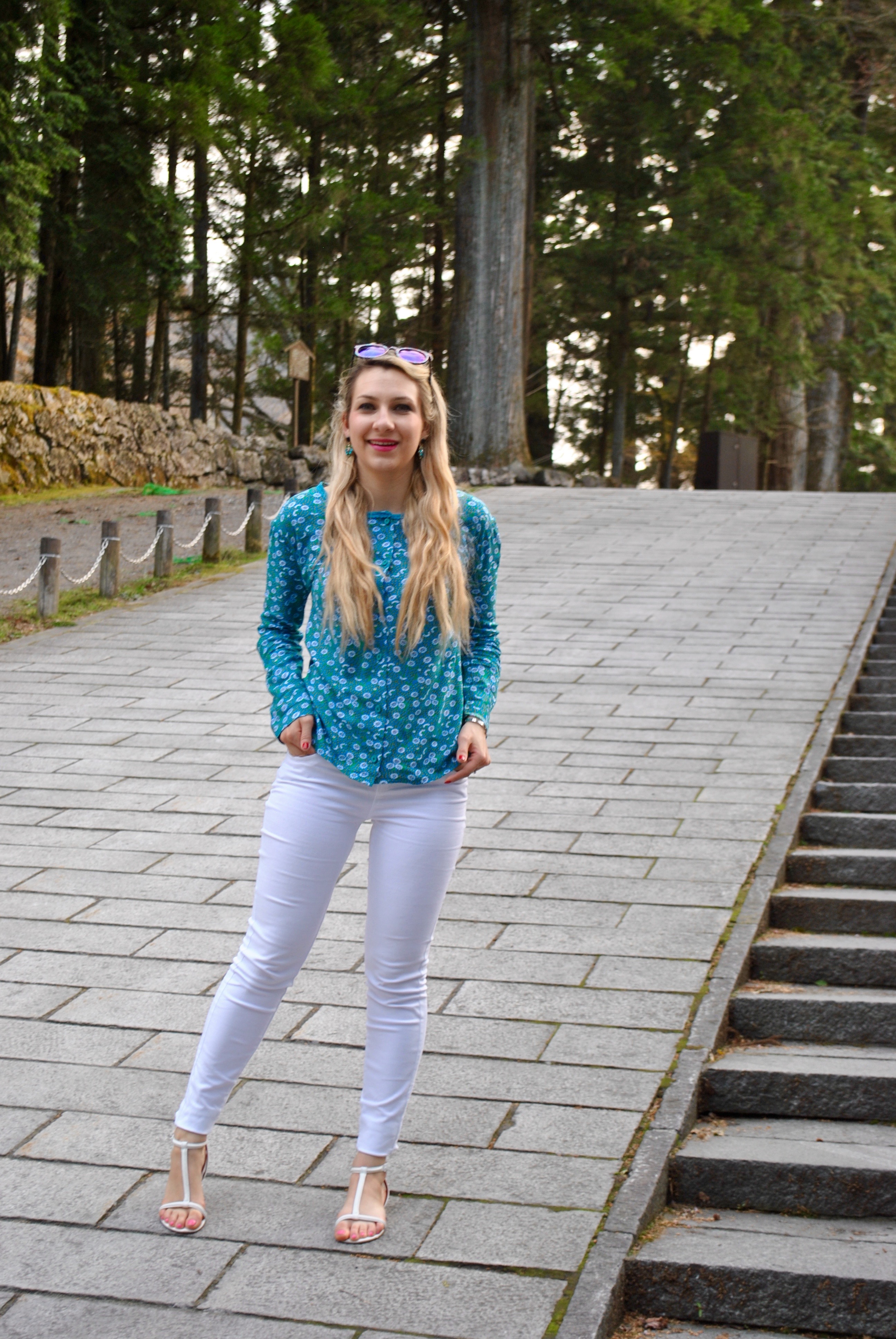 We went to walk in the park near the bridge, and I was kind of happy for it to be close because I could enjoy the bridge without tourists on it. We shooted my outfit of the day. As I knew Nikko was in the mountains, I worn a jeans with a blouse. The white jeans are a must have for Spring and I was happy to finally wear them. My top is thrifted it was really big for me but I love the print and the softness of the fabric. I downsized it and added the teal trim. It felt so great to wear my sandals.