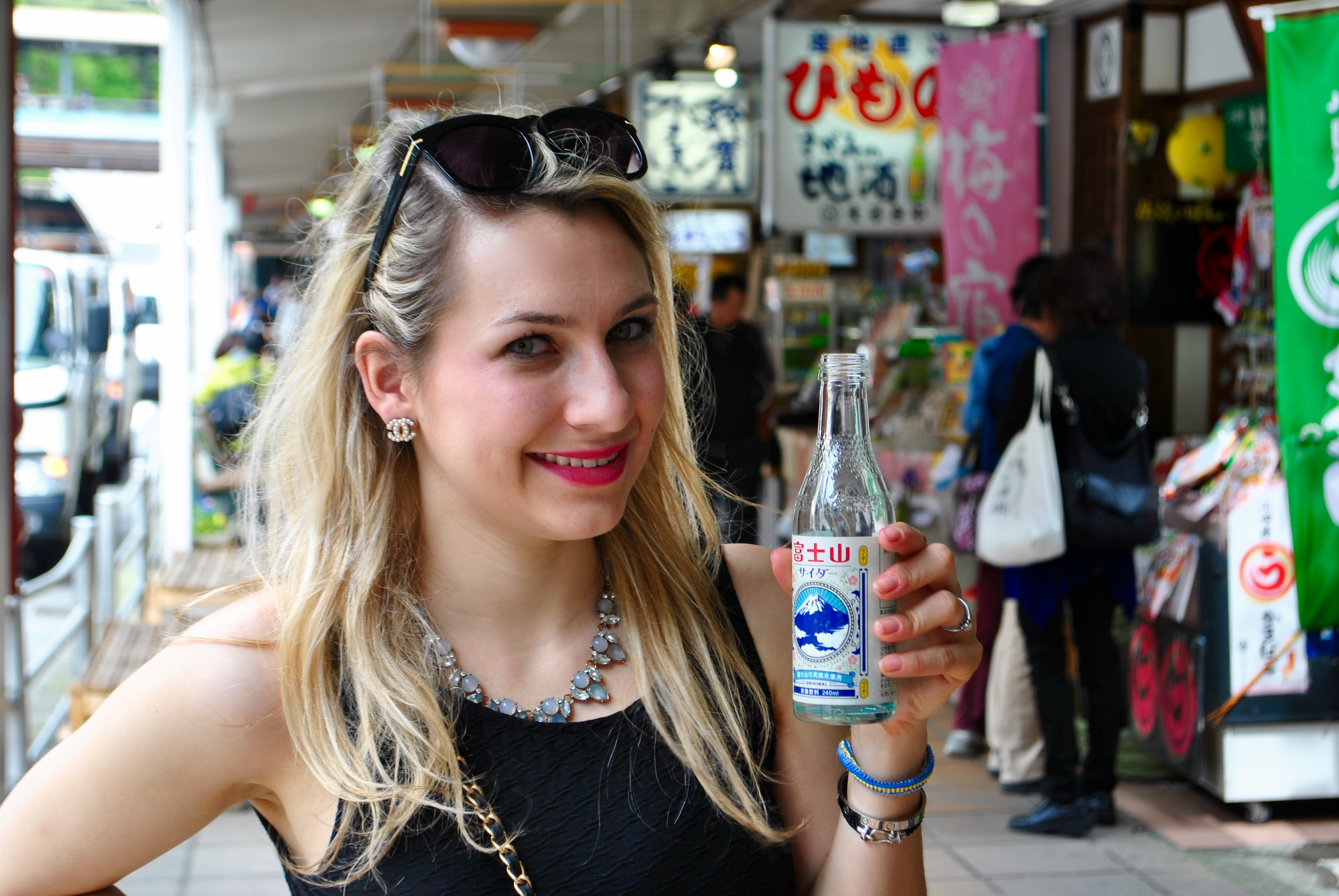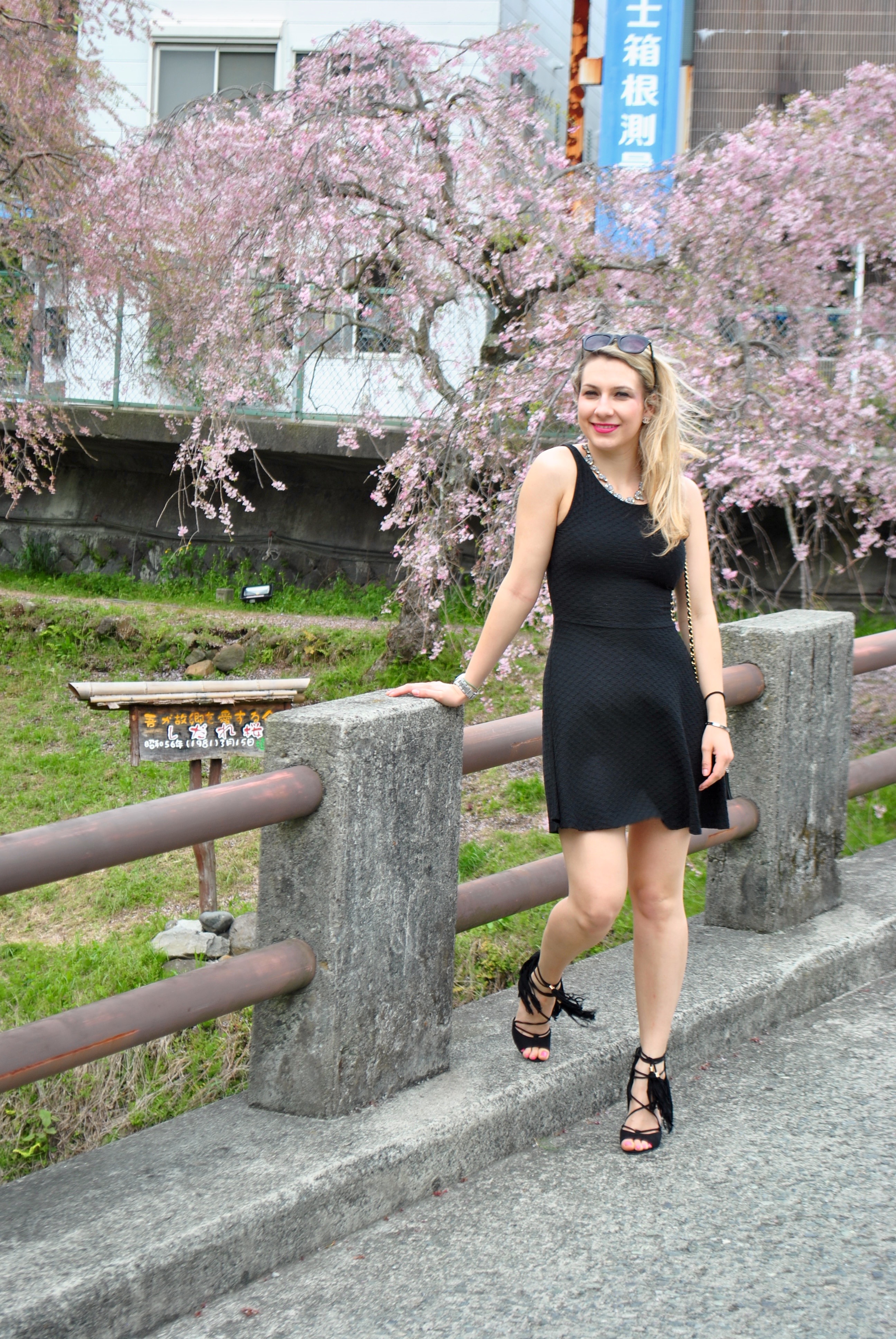 We went along the coast and stop twice during the day but our final destination was to go to Mount Fuji. This was during one of our stops in Oiso, it was a cute little harbor with a fish restaurant. We had a nice meal there, we also went across some cherry blossom trees and I had to take photos again. This was one of our first warm day and even if my legs were so pale, I was happy to put my little black dress again ! This dress has such a flattering cute, it’s a skater dress from H&M and even if it’s very simple I love it. We didn’t wear that at first when we left but as soon as we saw the sun we took our suitcases out of the trunk and put shorts, sunscreen and little dress on ! I worn my new tassel heels, I love tassels everywhere and these shoes are funny because I can feel the tassels moving when I walk.