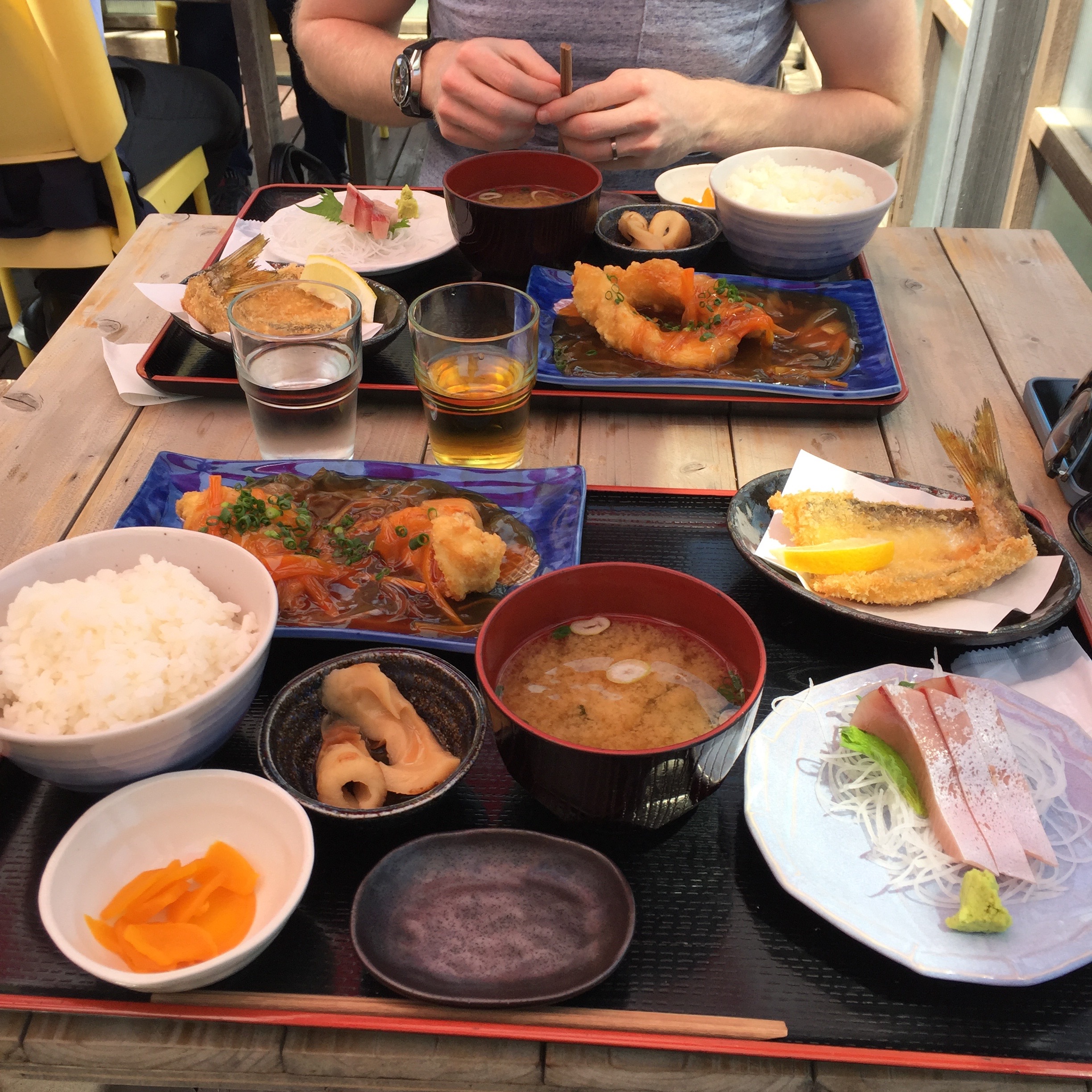 Nous avons longé la côte de la baie de Sagami où nous avons déjeuner dans un port, dans un tout petit restaurant qui servait du poisson bien frais et délicieux ! Il faisait beau et chaud et dès que nous avons vu les rayons de soleil nous sommes allés chercher shorts, crème solaire et petite robe dans le coffre. Il y avait aussi de beaux cerisiers sur notre route et il a fallu bien sur s’arrêter pour en profiter une fois encore !