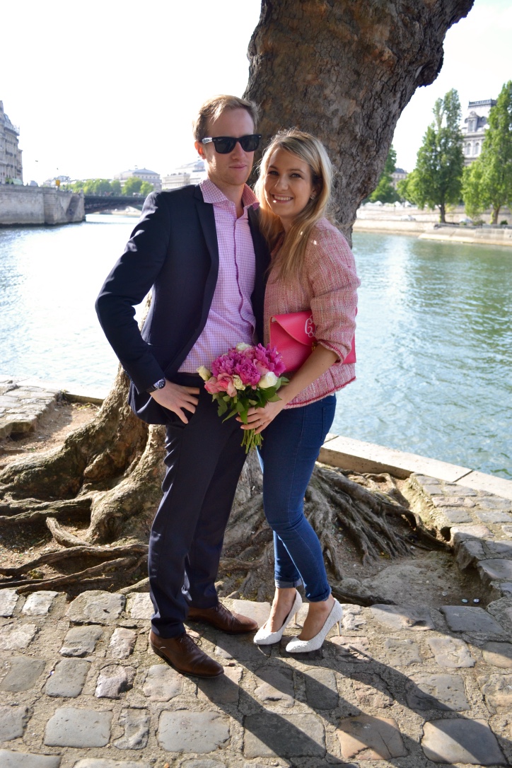 So I took my fiancé, my sister as a photographer and 2 years after we went back to the place where he proposed. I bought him a blue Opinel knife when he went of a charity trip to Morocco. He drove there with this best friend in a really vintage car to bring supplies to children in the Moroccan desert. So before he left I gave him the knife and some smoke ham that my dad had smoked himself so he could « survived ». After buying it for him,I bought myself a pink one because why not having a knife in your car or purse, it can always be useful. Those knives are so French, they are still made in Savoie France and I love old French brand with history like Opinel. I bought them in a small shop in Paris and the guy explained the story behind the brand and I loved it. So I wanted us to use those knives for the engraving. Two French in Paris, with French knives saying their goodbye to their parisian life before heading to London. On some photo you can spot him engagement watch. I bought it to him after he gave me the ring, so both of us had something to remember our engagement.