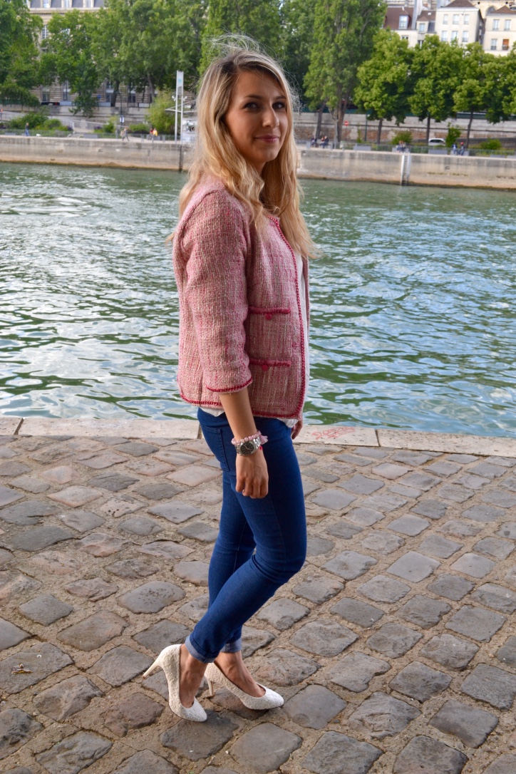 As this was last summer I was really into sewing and I had finished my suit for the civil wedding. It you want to have a look, the photos are here. And I trained myself to do the pattern again on this pink jacket. I love tweet jackets, they always look nice with a formal skirt or a simple jean and white tee for the weekend.