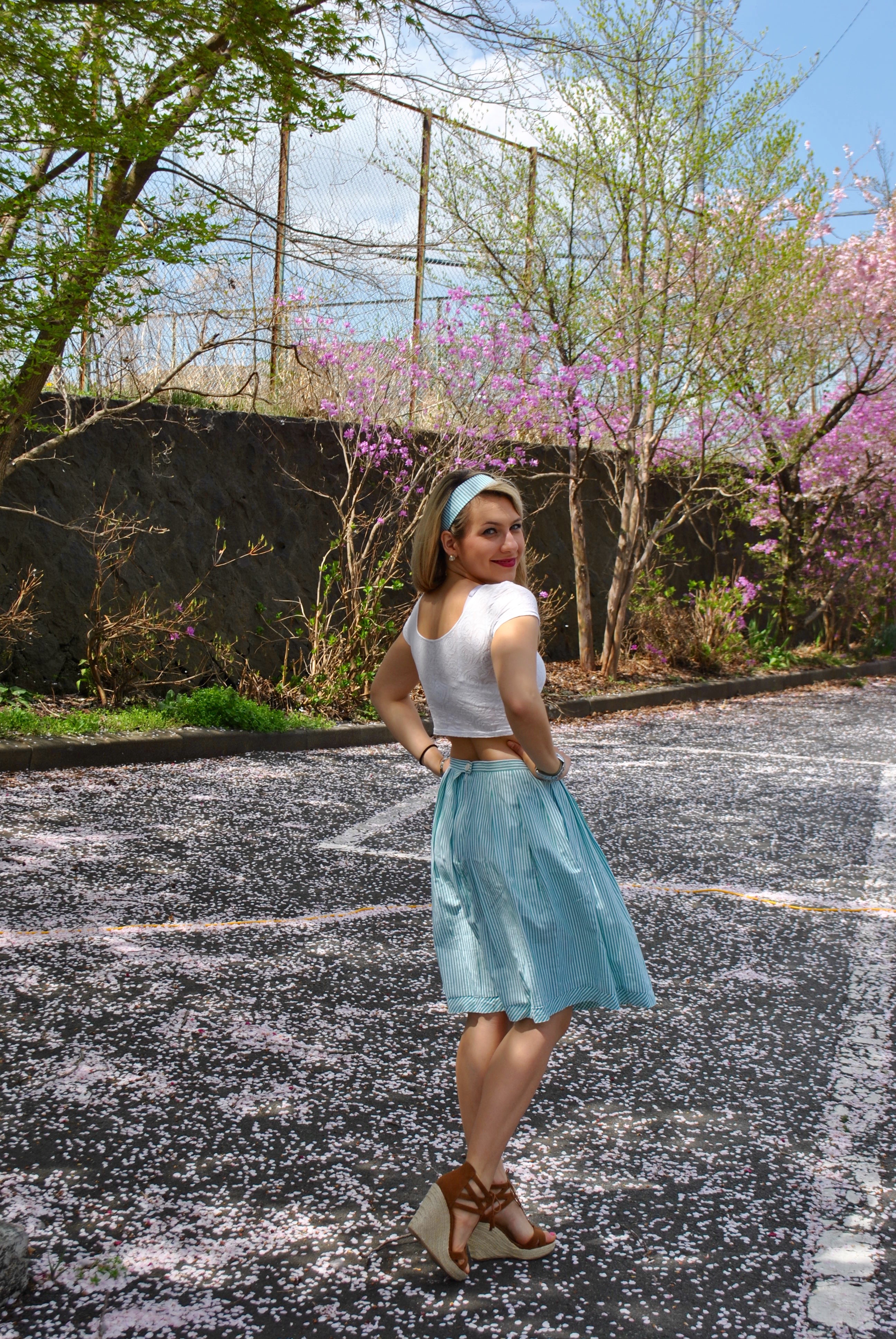 Cela fait déjà quelque temps que je vous parle de ce fameux monsieur Fuji que nous avions tant hâte de rencontrer, on s’en rapproche de plus en plus à chaque fois ! Après une nuit au Ryokan, nous avons pris la route direction le volcan le plus connu du Japon. Et ce matin là il pleuvait des pétales de cerisiers ! Le rêve qui devenait réalité ! Il faisait bon, doux, et j’en ai profiter pour porter une tenue à la fois vintage et moderne. La jupe qui tourne appartenait à la tante Edith de monsieur, malheureusement elle était trop longue et très large, avec l’aide des petites mains de ma grand-mère nous l’avons cintrée et raccourcie, mais j’ai voulu garder un peu de longueur car les jupes midis reviennent à la mode. D’ailleurs ma copine bloggeuse Estelle, a présenté de jolies jupes midis dans un de ces articles ici. Avec le bas de la jupe, j’ai fait un bandeau pour les cheveux ( qui peut aussi servir de ceinture aussi).