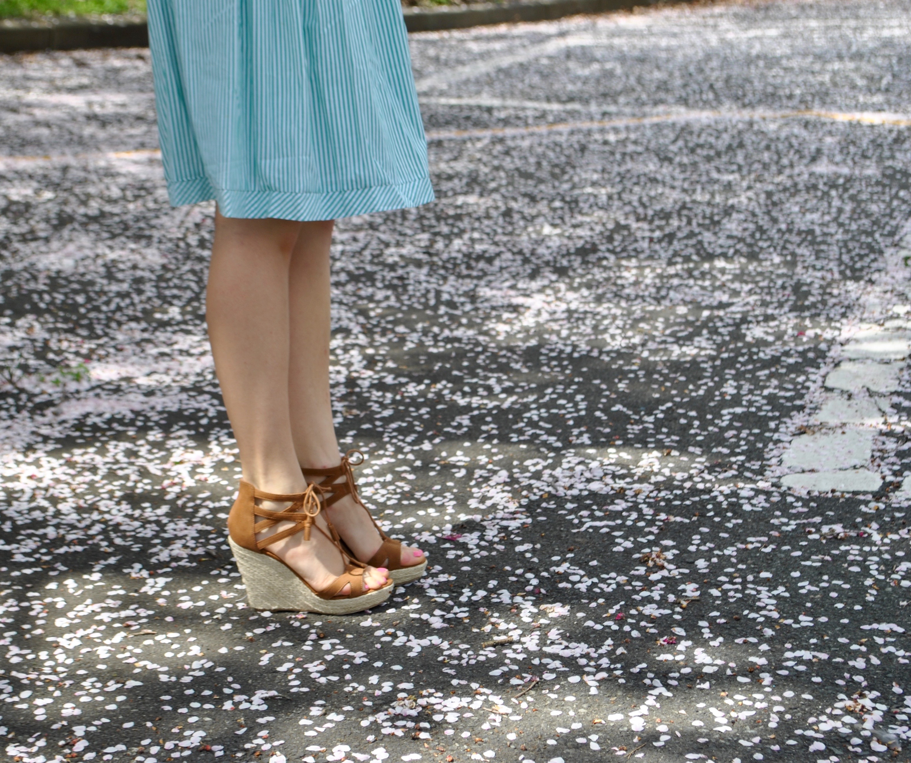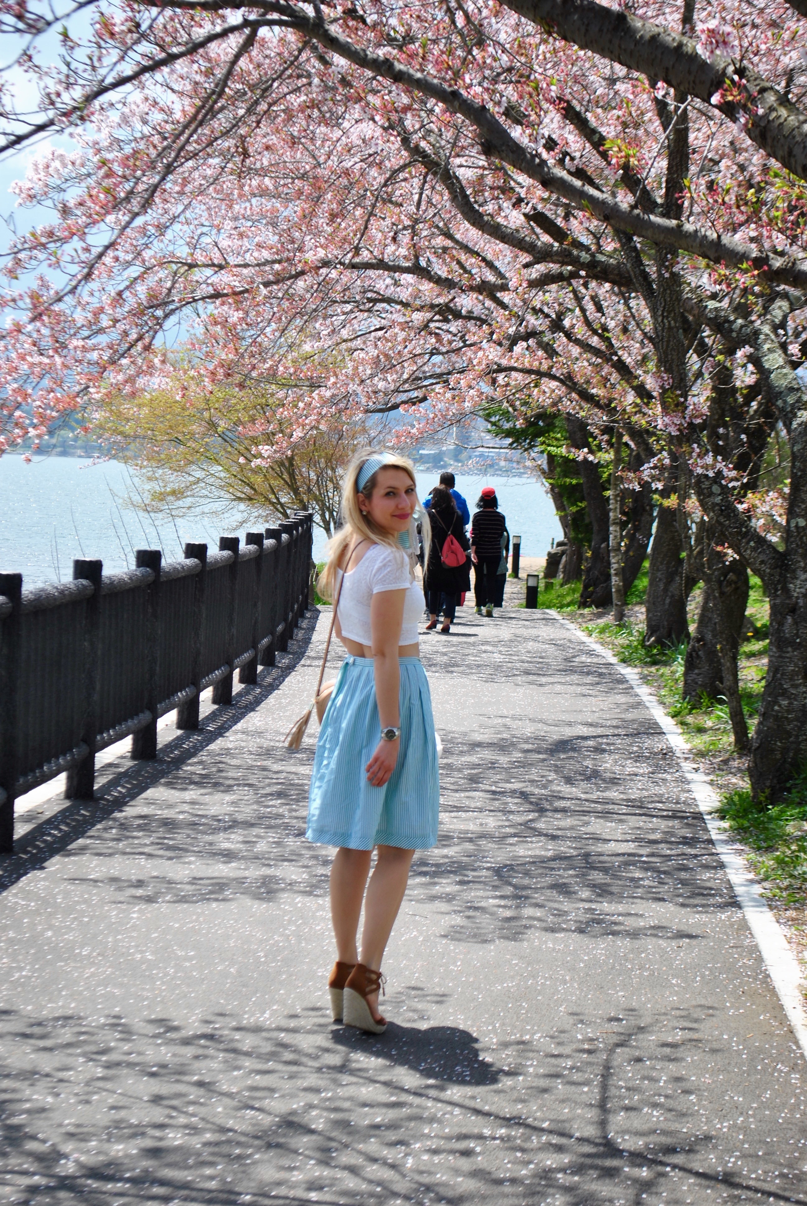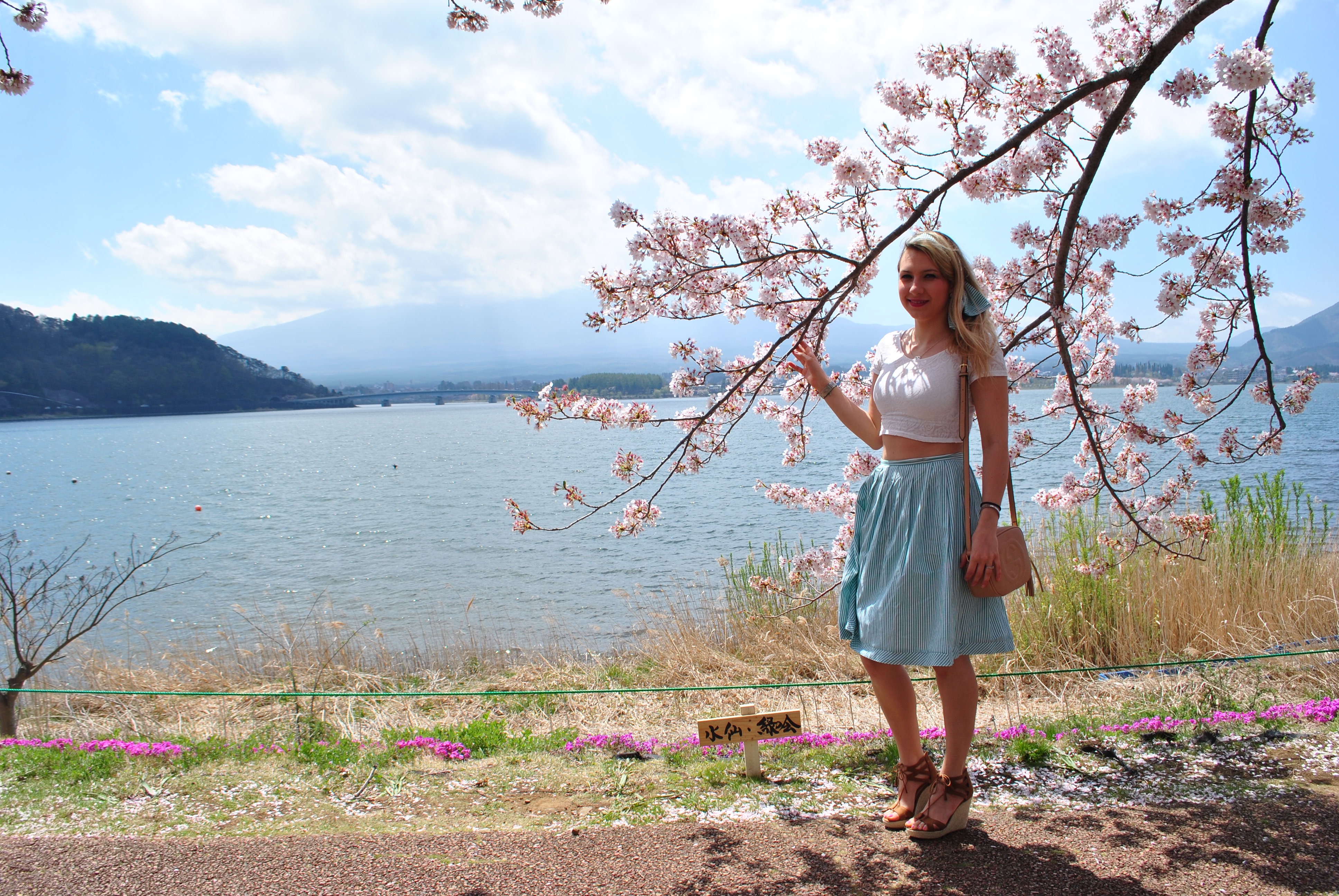 I’ve been talking about Fuji San for a while and I guess you were excited to meet him ! After our night at the Ryokan, we drove to the most famous Japanese volcano. We had sun and a little wind that day and it made the cherry trees lose their petals, it was such a magical feeling, like a petal rain. I worn a midi skirt that I got from my husband’s aunt, « tante Edith ». The skirt was too big and too long for me so I cut and adjusted it with my grandma. I used the bottom of the skirt as a headband, but it can also be used as a belt. Midi skirt and cropped top are so trendy right now, it’s a trend I usually like on others but not so sure on me. I found the cropped top at Forever21 and I felt quite old compare to 13 years olds girls buying this kind of shirts. As I might be too old for it, I decided not to show my belly button, it made the shirt more acceptable for a 25 years old !