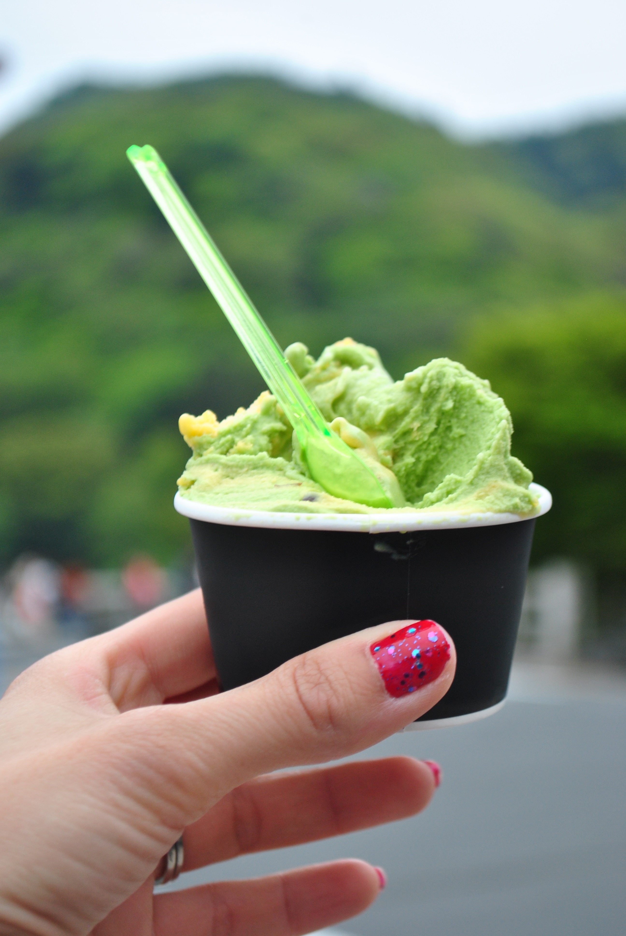 On se retrouve aujourd’hui pour le dernier épisode de notre voyage au Japon. Je suis un peu triste d’avoir fini ces articles sur ce voyage, mais j’ai aussi tant de choses à partager sur tout ce que nous avons fait depuis Avril ! Pour le mot de la fin, je vous amène dans une forêt de bambou à Kyoto. Nous avons visité cette forêt en fin d’aprèm midi et l’ambiance était zen, hyper relaxante. Beaucoup de jeunes filles portaient leur yukata, et je n’ai pas pu m’empêcher de porter le mien ( et cette fois ci un vrai yukata, pour ceux qui ont raté l’anecdote, c’est ici). Chaque fille porte son yukata coloré avec un noeud différent, j’ai beaucoup apprécié les regarder marcher et observer leurs manières. C’était un défilé de mode en pleine nature, dans un cadre magnifique. Le vent dans ces grands bambous imposants rendent l’ambiance particulière et nous n’avions pas envie de parler, juste d’écouter la nature. Je vous conseille cette attraction à Kyoto, biensûr il y a des touristes mais en fin d’après midi nous étions plutôt tranquilles. Après notre marche dans les bambous, nous avons pris une petite glace au thé vert matcha, grande spécialité japonaise. Malheureusement ils n’ont pas pu s’empêcher de mettre quelques pièges: des haricots rouges azukis étaient cachés dans la glace.