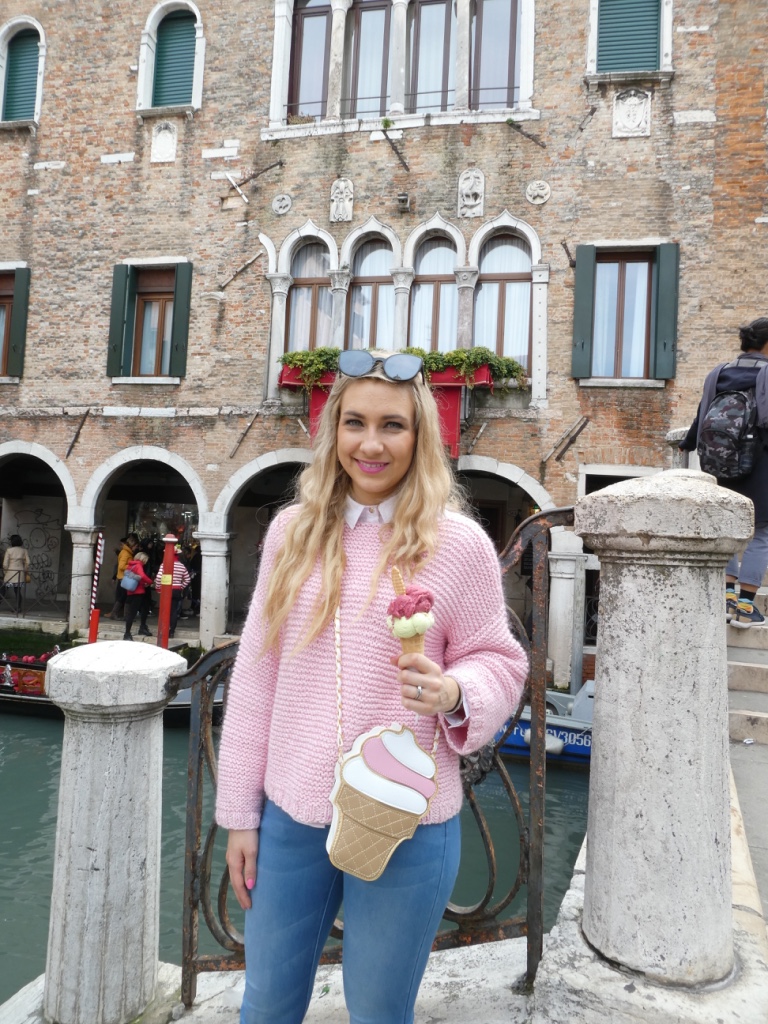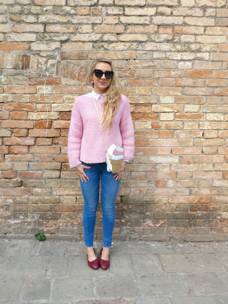 J’avais prévu de manger des bonnes glaces italiennes pour ce weekend, comme vous pouvez le voir avec ce sac à main et le pull barbe à papa !