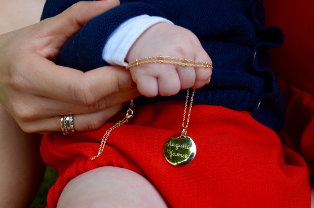 I picked a golden disc with Augustin James and his birth date on the back, with a golden beaded necklace. I’m so happy with the result and can’t stop looking at it, with his tiny hand on my chest when I’m nursing him.