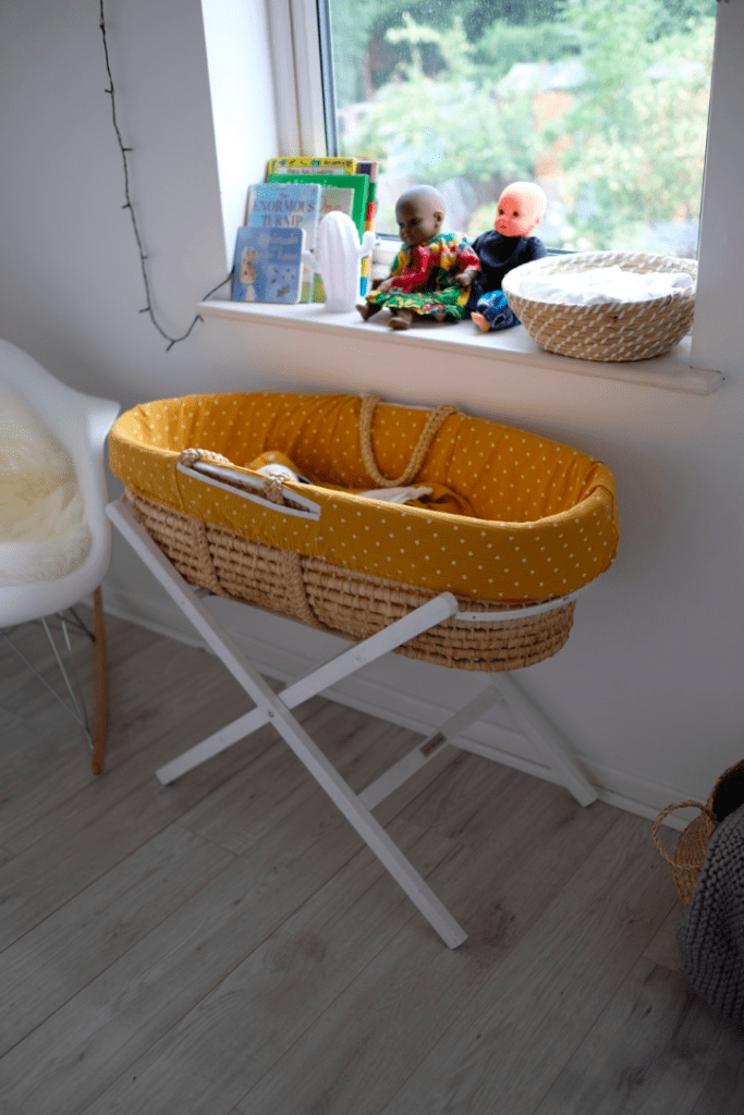The changing basket is also handmade, I cut a moise basket that I found in the street and covered the bottom with a towel that we can change if needed.