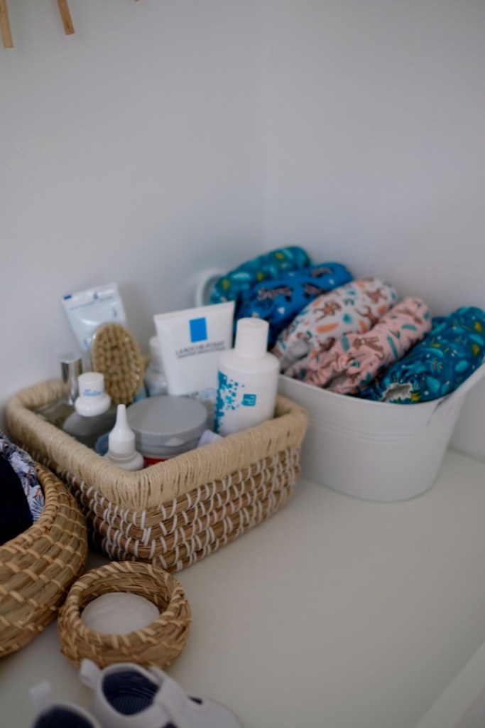 Les boutons de porte et le miroir en bambou viennent de chez Zara home et les panières diverses viennent de Homesense. Sur notre table à langer nous avons les couches lavables Bambino Mio que nous aimons utiliser depuis quelques mois déjà. Il y a aussi des lingettes lavables que j’ai faites avec les chutes de tissu éponge, la poubelle en fer blanc nous serre pour le linge souillé, je met quelques gouttes d’huile essentielle de Tea Tree dedans entre les machines.